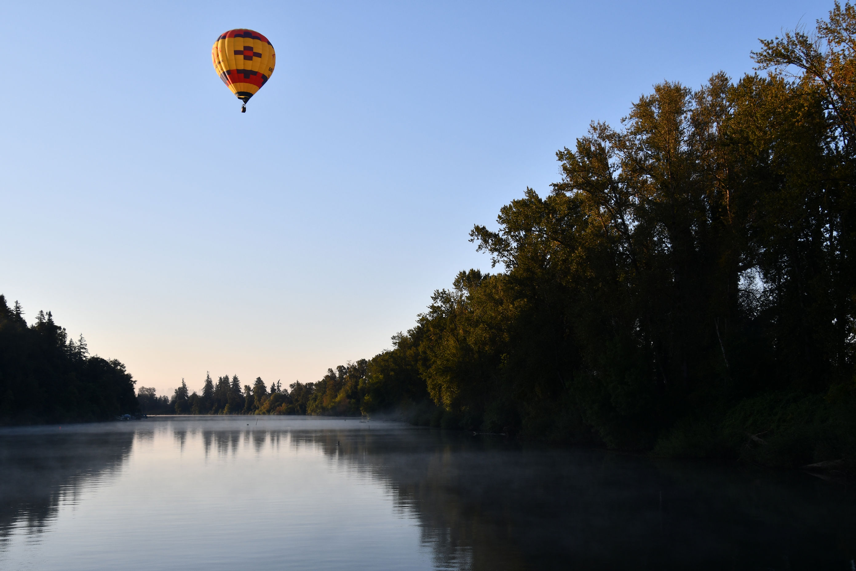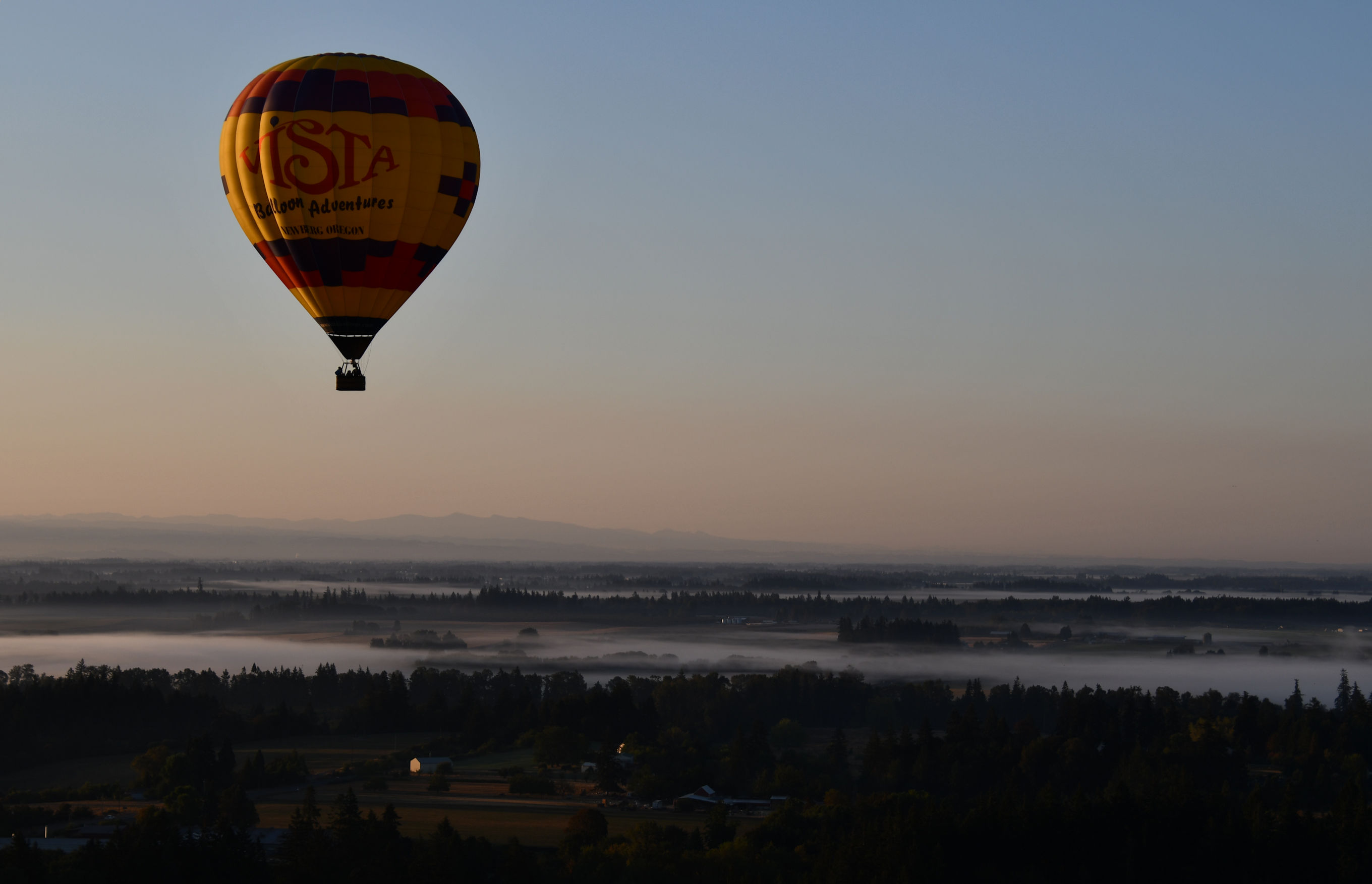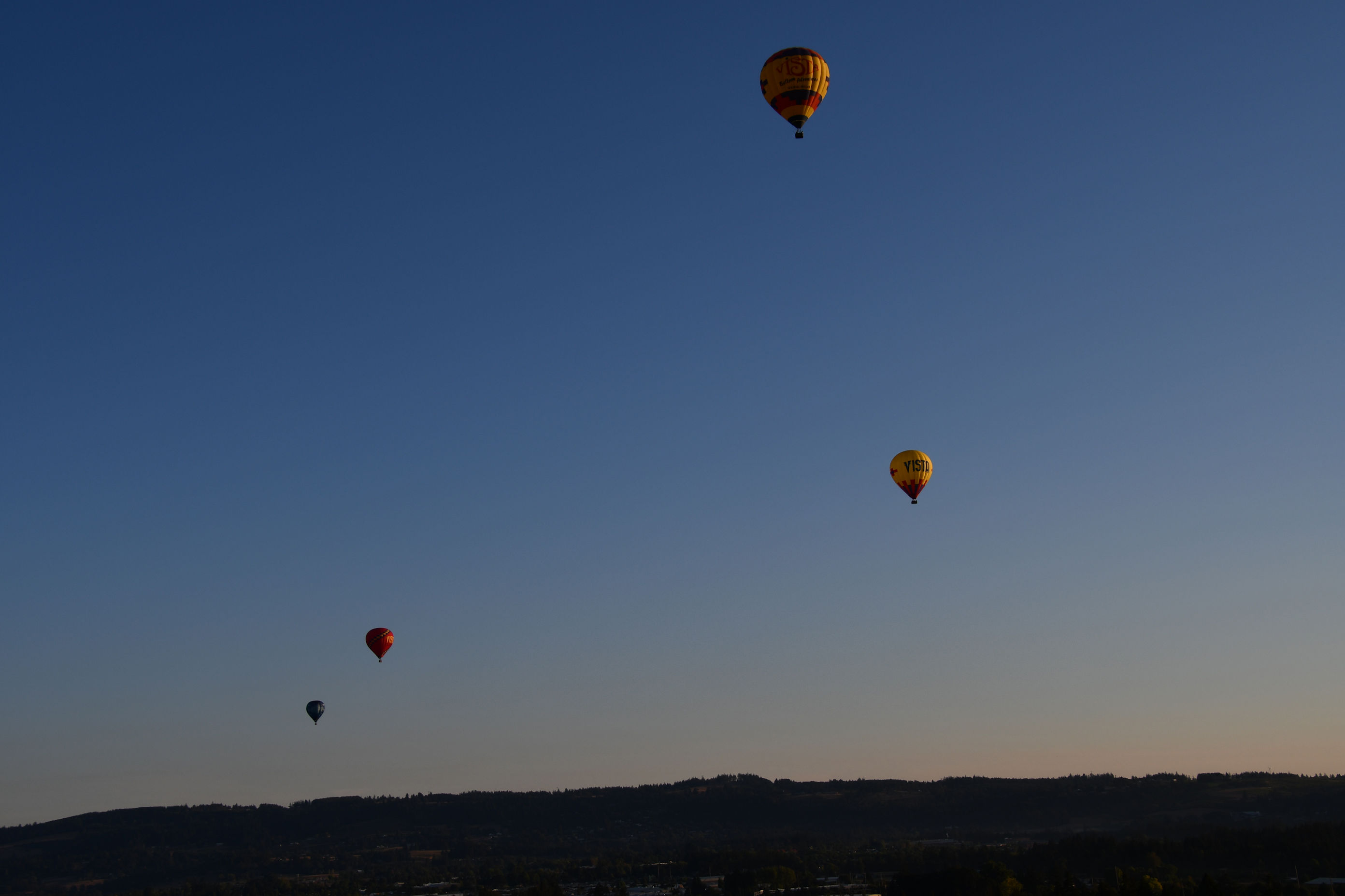 The pilots at Vista Balloon do this neat trick where they set the basket onto the surface of the Willamette River. That’s what is going on in the photo with me and Kellen above. What’s really happening is that the pilots are carefully keeping the balloon basket at the exact level of the surface of the water, because it certainly does not float. Our pilot kept us on the river a long time, waiting for the other balloons to arrive so we could see what it looks like, but they were not able to join us. The one in the photo above couldn’t catch the wind right and finally had to give up and move on.