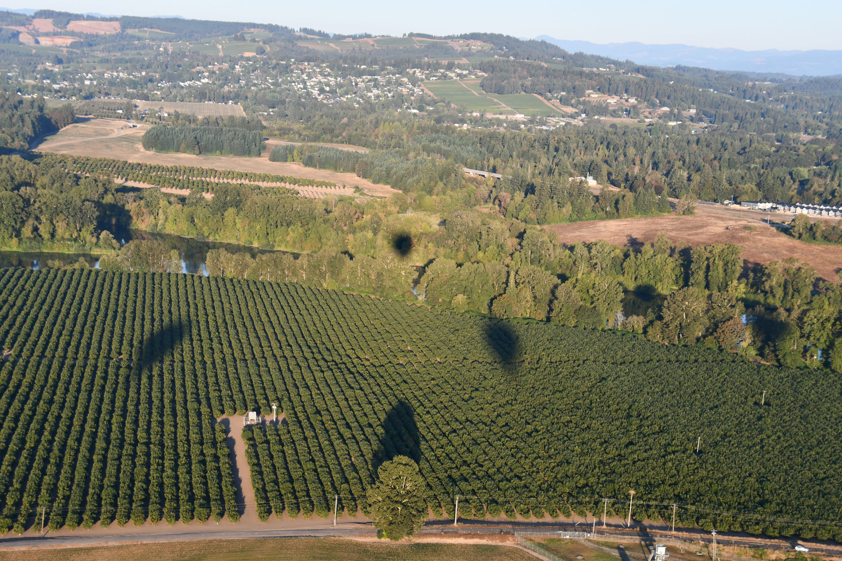 Our shadows over a Hazelnut grove. Hazelnuts are a major Oregon export.