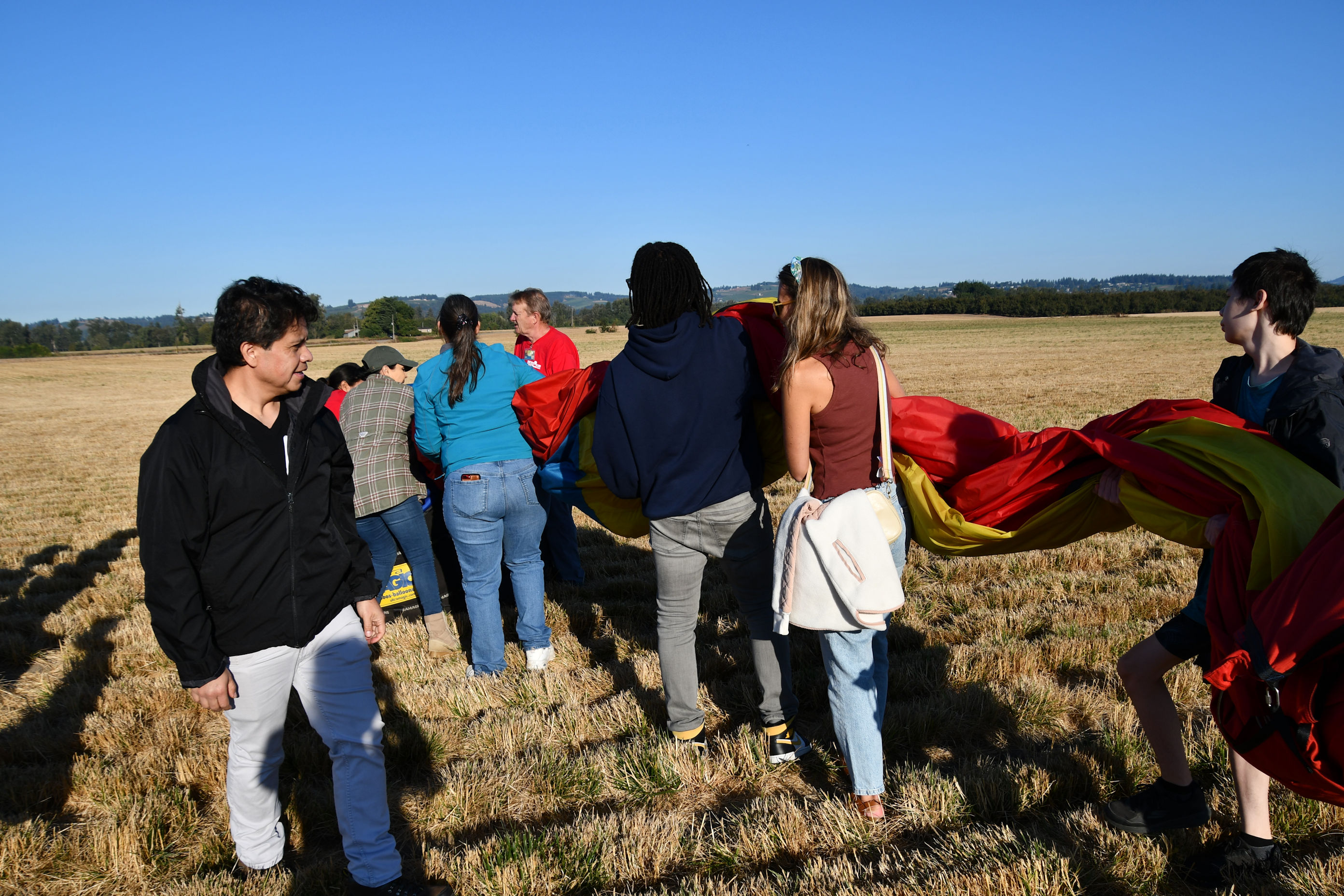 After landing, Vista crewmembers from the vans grabbed the sides of the basket to keep it on the ground while the pilot opened the vent all the way and began deflating the balloon. After a while, we were invited to climb out, but asked to hold on to the basket still, so it didn’t lift now that it was lighter. The bigger guys were asked to hold down the corner away from the wind. A little while later, the balloon was lying on the ground, about half full of air. The basket was disconnected. Next we all had to pitch in to deflate and pack up the balloon.
