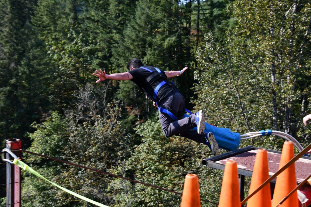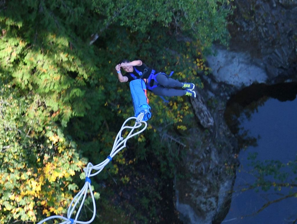 I kept my eyes tightly shut the entire time and didn’t open them again until I had stopped bouncing. After I jumped, they switched bungee cords, then everyone else jumped. With adrenalin pumping, we then all went out for breakfast. After breakfast, two hours after my jump, my hands were STILL shaking. I told myself, “Well, I did it. I never have to do it again.”