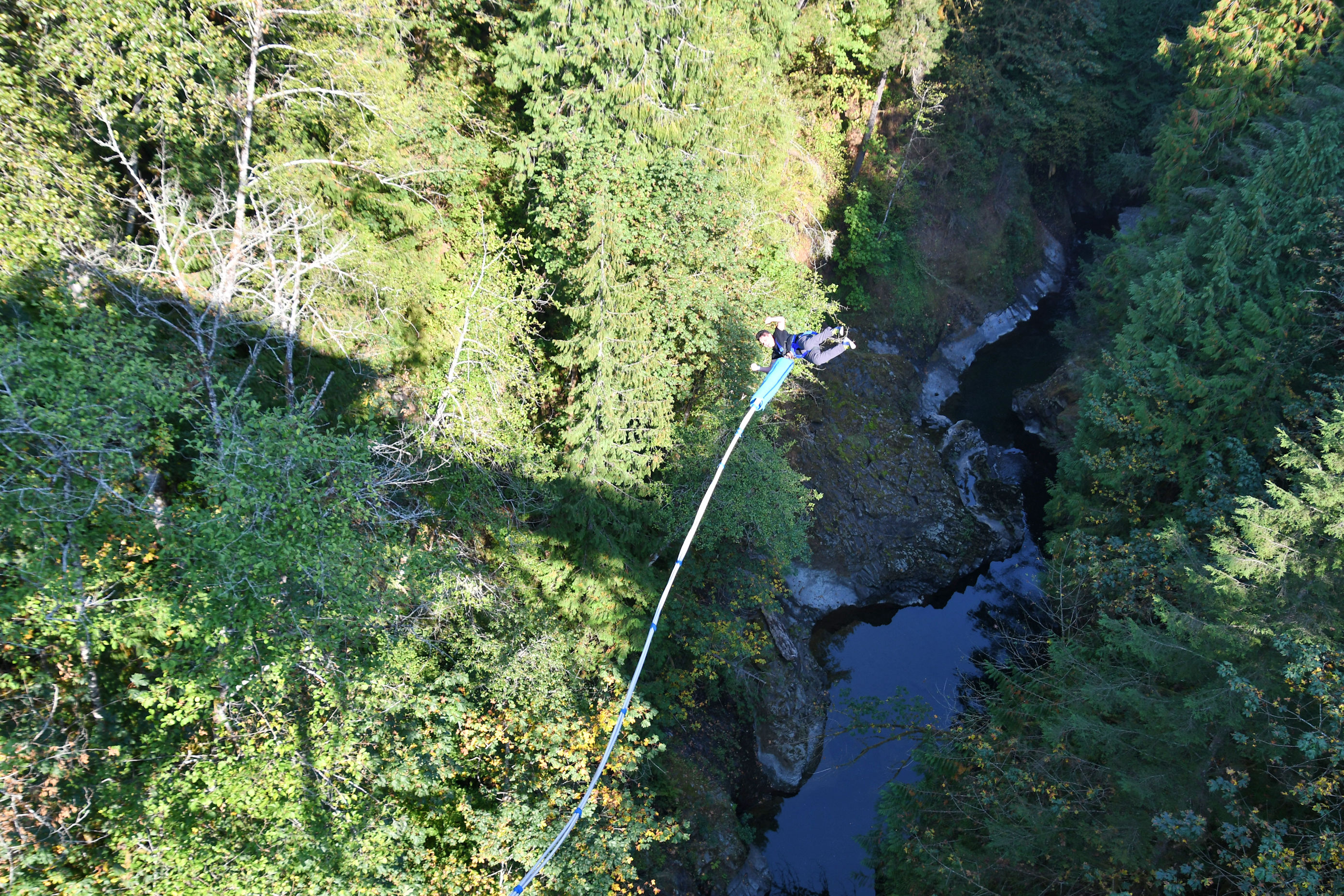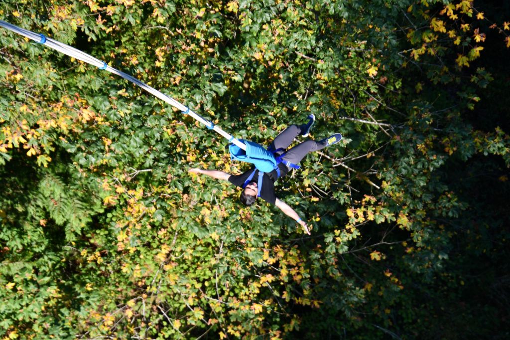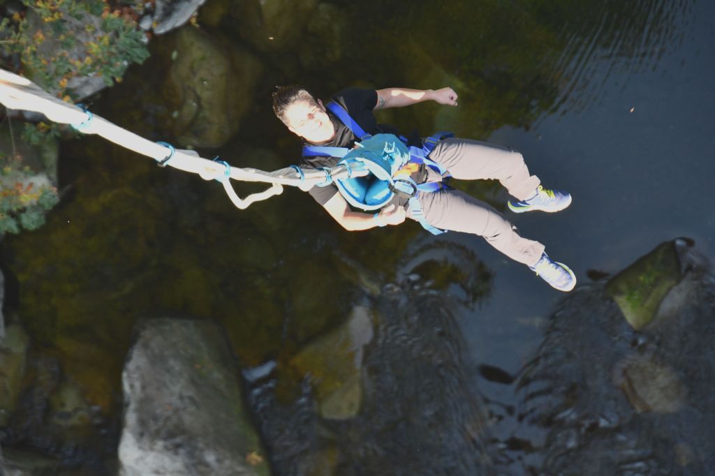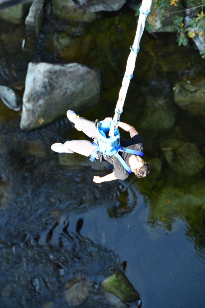 Since Pedro had jumped before, he was allowed to do a more advanced jump. The one you see above, where he ran and leapt off a ramp. The bungee cord is attached on the other side of the bridge, so when he jumped, he swung beneath the bridge, and bounced on the other side. When he leapt, I took the photos, then ran across the bridge and looked over the edge to see him appear. Just like Pooh and Piglet did with the sticks.
