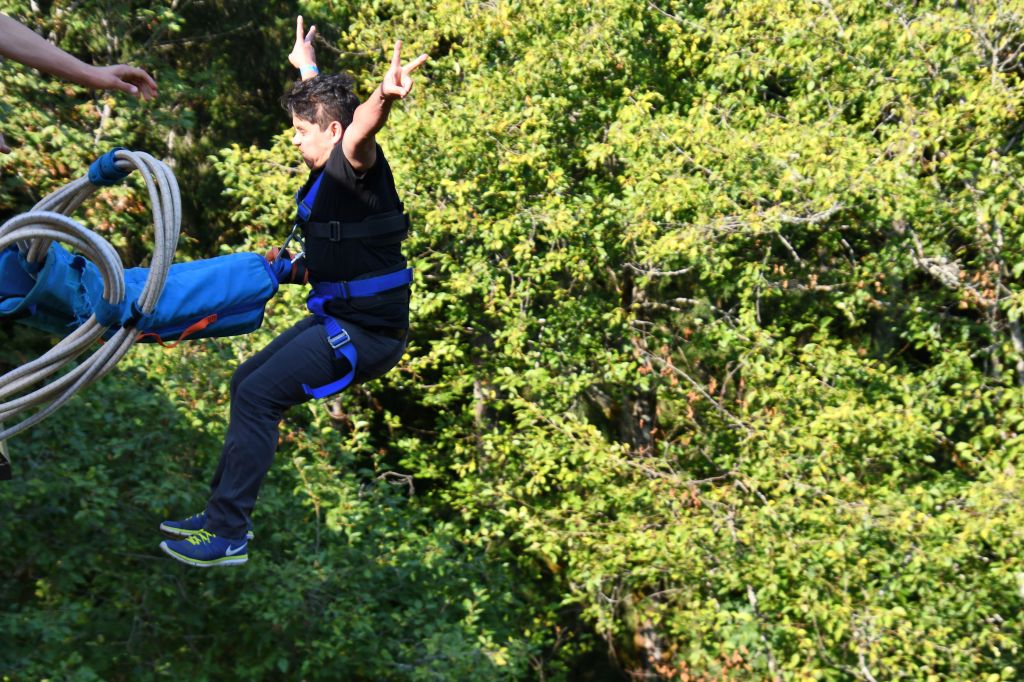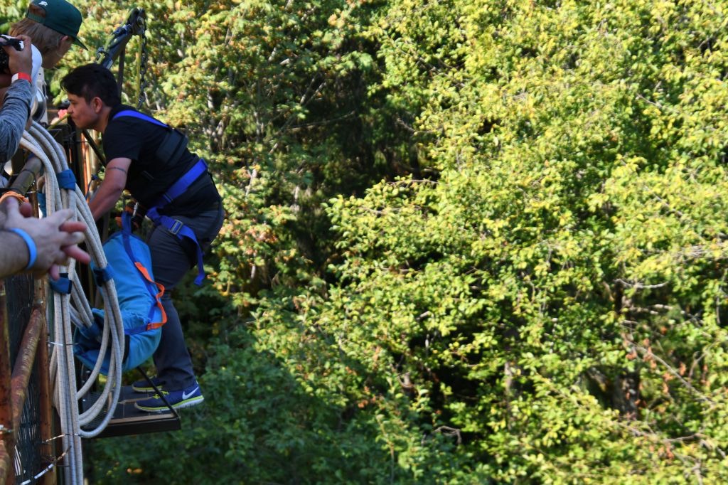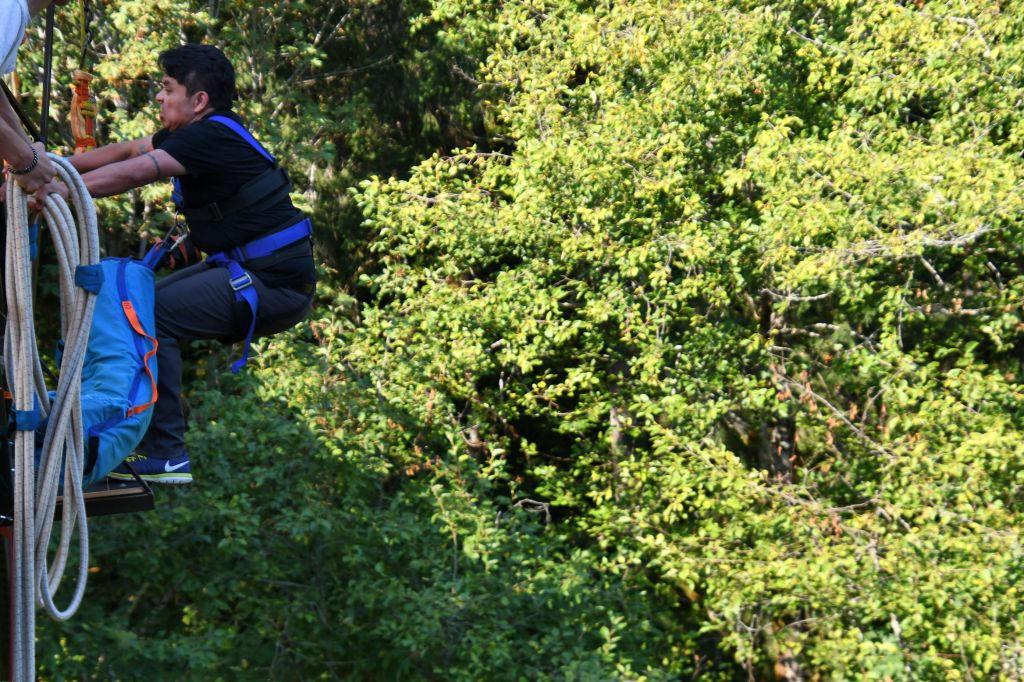 The guides dropped a cable for Pedro to attach to his gear once he stopped bouncing. They used a winch to haul him back up. Then he was on a platform on the other side of the bridge. This is the platform where all the new people are required to jump from. From this platform, Pedro hurled himself backward for a second jump.
