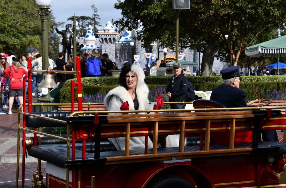 Characters with a large, masked head, like the three in the photo above, do not speak. They have a permanent happy smile on their faces and they will only wave or gesture. Some characters have human faces, and they will interact with their fans. Often they do a great job of a theatrical demonstration. I got a great photo of Cruella de Vil (below), and as I walked on, I heard a great shrieking commotion and ran back to see. While riding in the truck, Ms. de Vil had spotted a large white poodle that a Disney guest had brought into the park. “It’s mine!” She shrieked at the woman. “Bring it to me! Stop the car!” she hollered at her driver as she hung halfway out the back of the truck, reaching for the dog. “Bring me that dog!” But the driver ignored her and continued driving, and the woman and her dog were allowed to move on. It was a delightful 3-minute drama for everyone who knows why Cruella de Vil is so infamous.
