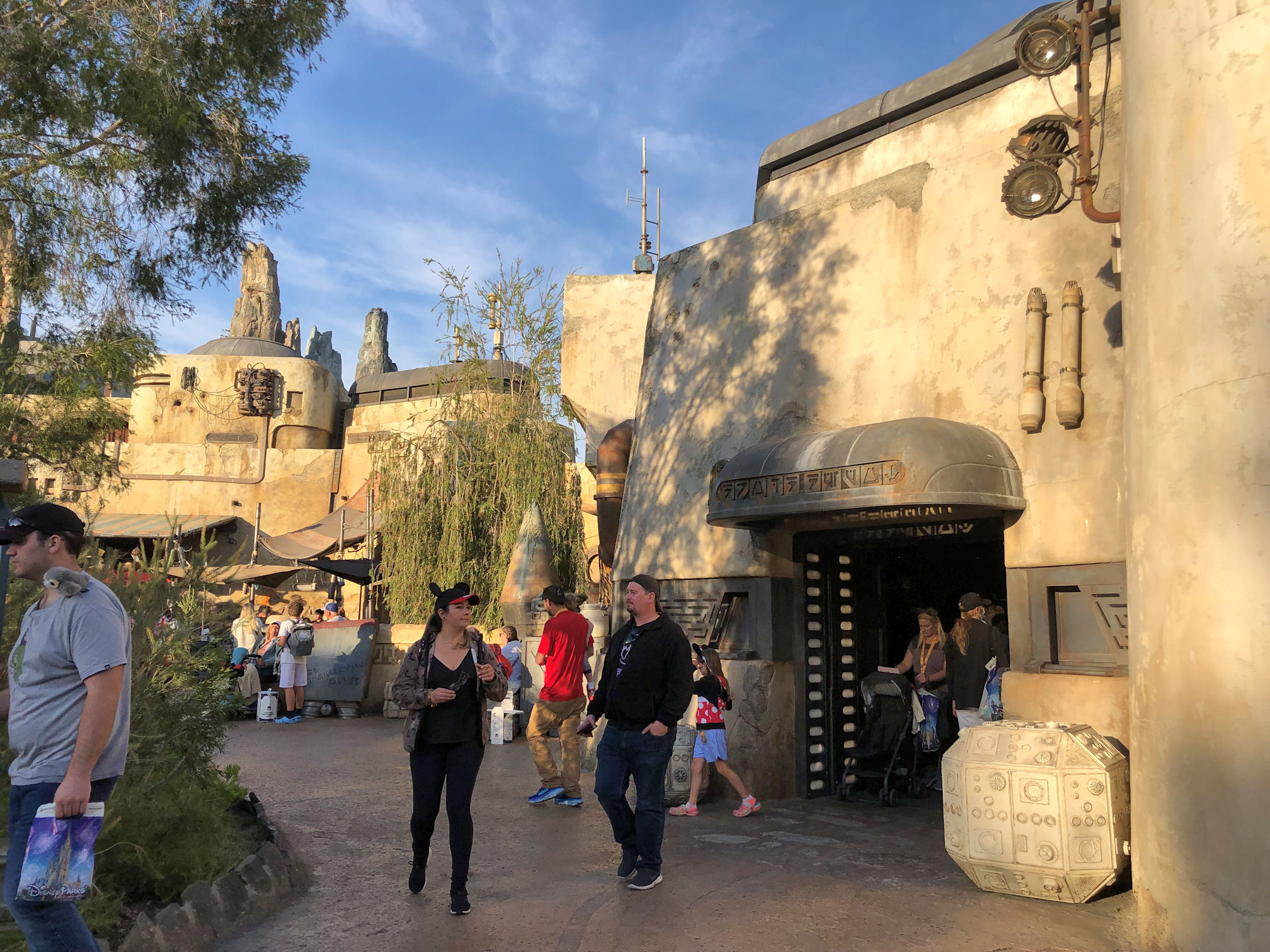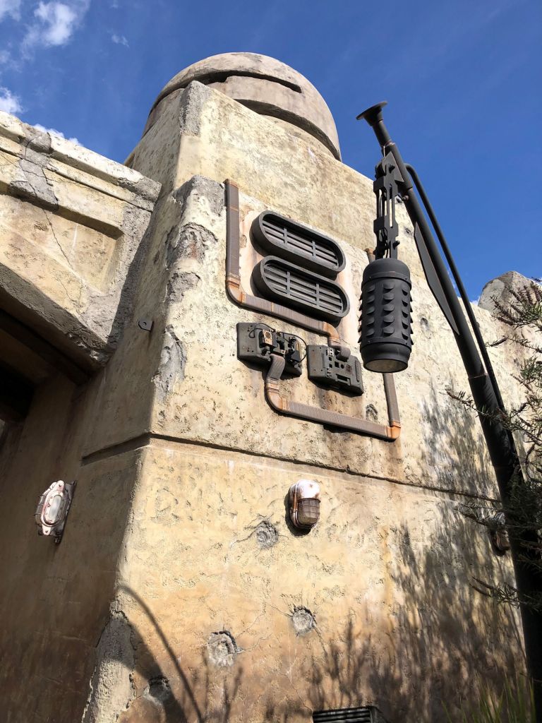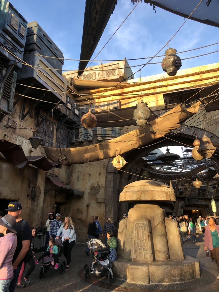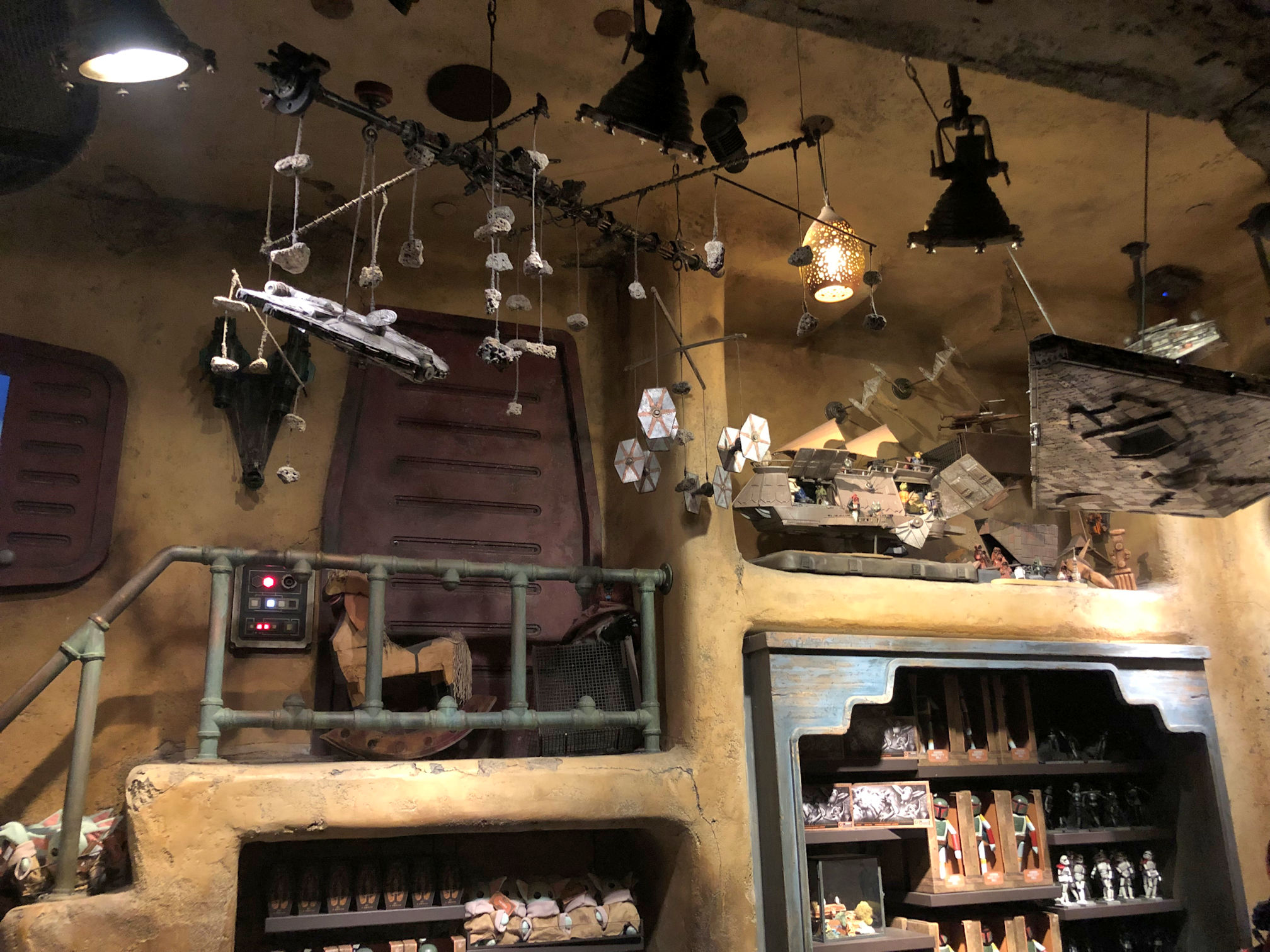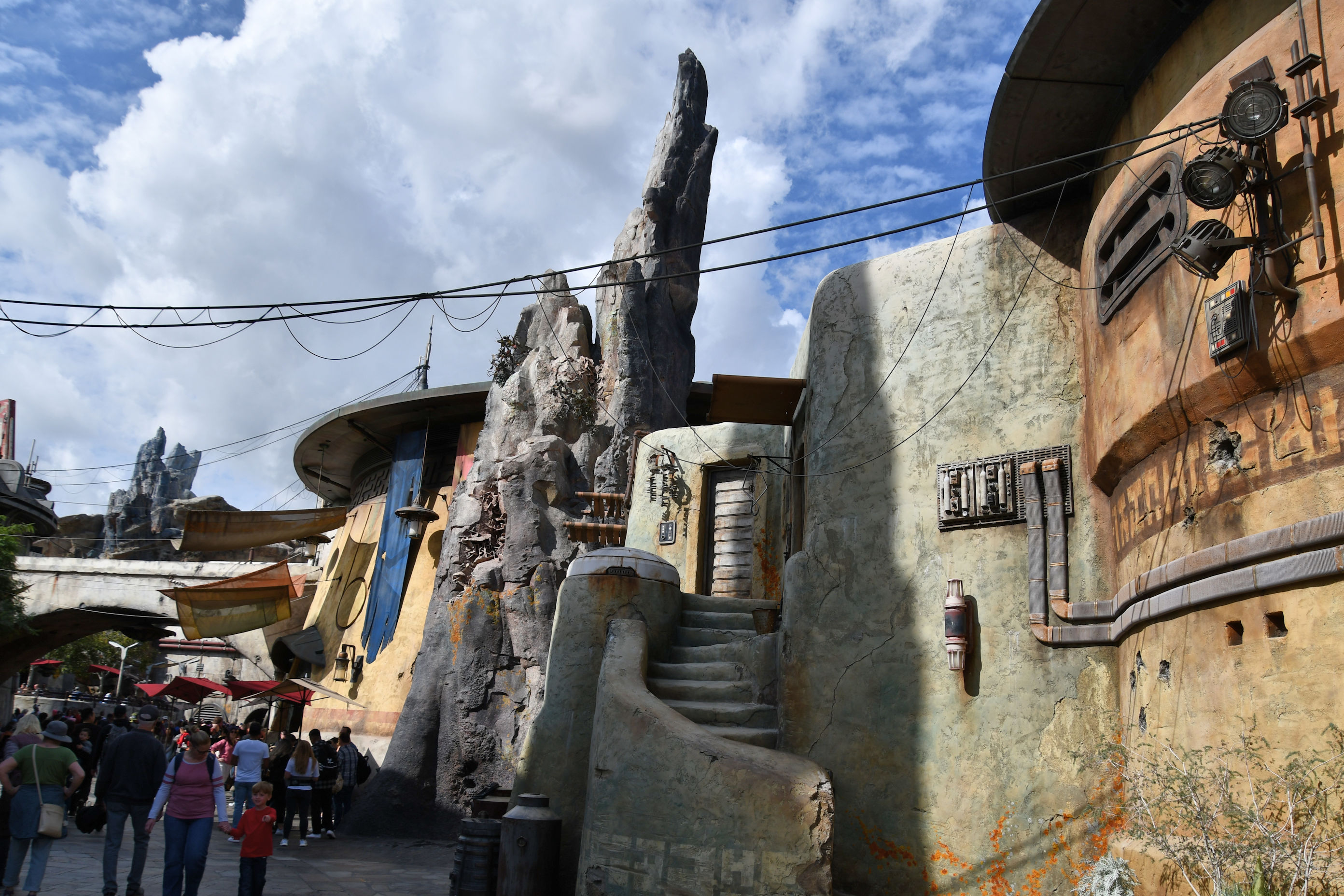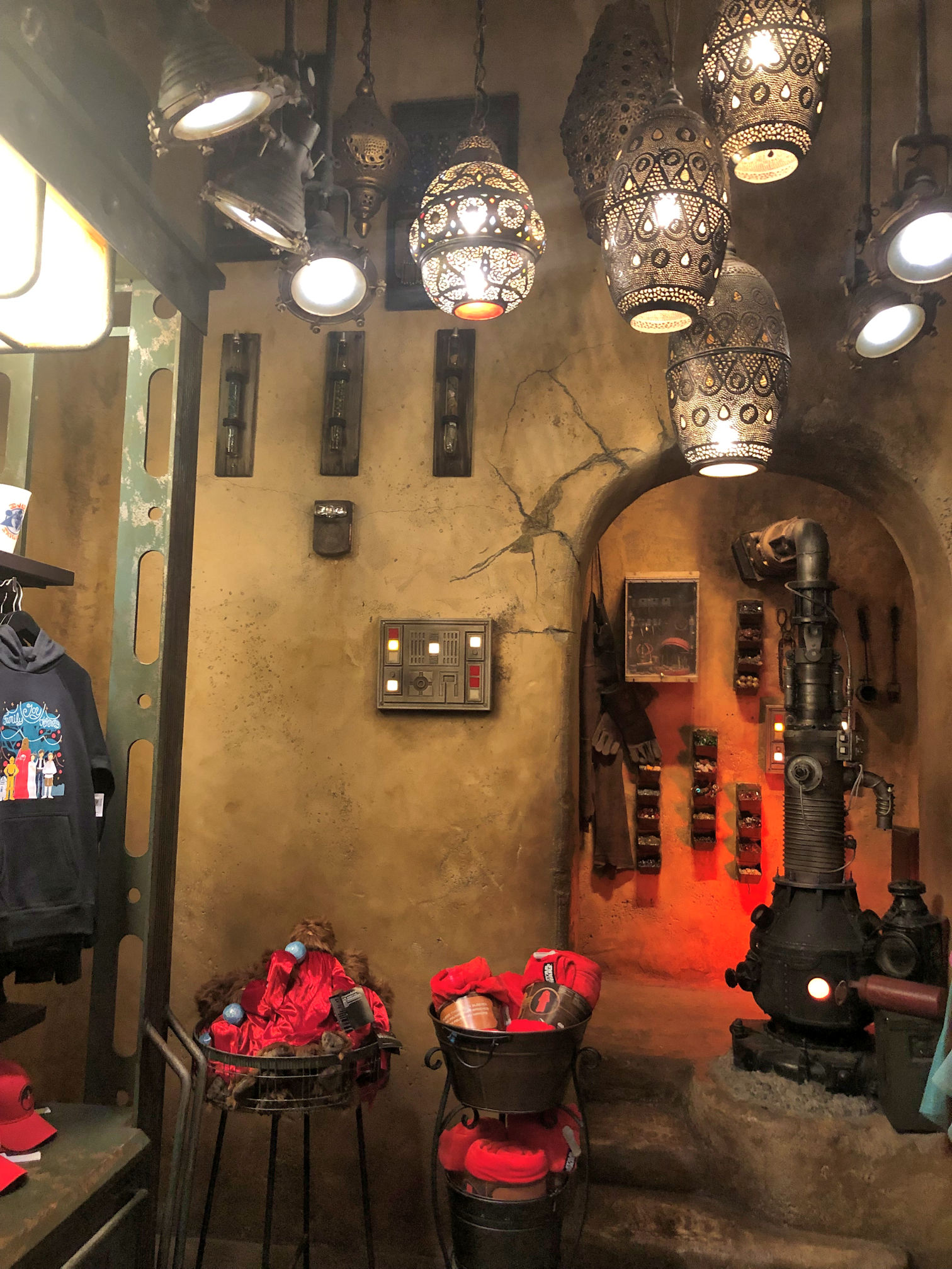 A panoramic view to help you get a sense of how much like a town it actually is.The theme is convincingly desert-like, making me feel like I was in a real city with real landscape, though it’s 100% make believe.The design elements seem often to be merely for effect, for atmosphere, and nothing else. I suppose this thing holds lights at night, but wow – what a light!Slow down and look closer, and you see there is a story built in. The town has seen battle. The back wall here has partially fallen. Everything is old, rusted, somewhat neglected but not terribly so. The effects of the desert weather can be seen.The details are wonderful: faded paint, chips in the base of the wall, where things would have crashed into it over the years, rust stains, projectile holes from someone shooting at something and hitting the wall, the haphazard wires strung up there probably by a guy who knew a guy… Here’s that same staircase above, only with a different perspective, so you can see where it sits in the street. Those rock spires are eye-catching.A little snack shop tucked away at the base of a few of those rocks.That same shop on a different day.The rocks are a consistent and intentional part of the park. When you spot one in the distance like this, it helps you maintain a sense of how huge Black Spire Outpost is.I zoomed in on this spot because it’s so dang pretty. Except for the missile hole in the wall…but other than that…Just gorgeous. And fake. Fakitty fake fake. But I simply don’t care and I’m ready to believe. Look at the textiles hanging over the doorway, and how the buildings appear to be built up against the rock for stability. And here is more of the story: Those are not merely rocks, but the remains of a petrified forest of immense trees! This piece of landscaping has no sign, no explanation, and just rests as it “fell” beside a path. Only the careful observer can figure out what it’s telling you – even better if you are related to a geologist, like I am! Frigging amazing.I thought this was a nice touch with the sunlight through holes. Can you read it? I cannot.Here’s another one.I find this architectural design magnificent.I must have been hurrying here, because the photo is not well framed. But it’s still pretty cool.This is inside Oga’s Cantina, a bar/restaurant.More marvelous details as we entered a shopping area.Inside the shopping area. Each doorway is a different shop.It’s even more beautiful at night.Inside the shops, the theme continues.I’m not positive which things are for sale.More things to browse.Random traders goods stacked outside Dok-Ondar’s Den of Antiquities. Check out that doorway!!This is what it looks like to walk through the doorway.