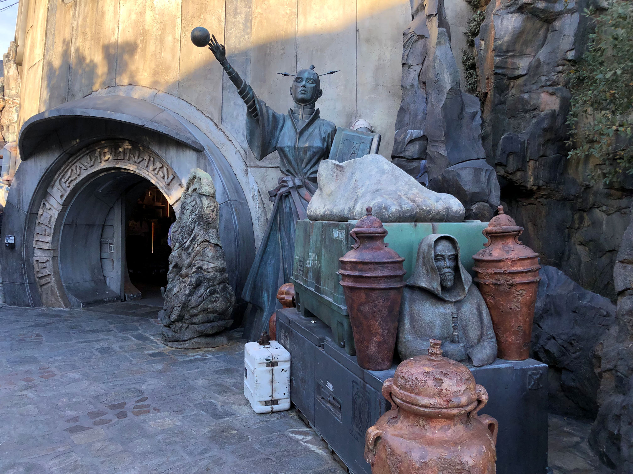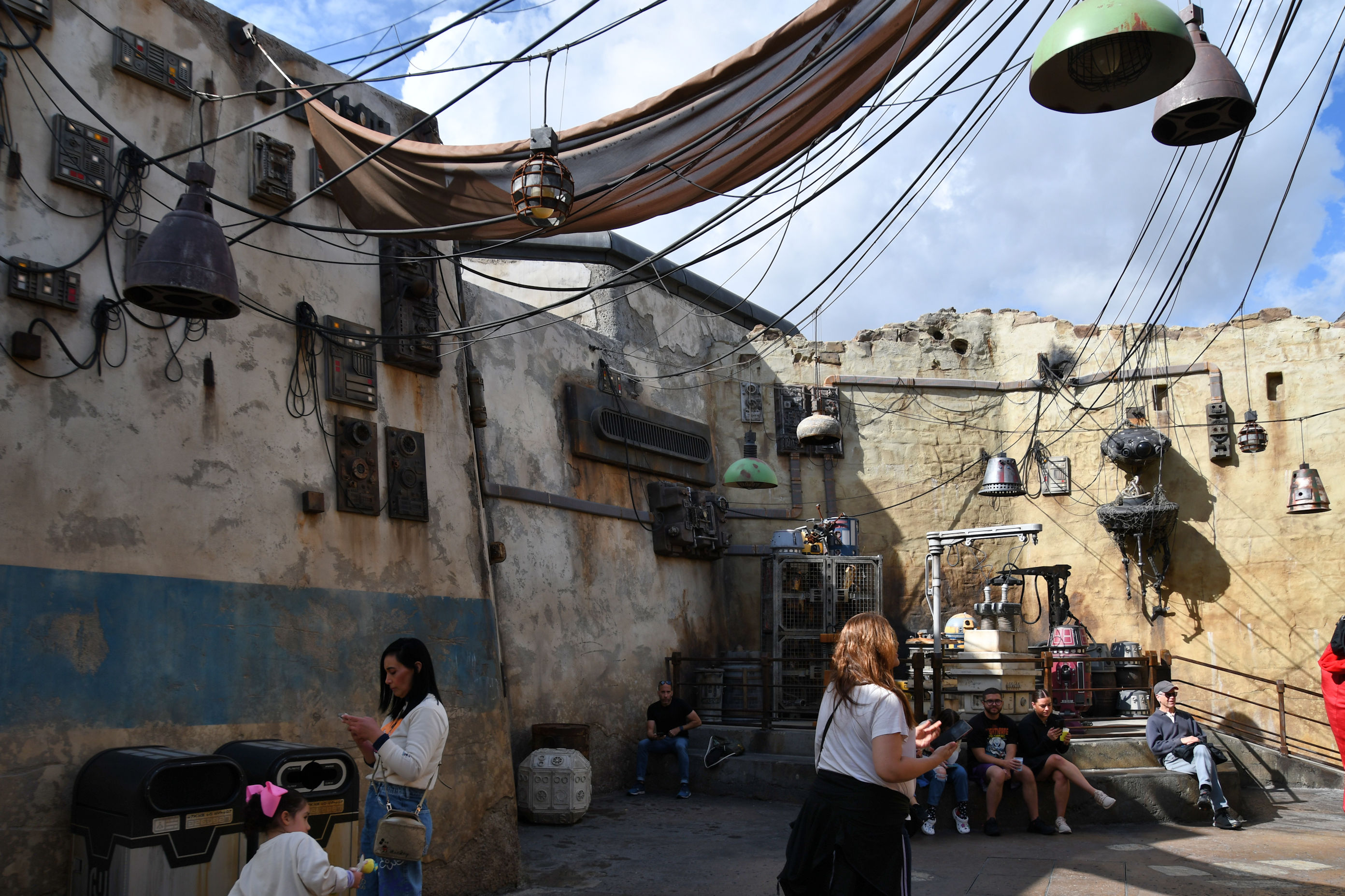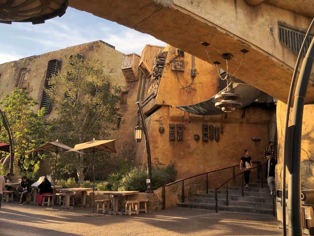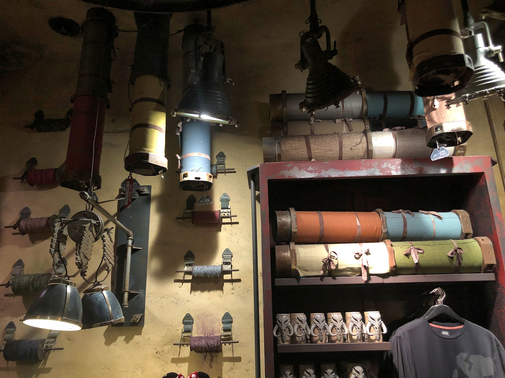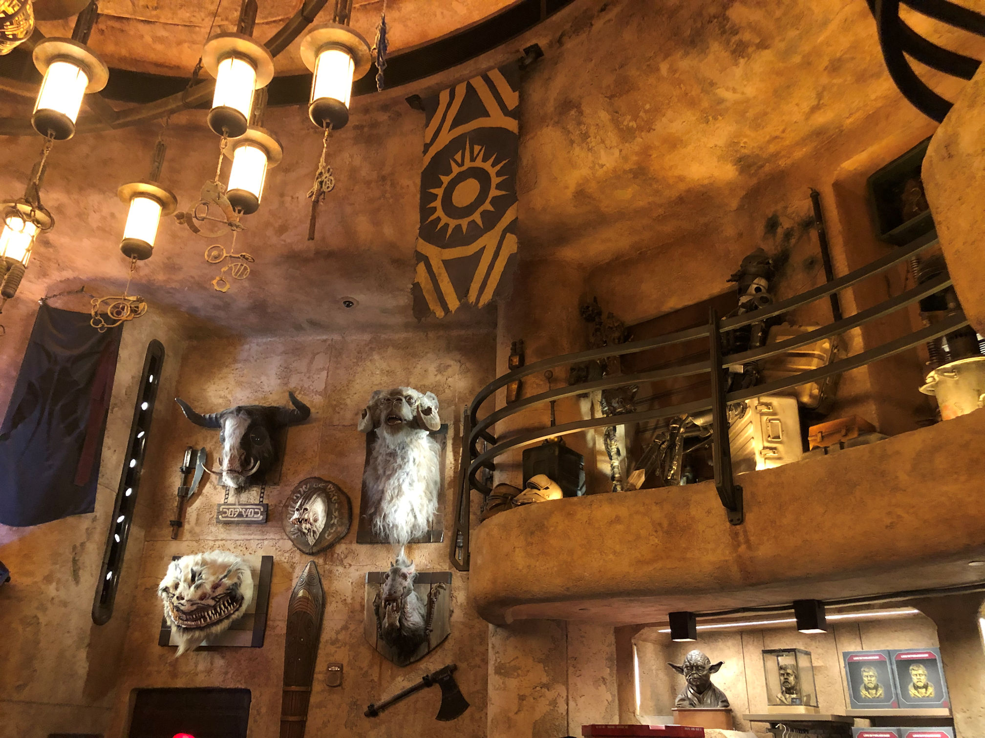 A panoramic view to help you get a sense of how much like a town it actually is.The theme is convincingly desert-like, making me feel like I was in a real city with real landscape, though it’s 100% make believe.The design elements seem often to be merely for effect, for atmosphere, and nothing else. I suppose this thing holds lights at night, but wow – what a light!Slow down and look closer, and you see there is a story built in. The town has seen battle. The back wall here has partially fallen. Everything is old, rusted, somewhat neglected but not terribly so. The effects of the desert weather can be seen.The details are wonderful: faded paint, chips in the base of the wall, where things would have crashed into it over the years, rust stains, projectile holes from someone shooting at something and hitting the wall, the haphazard wires strung up there probably by a guy who knew a guy… Here’s that same staircase above, only with a different perspective, so you can see where it sits in the street. Those rock spires are eye-catching.A little snack shop tucked away at the base of a few of those rocks.That same shop on a different day.The rocks are a consistent and intentional part of the park. When you spot one in the distance like this, it helps you maintain a sense of how huge Black Spire Outpost is.I zoomed in on this spot because it’s so dang pretty. Except for the missile hole in the wall…but other than that…Just gorgeous. And fake. Fakitty fake fake. But I simply don’t care and I’m ready to believe. Look at the textiles hanging over the doorway, and how the buildings appear to be built up against the rock for stability. And here is more of the story: Those are not merely rocks, but the remains of a petrified forest of immense trees! This piece of landscaping has no sign, no explanation, and just rests as it “fell” beside a path. Only the careful observer can figure out what it’s telling you – even better if you are related to a geologist, like I am! Frigging amazing.I thought this was a nice touch with the sunlight through holes. Can you read it? I cannot.Here’s another one.I find this architectural design magnificent.I must have been hurrying here, because the photo is not well framed. But it’s still pretty cool.This is inside Oga’s Cantina, a bar/restaurant.More marvelous details as we entered a shopping area.Inside the shopping area. Each doorway is a different shop.It’s even more beautiful at night.Inside the shops, the theme continues.I’m not positive which things are for sale.More things to browse.Random traders goods stacked outside Dok-Ondar’s Den of Antiquities. Check out that doorway!!This is what it looks like to walk through the doorway.