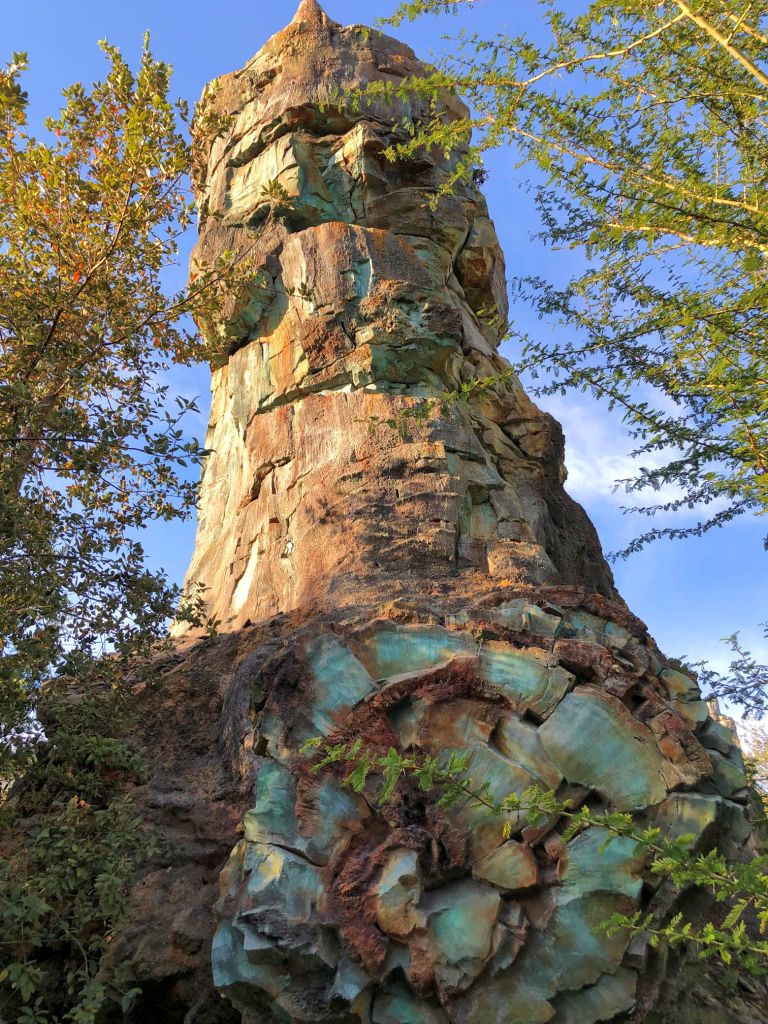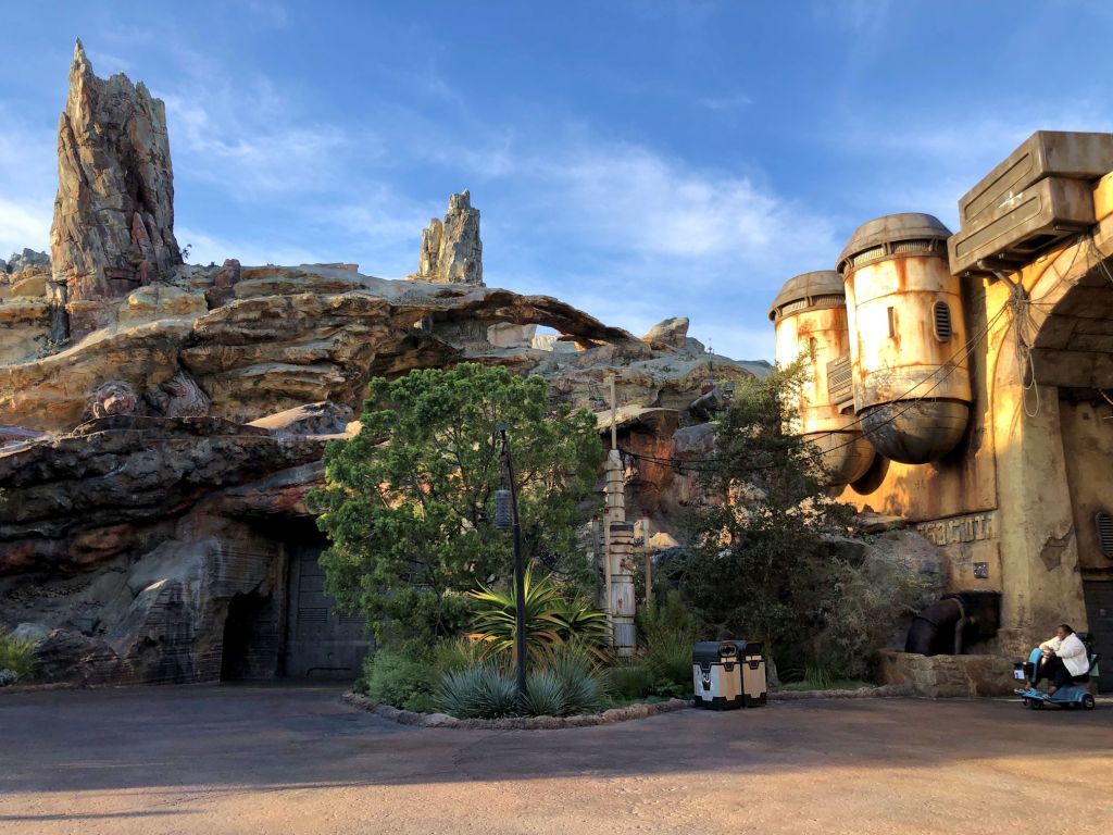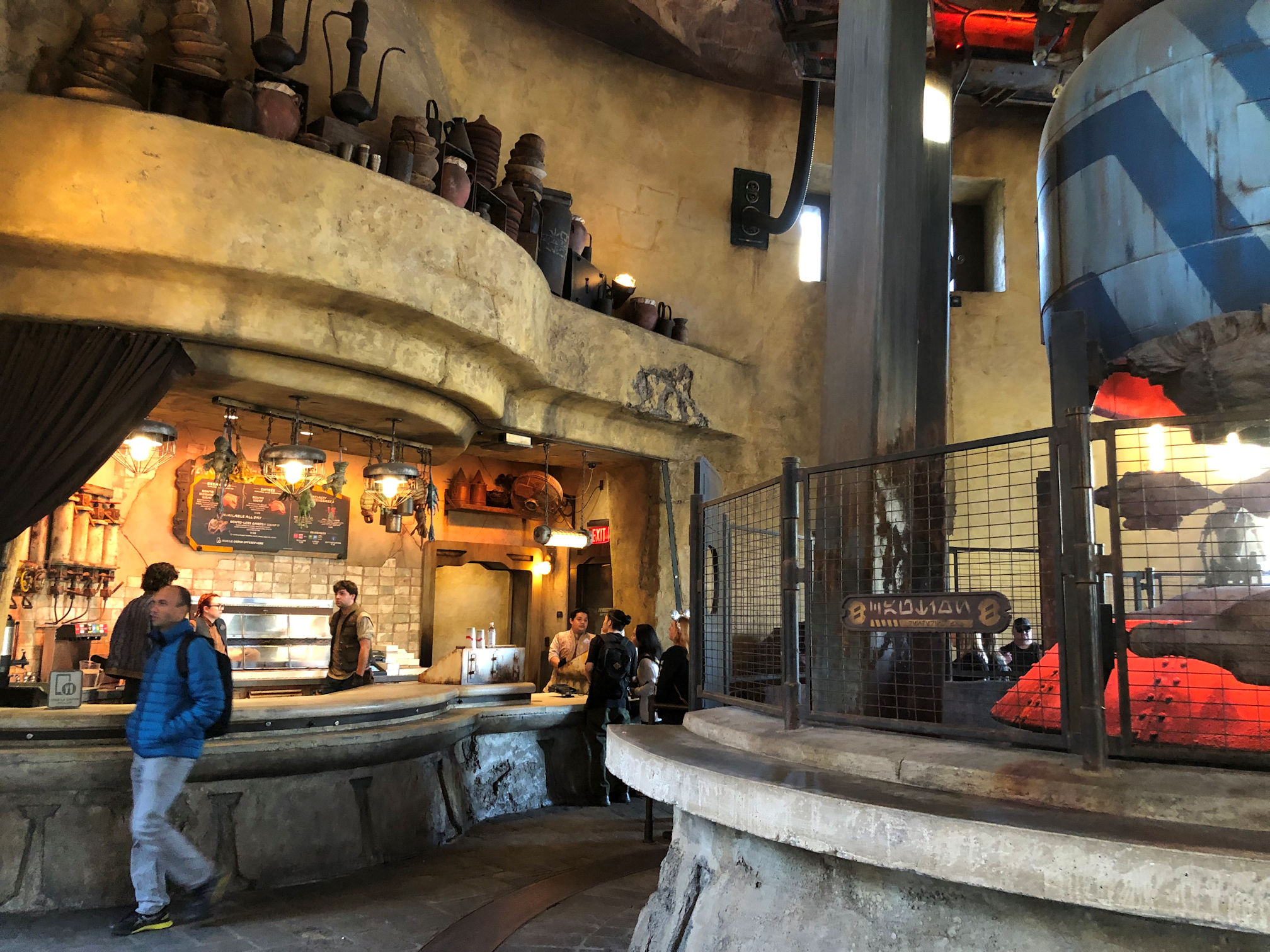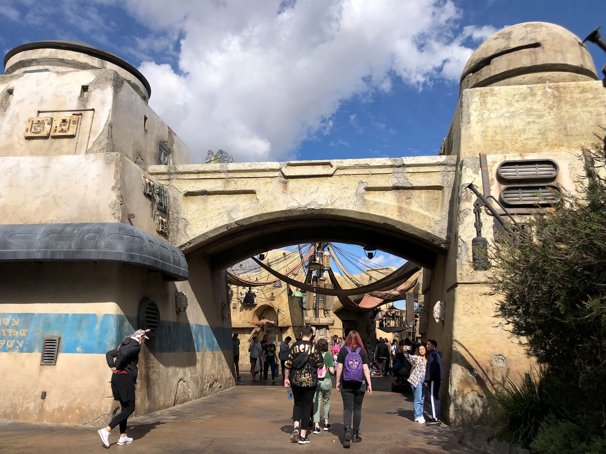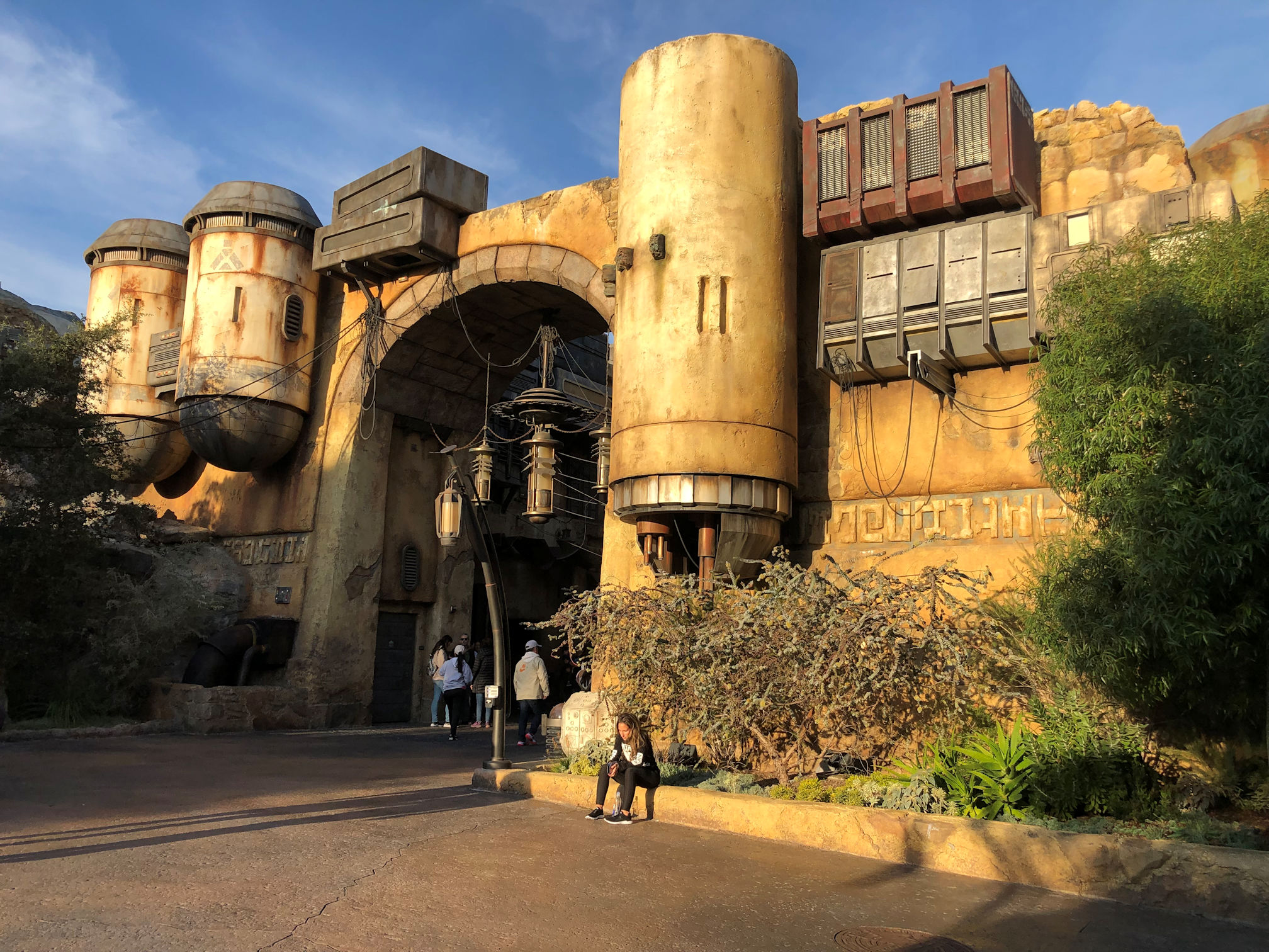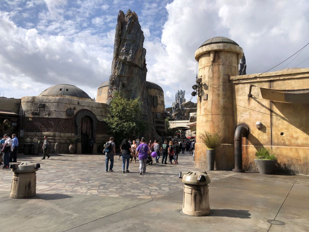 A panoramic view to help you get a sense of how much like a town it actually is.The theme is convincingly desert-like, making me feel like I was in a real city with real landscape, though it’s 100% make believe.The design elements seem often to be merely for effect, for atmosphere, and nothing else. I suppose this thing holds lights at night, but wow – what a light!Slow down and look closer, and you see there is a story built in. The town has seen battle. The back wall here has partially fallen. Everything is old, rusted, somewhat neglected but not terribly so. The effects of the desert weather can be seen.The details are wonderful: faded paint, chips in the base of the wall, where things would have crashed into it over the years, rust stains, projectile holes from someone shooting at something and hitting the wall, the haphazard wires strung up there probably by a guy who knew a guy… Here’s that same staircase above, only with a different perspective, so you can see where it sits in the street. Those rock spires are eye-catching.A little snack shop tucked away at the base of a few of those rocks.That same shop on a different day.The rocks are a consistent and intentional part of the park. When you spot one in the distance like this, it helps you maintain a sense of how huge Black Spire Outpost is.I zoomed in on this spot because it’s so dang pretty. Except for the missile hole in the wall…but other than that…Just gorgeous. And fake. Fakitty fake fake. But I simply don’t care and I’m ready to believe. Look at the textiles hanging over the doorway, and how the buildings appear to be built up against the rock for stability. And here is more of the story: Those are not merely rocks, but the remains of a petrified forest of immense trees! This piece of landscaping has no sign, no explanation, and just rests as it “fell” beside a path. Only the careful observer can figure out what it’s telling you – even better if you are related to a geologist, like I am! Frigging amazing.I thought this was a nice touch with the sunlight through holes. Can you read it? I cannot.Here’s another one.I find this architectural design magnificent.I must have been hurrying here, because the photo is not well framed. But it’s still pretty cool.This is inside Oga’s Cantina, a bar/restaurant.More marvelous details as we entered a shopping area.Inside the shopping area. Each doorway is a different shop.It’s even more beautiful at night.Inside the shops, the theme continues.I’m not positive which things are for sale.More things to browse.Random traders goods stacked outside Dok-Ondar’s Den of Antiquities. Check out that doorway!!This is what it looks like to walk through the doorway.
