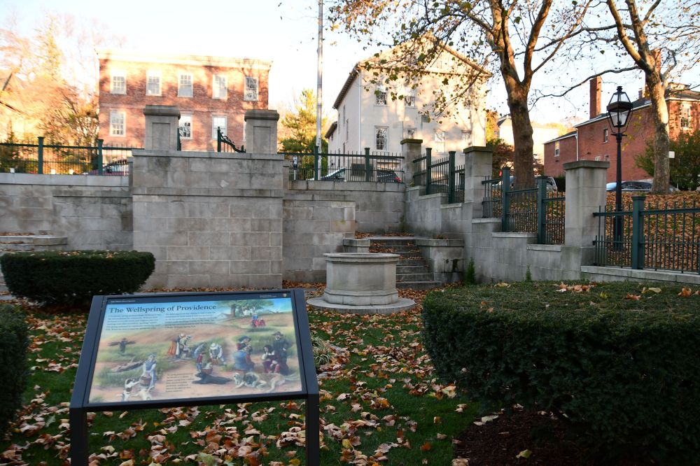 The park is small, but being located in the center of the city allows it to reach and teach a lot of people. We passed the Hahn Memorial. From the official website: “The centerpiece of the memorial is an octagonal limestone wellcurb traditionally held to contain the source of the Roger Williams Spring. The park was given to the city of Providence by Judge Jacob Hahn in memory of his father, Isaac Hahn, the first person of Jewish faith to be elected to public office from Providence.”