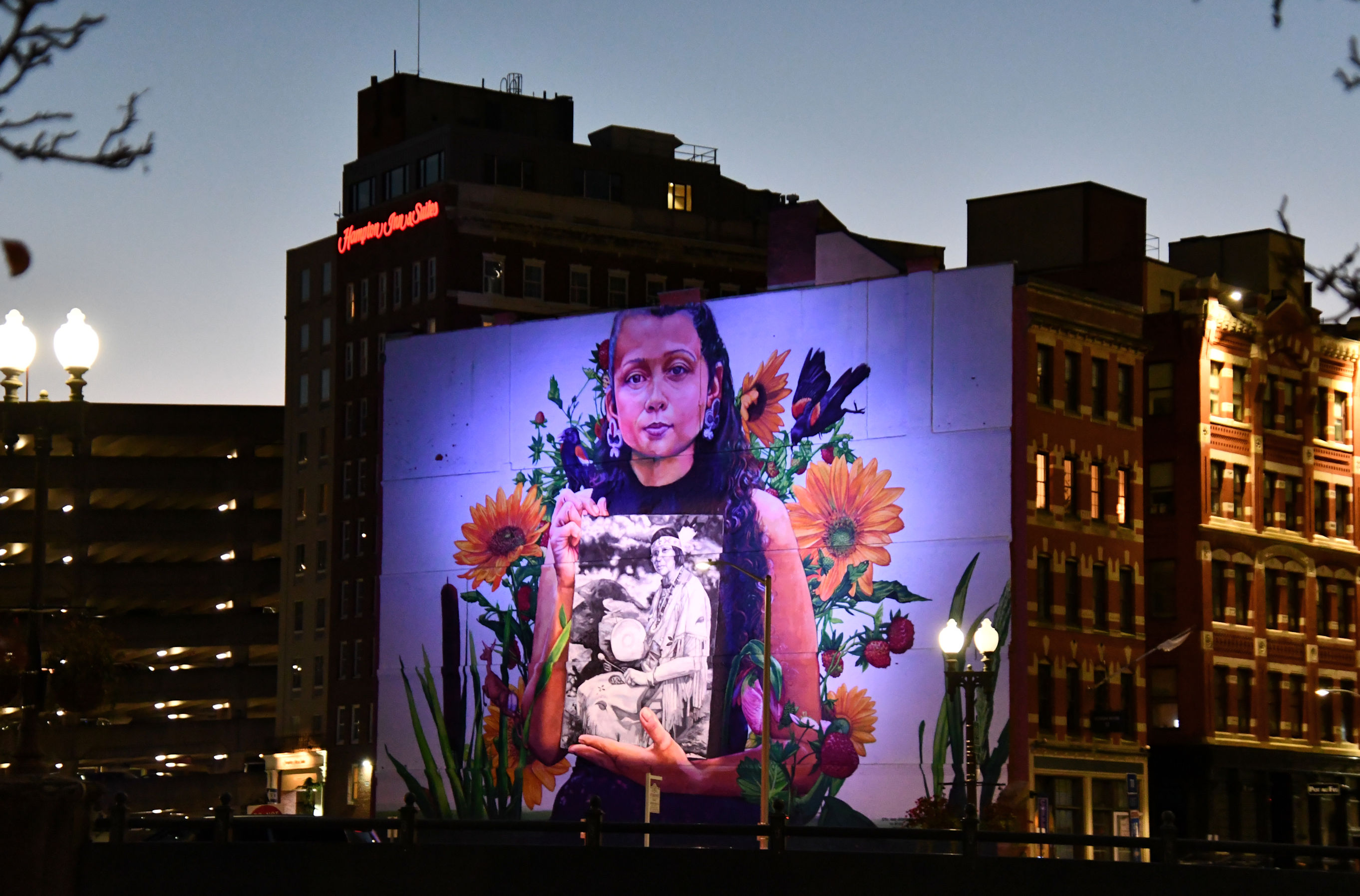 Mural visible across Providence River is a message about the continuity of the Native people here. In the mural, Lynsea Montanari holds a black and white photo of Princess Redwing, a Rhode Island Native activist and educator. I found a nice interview with Ms. Montanari here.