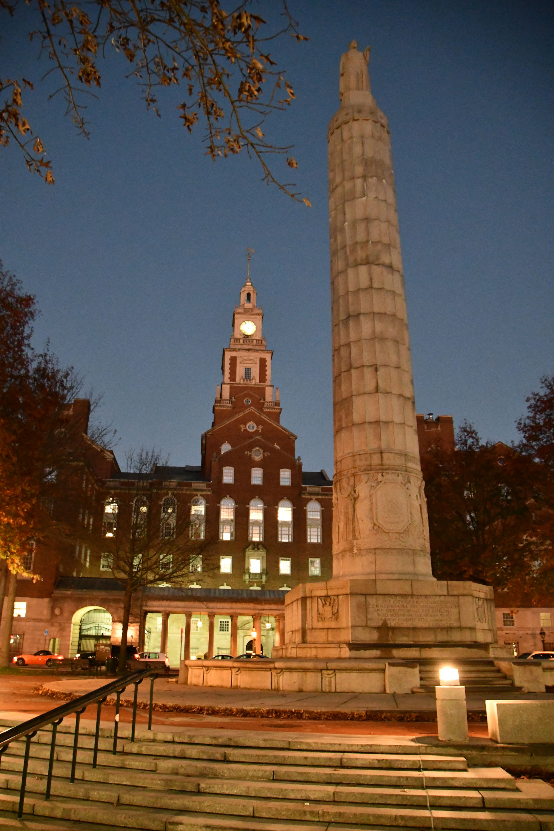 We came across the World War I Memorial, in Memorial Park. It stands 150 feet high and has a statue representing Peace at the top. It was designed by architect Paul P. Cret and sculpted by Carl P. Jennewien. The memorial names specific battles that involved Rhode Islanders. I like how the quote refers to “the” world war, and not to the first world war. The column was erected in 1929, and thus they did not know what was to come.