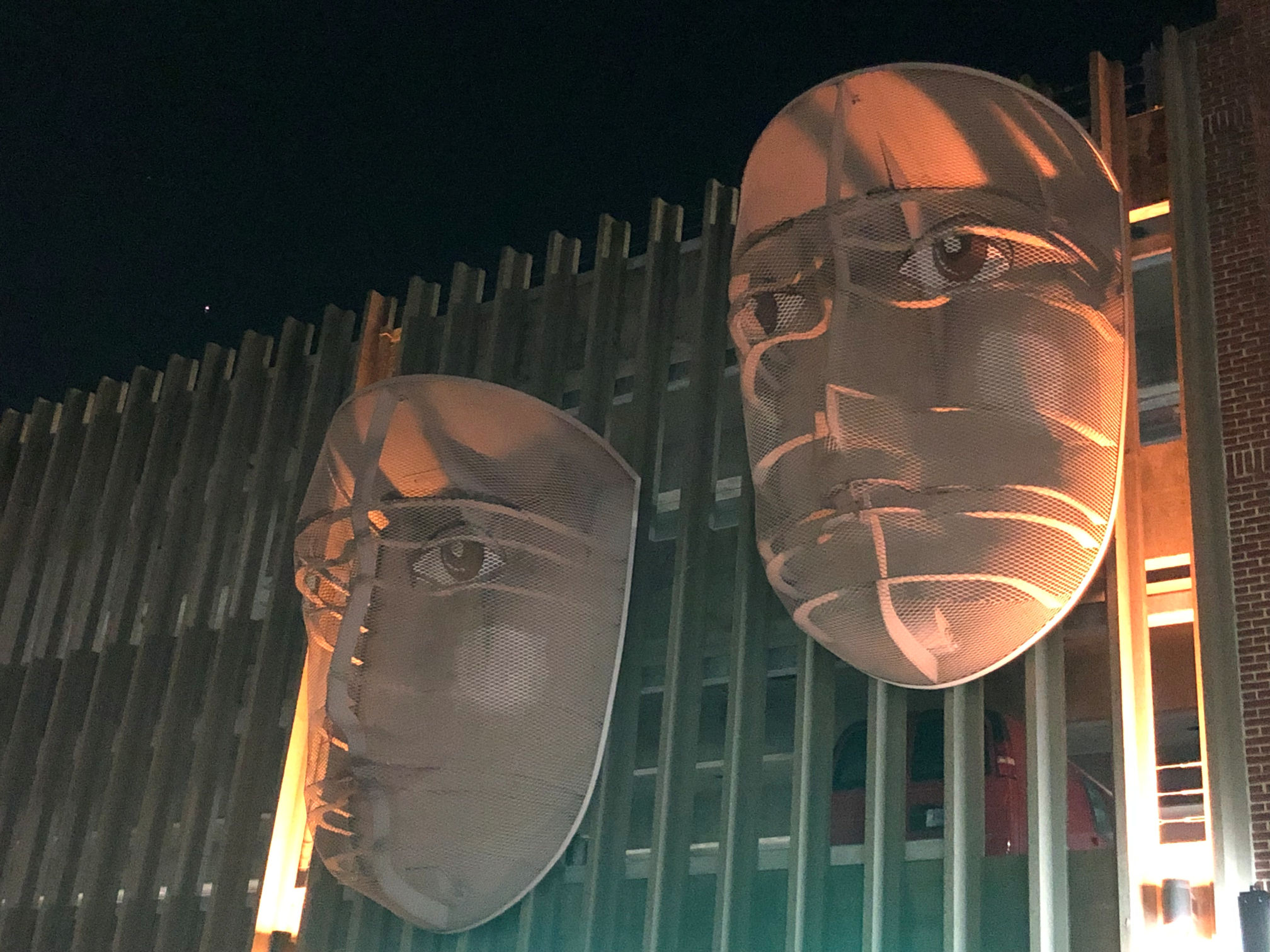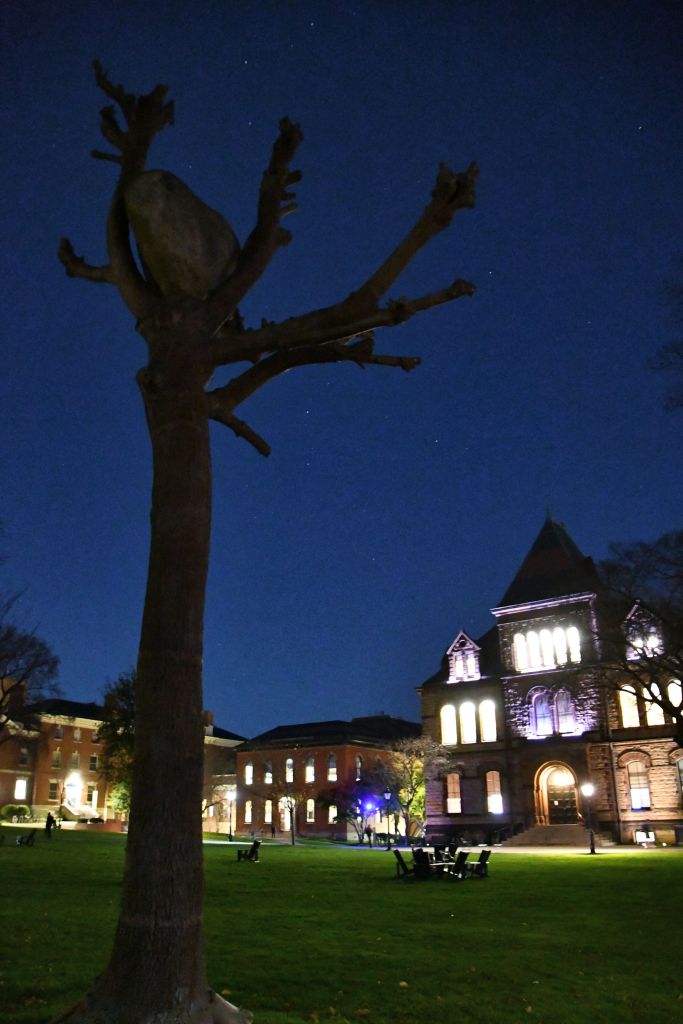In the dark we could have sworn this cast bronze sculpture called Idee di Pietra was an actual tree because the detail is so good, but it is made of metal. It does hold a real river stone in the air. The sculpture was made by Giuseppe Penone in 2006 and is supposed to represent the force of gravity on the natural world, including the human body. It is 27 feet high and that rock supposedly weighs 5000 pounds.