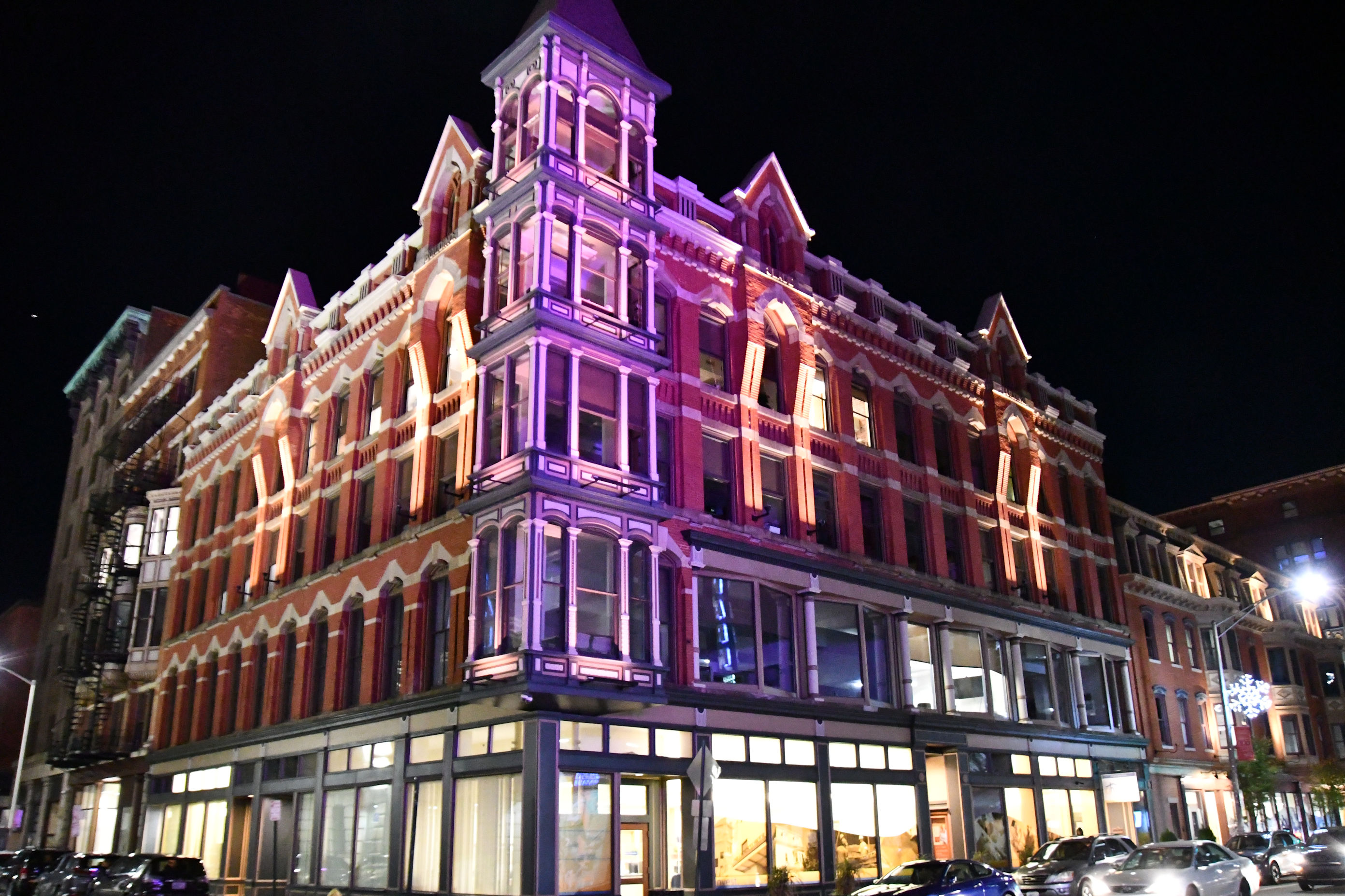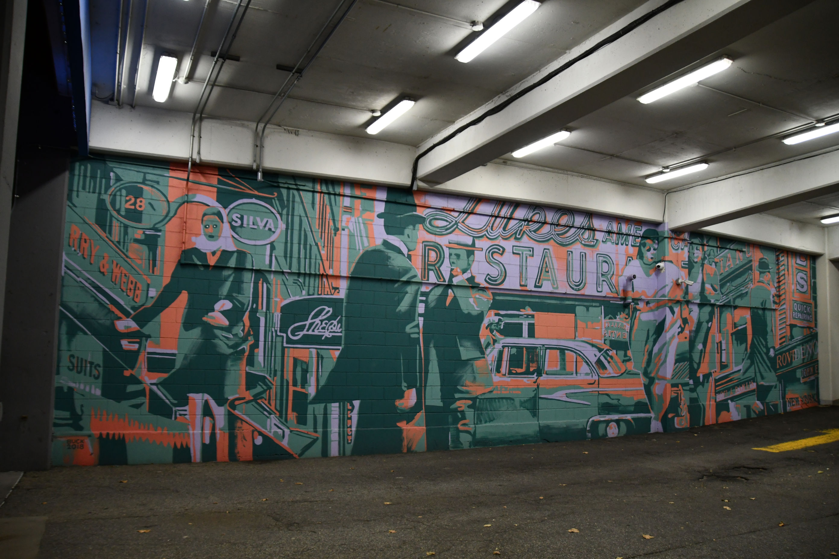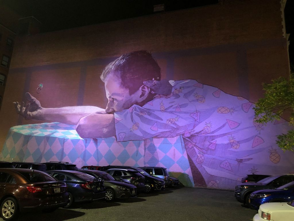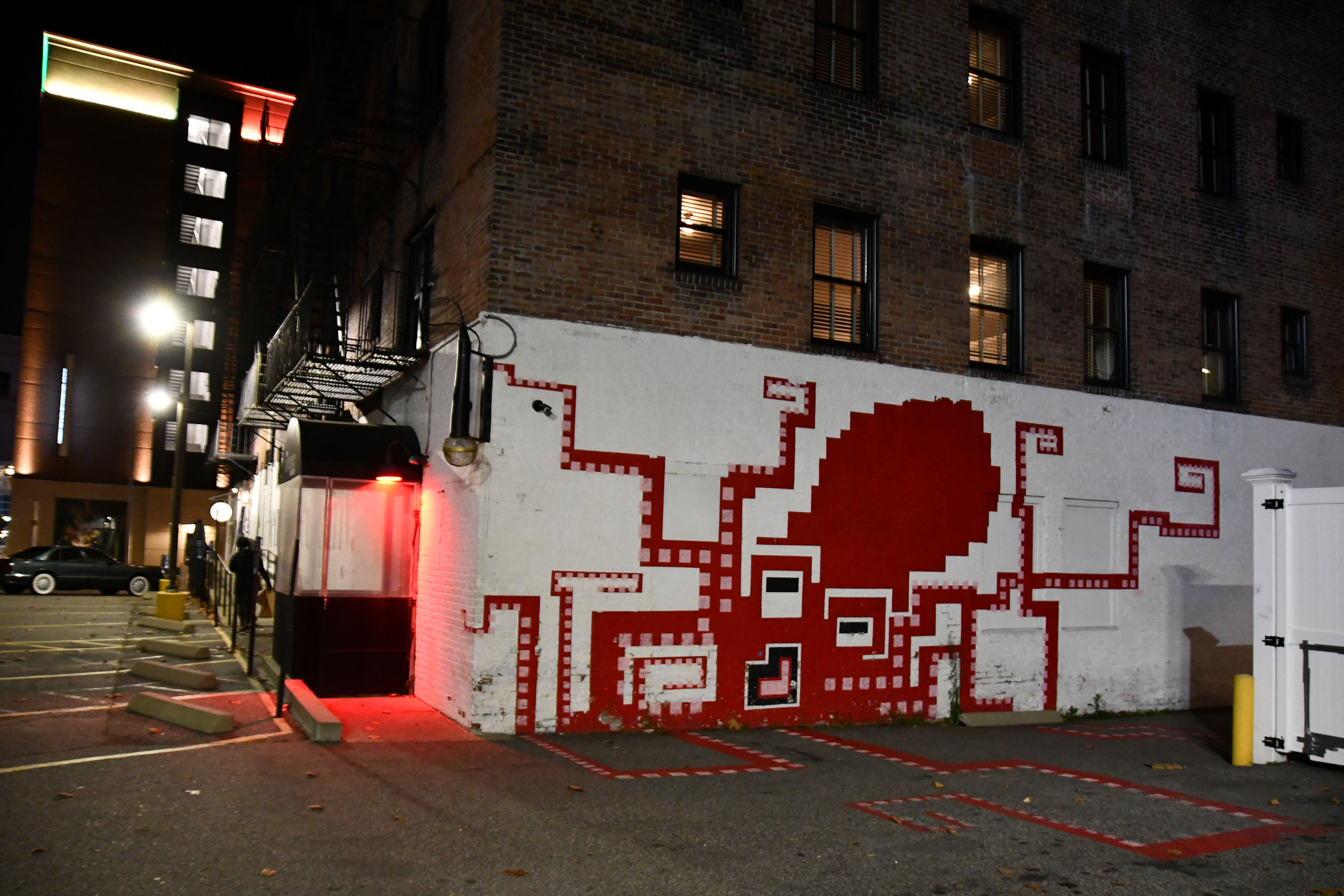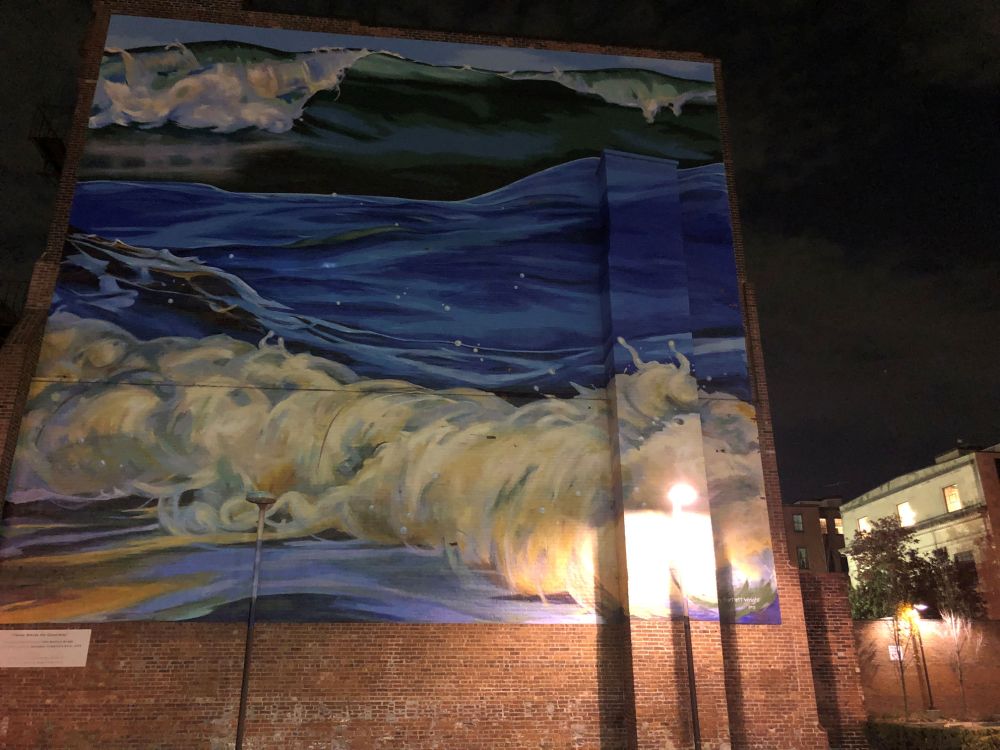 Providence has some pretty neat wall art, and soon we were distracted anew, running around and taking nighttime photos of the lit-up murals.