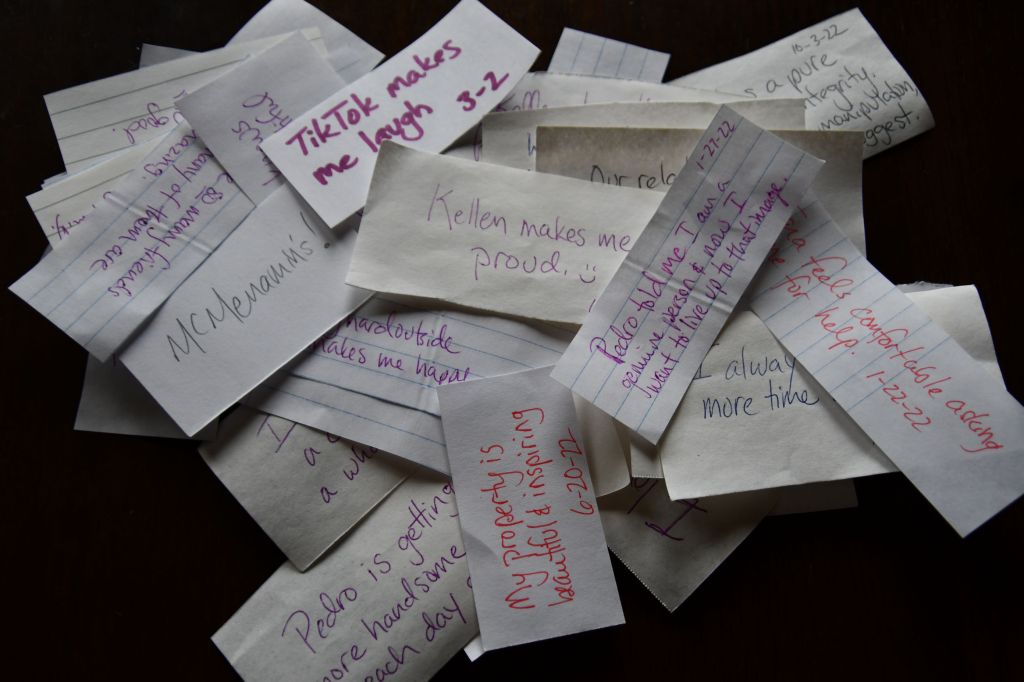 I like this exercise because it keeps me more often in gratitude. I have always kept the jar in my kitchen, the room in which I spend most of my waking hours, so that I will see the jar every day and hopefully be reminded to stop and reflect on something positive. It honestly works for me.