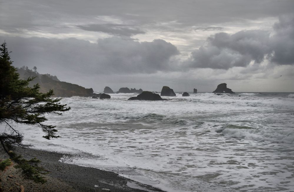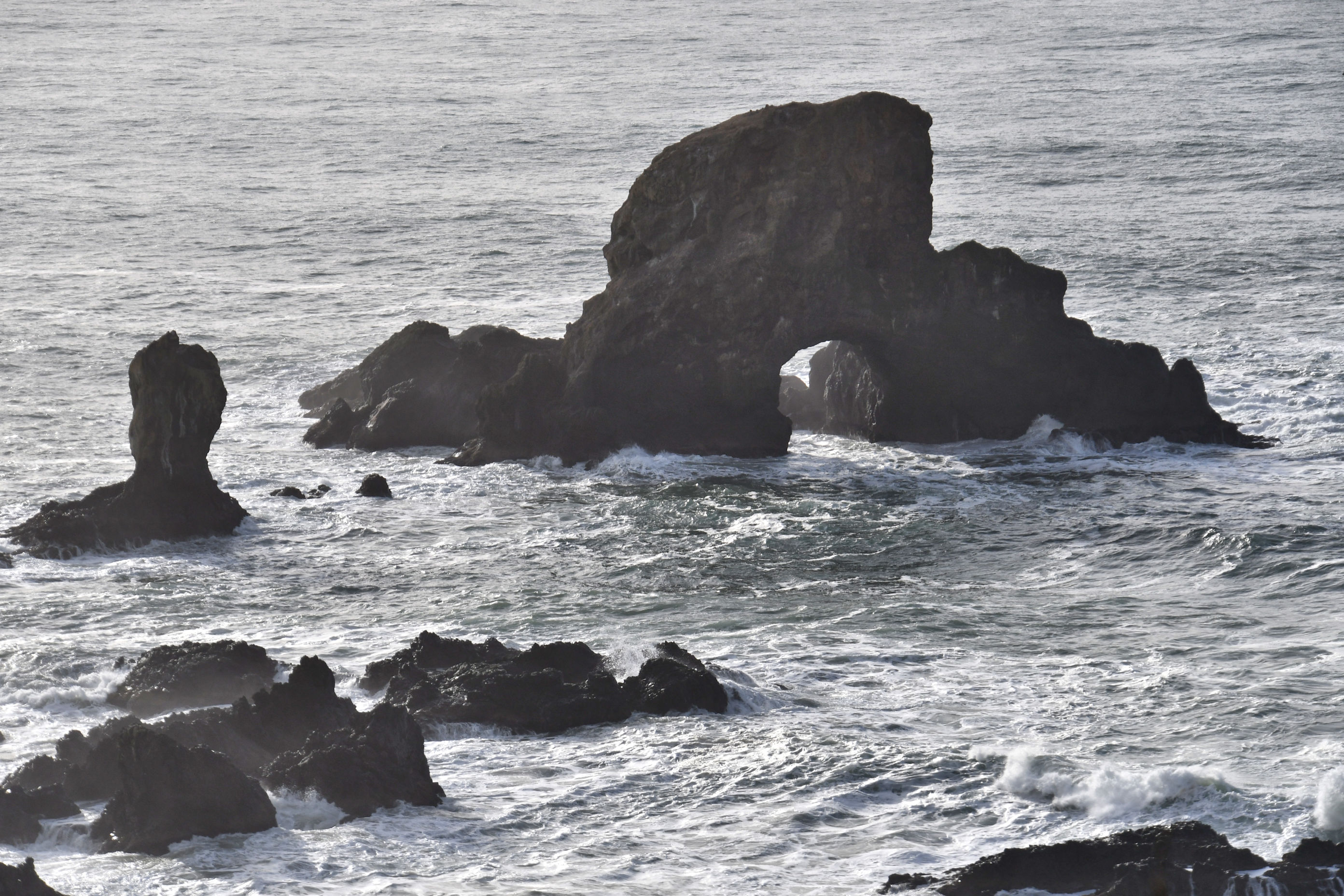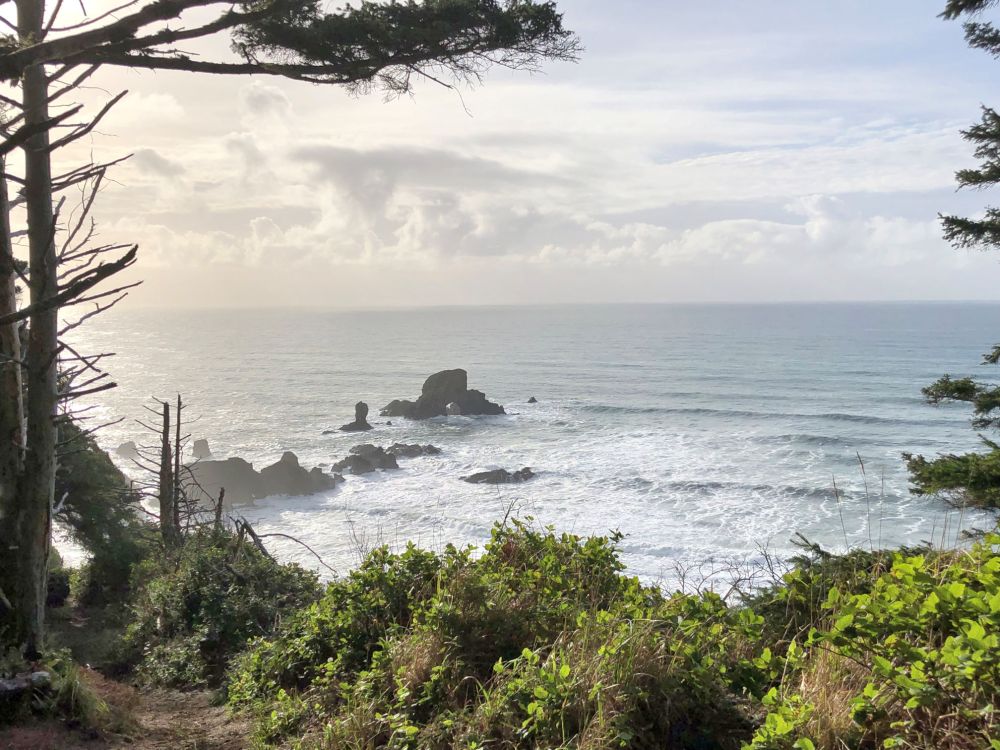One of our first grey, drizzly views of the sea, and the sea stacks that caught our attention.