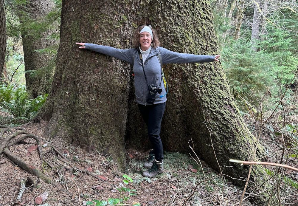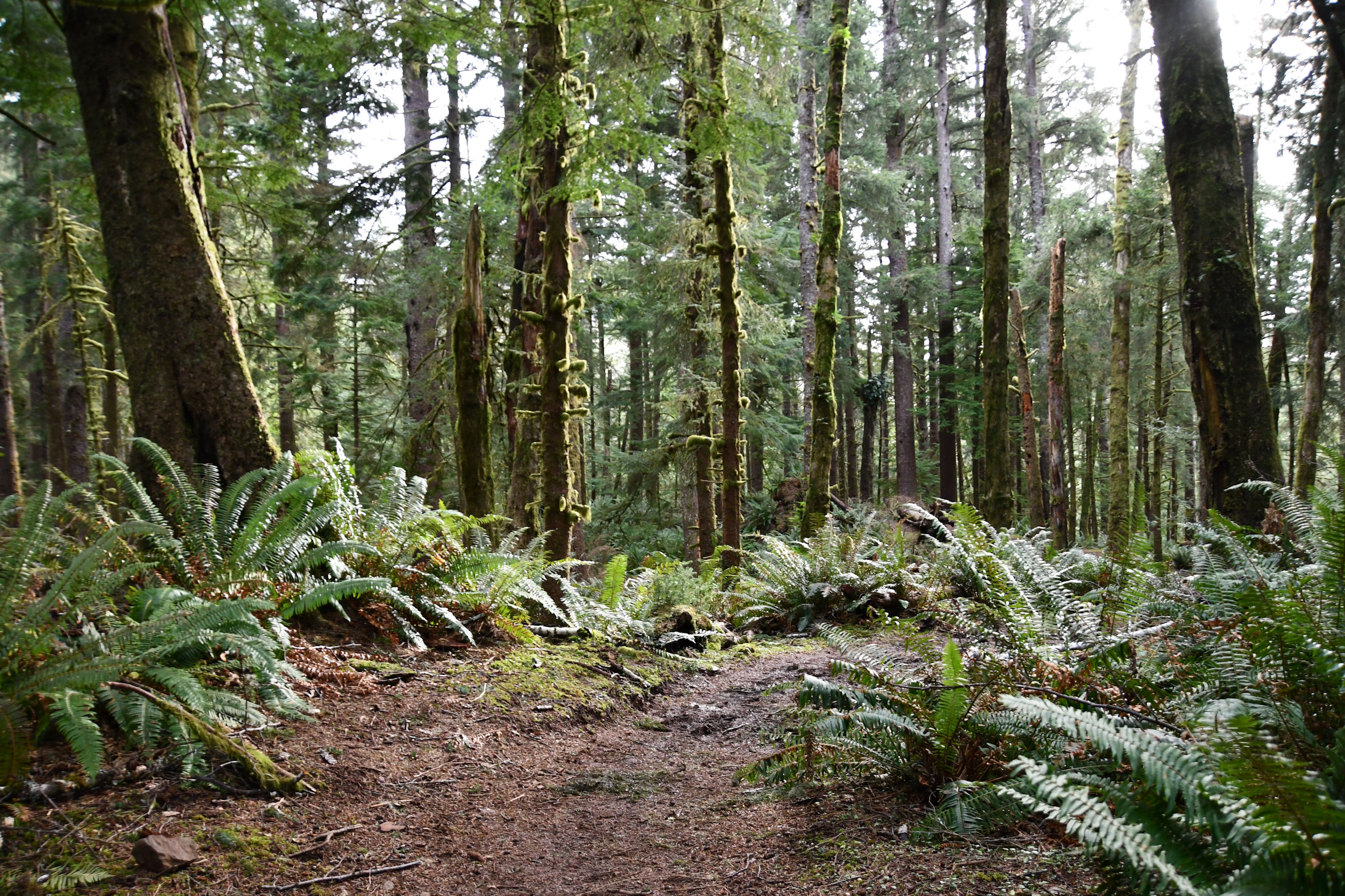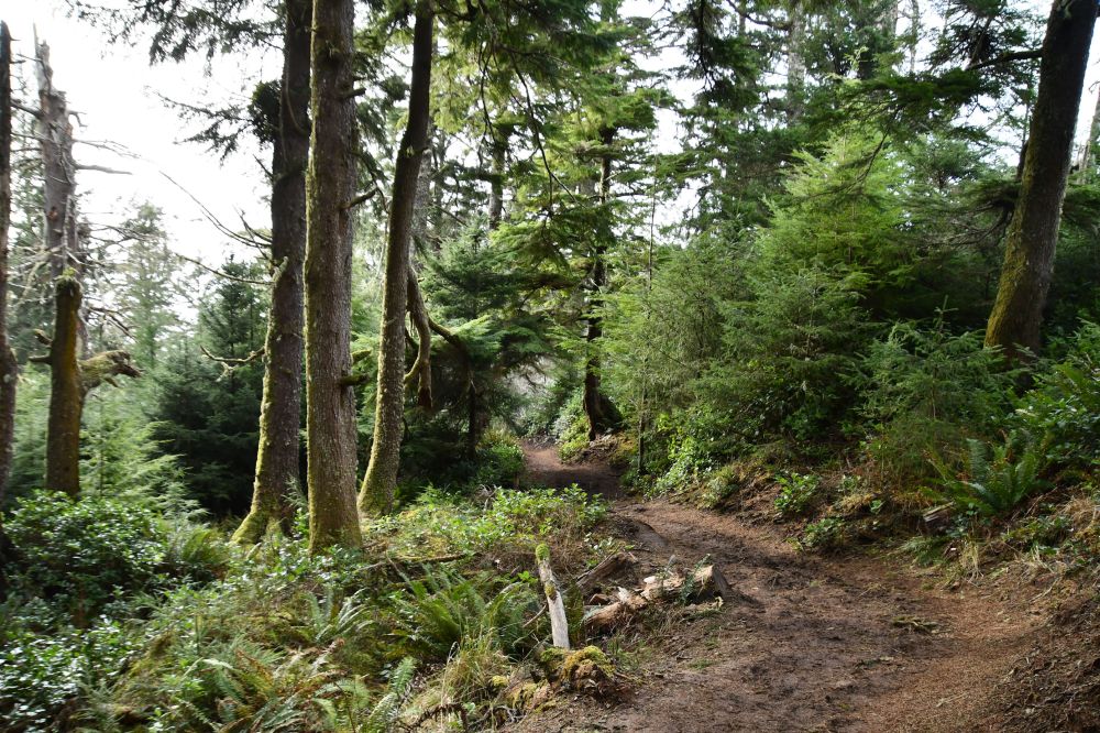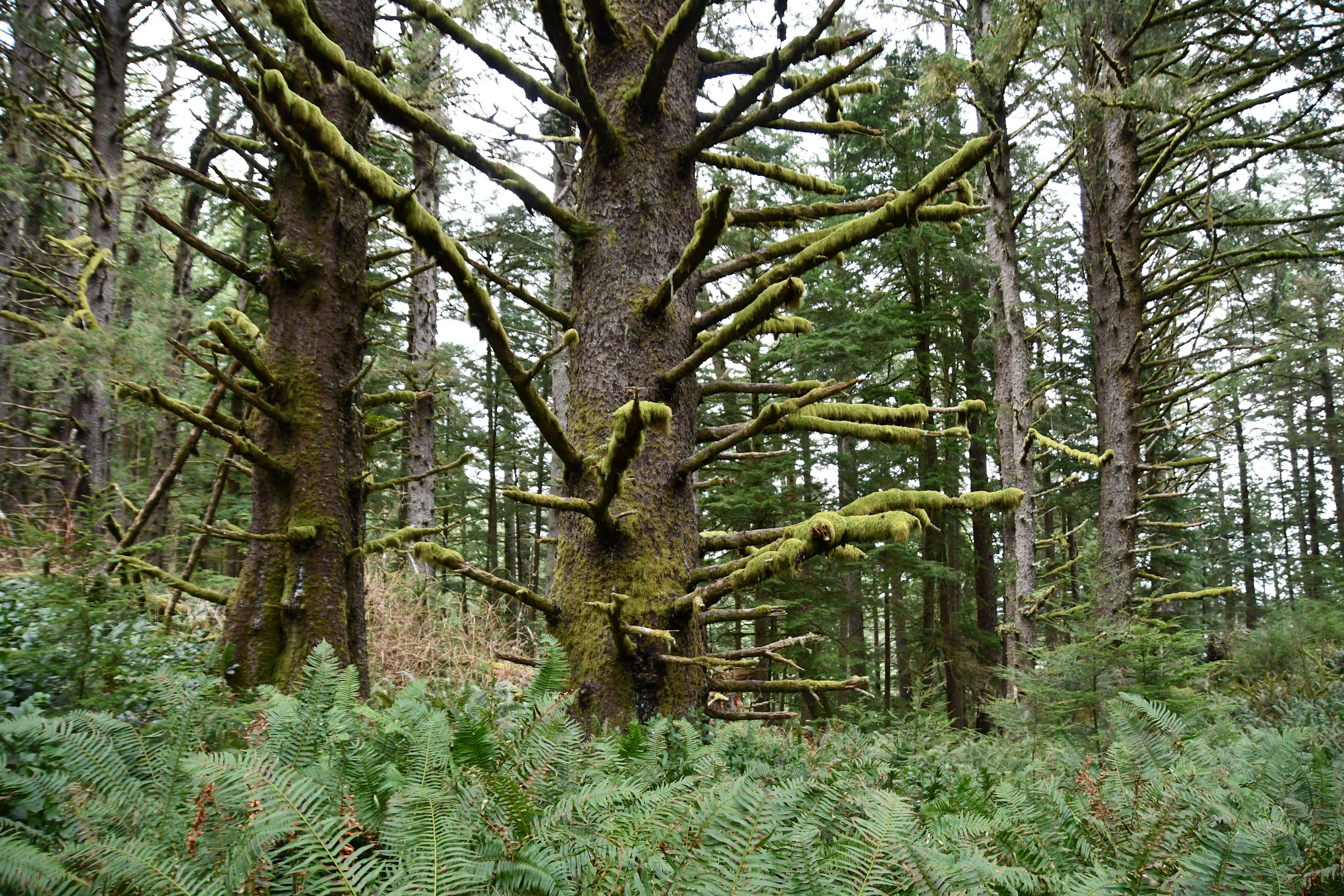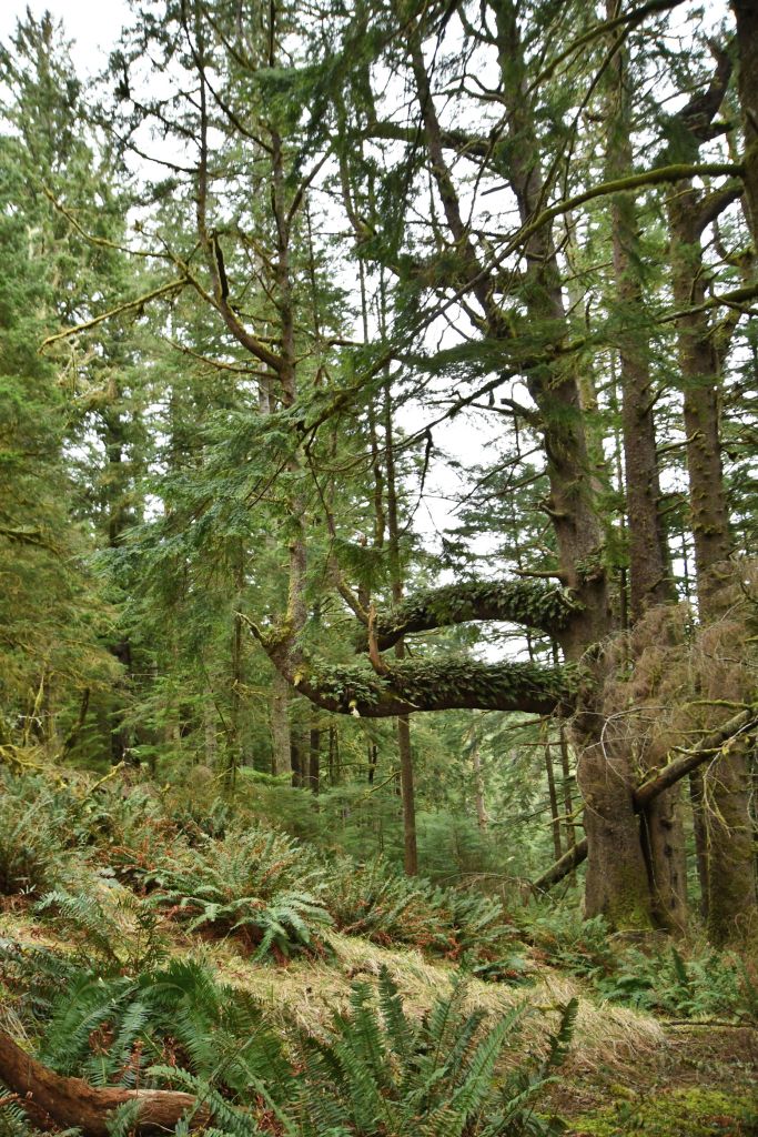 When we were too far from the Pacific Ocean to see it, we looked instead at the forest around us, and it was magnificent. Ecola State Park holds some gigantic old growth Sitka Spruce that literally stopped us in our tracks a couple of times. We tried to get photos with us in them, to give a sense of the size. Some of the best ones were too far away for us to be able to get close and give you some perspective. Like these: