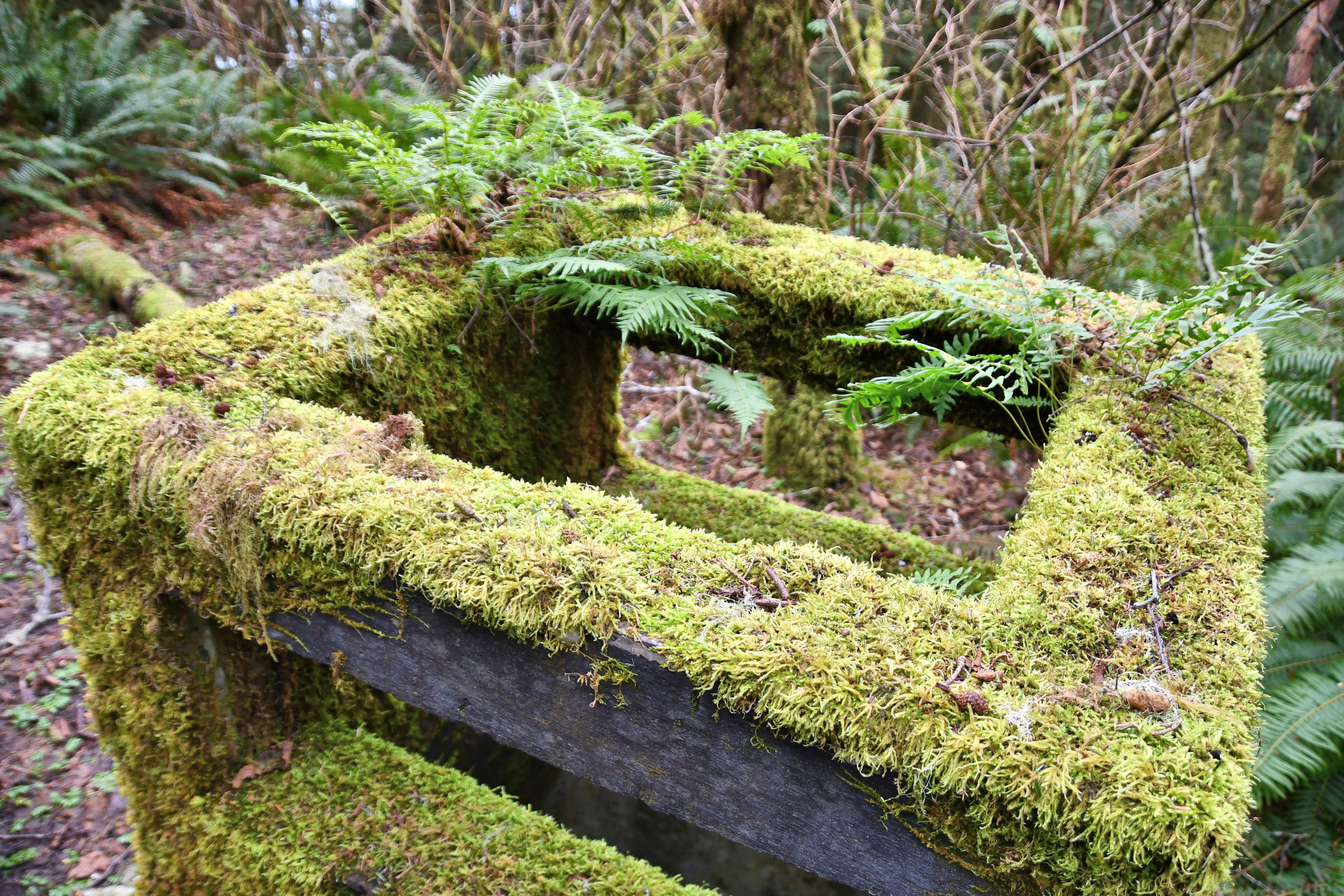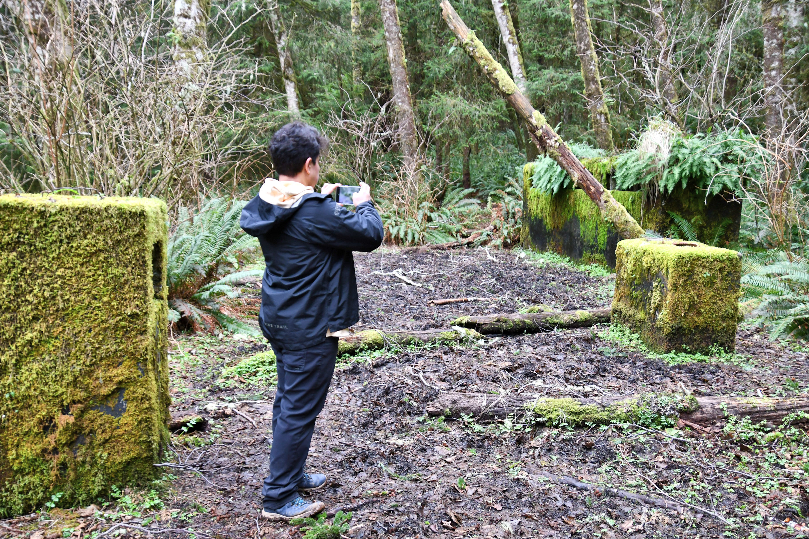 At the north end of the loop is a spur trail that heads to the sea, and we took it. First we walked through a Hiker’s Camp, which consists of three open wooden cabins, Adirondack-style, available for use by Oregon Coast Trail through hikers. Beyond that we saw concrete structures abandoned and covered in moss, and went directly off the trail to investigate!