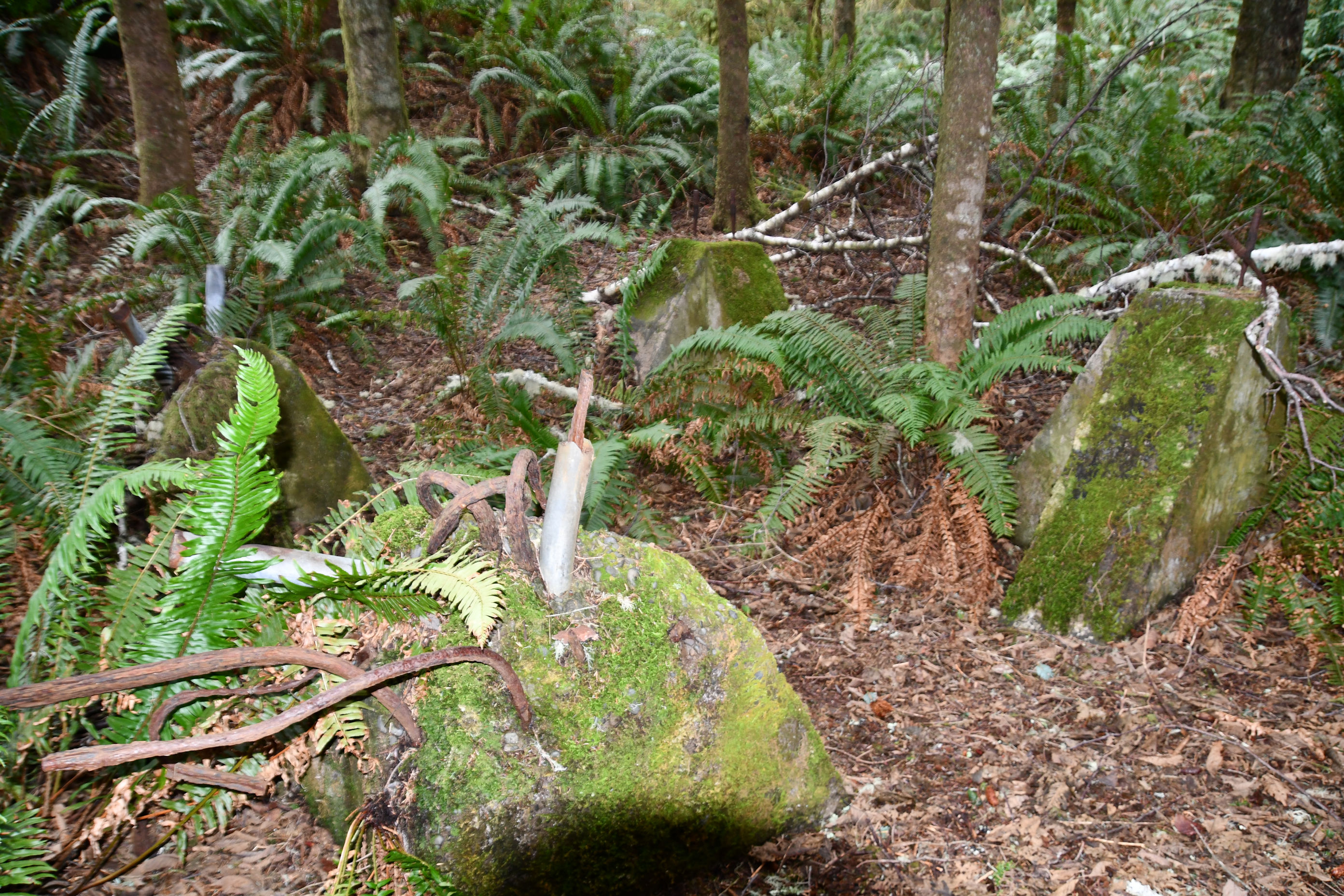 This is a different perspective of the concrete things sticking out from the roof of the bunker. The shafts of all of them were open to some degree, but filled with branches that had fallen inside.