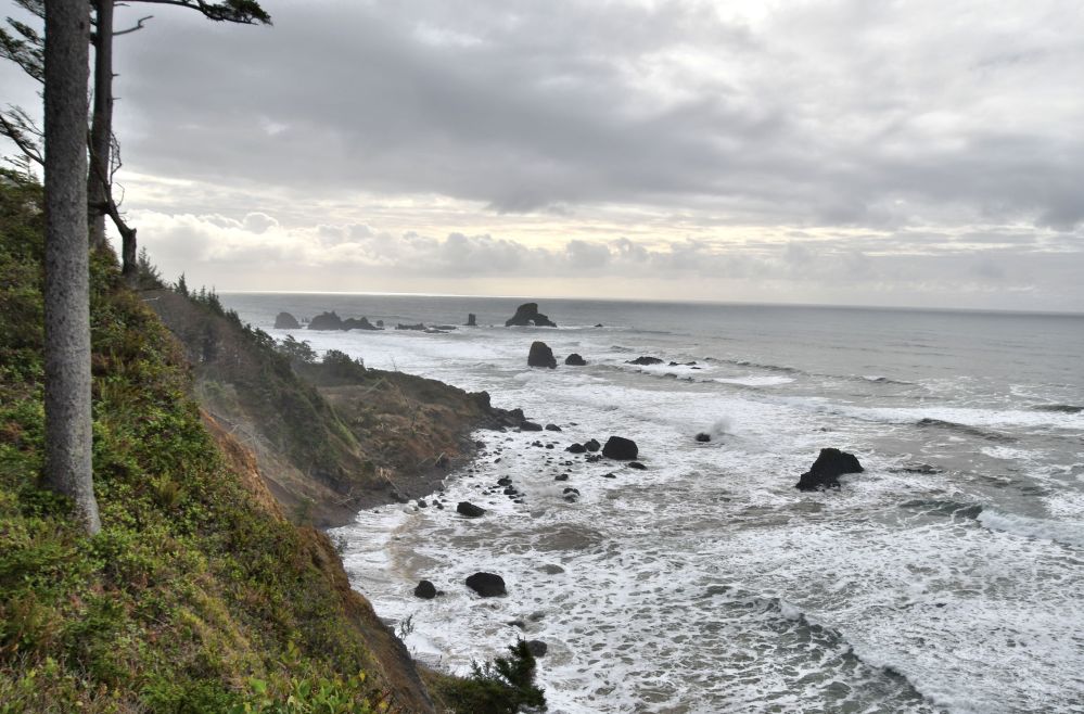 Trail reports from AllTrails.com regarding Ecola State Park sounded like heading north would result in less mud than trails to the south. We stopped for lattes at Safeway in Astoria and it was still raining, but our spirits were high. We parked at the Ecola Point Day Use Area and hiked north on the Indian Beach Trail. There was only a little light rain by that time, and we could see the sky was slowly clearing up, which was good because the air was foggy/misty which made visibility across the Pacific Ocean less clear than we would have wished.