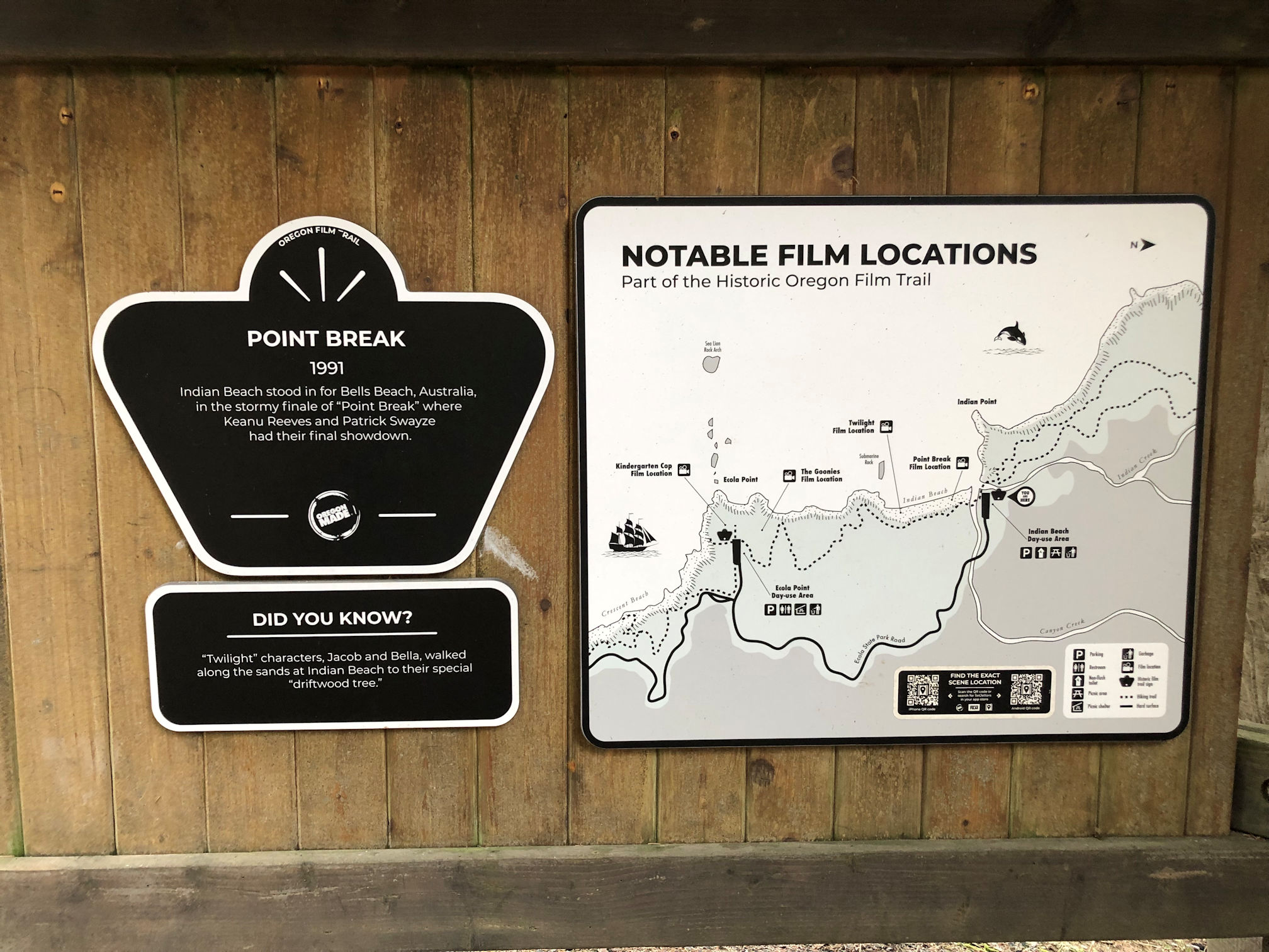 At the Indian Beach parking lot, the Clatsop Loop Trailhead leads north to the next attraction, which was another 2.5 miles (4 km) to a lighthouse overlook. At the trailhead is a sign that points to all the spots where movies were filmed on this beach. Point Break, Kindergarten Cop, Twilight, and Goonies.