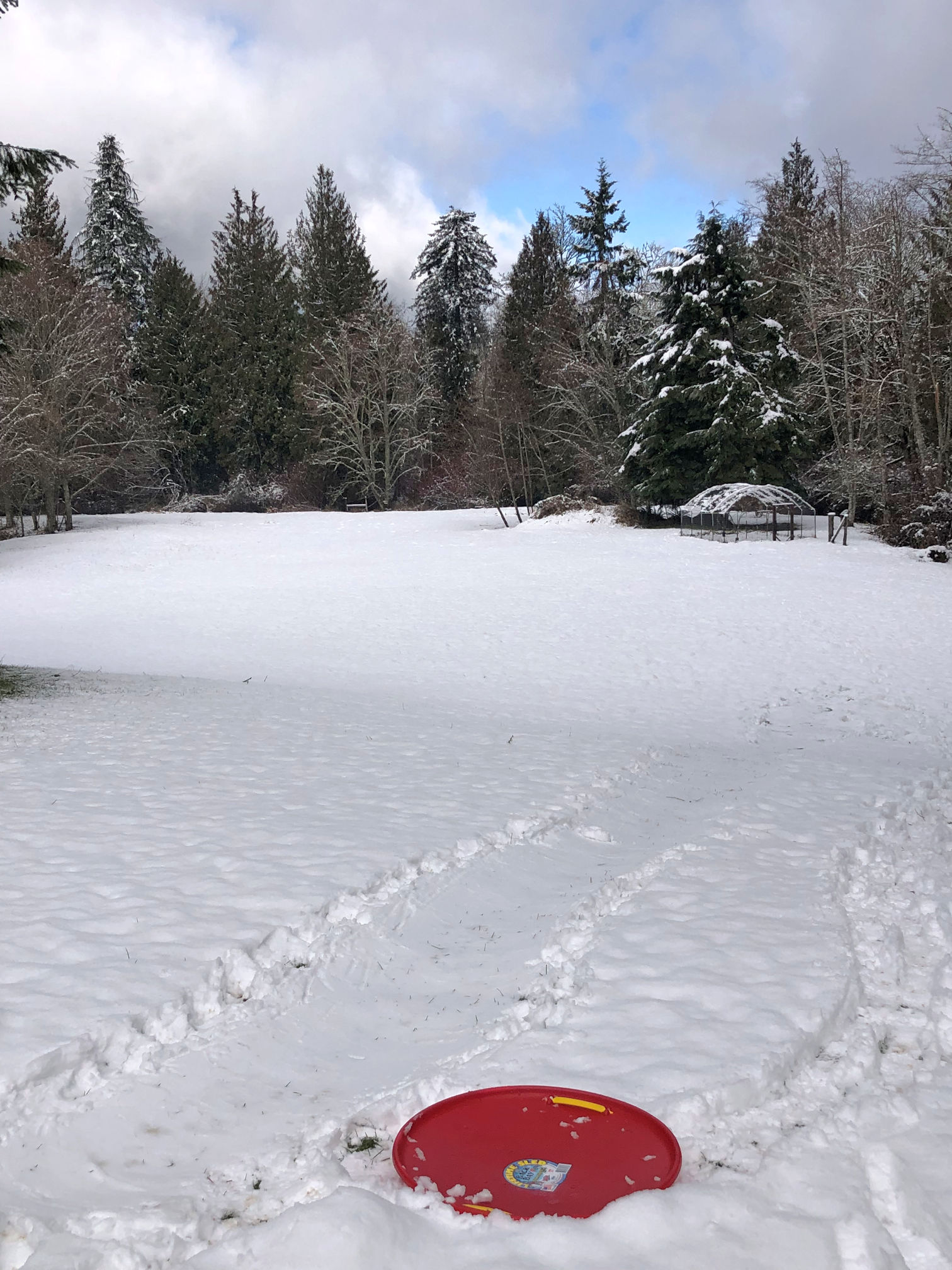 I was expecting a dusting of snow, and was surprised to measure 5 inches this morning. The forecast was for the weather to warm and for partly sunny skies. So I put on my snow gear and shoveled a path out to the yard, and then went sledding for an hour or so.