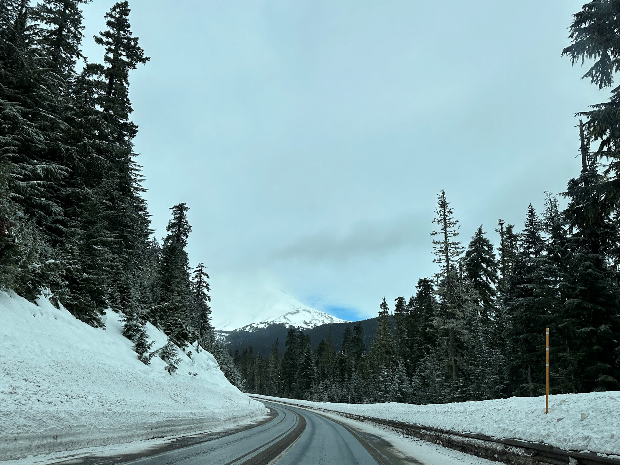 It surprised us both that there was no snow on our drive to our room in Welches, Oregon. I left snow in my yard in Rainier, and I think of the Mt. Hood area as the snowy part of this region. We only saw bits of snow here and there in shaded places. I was a little worried, but Pedro assured me that the elevation change when we get really close to the mountain would mean we would have plenty of snow the next day.