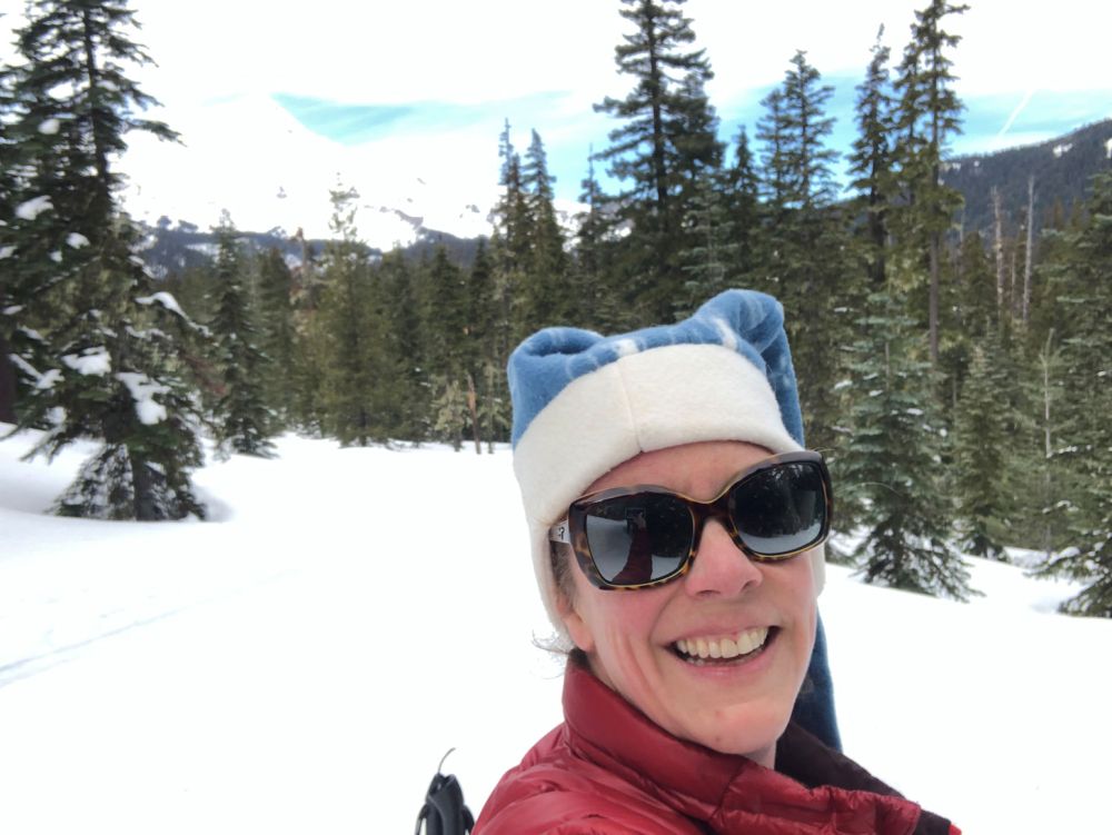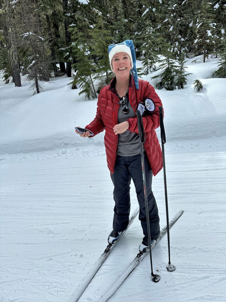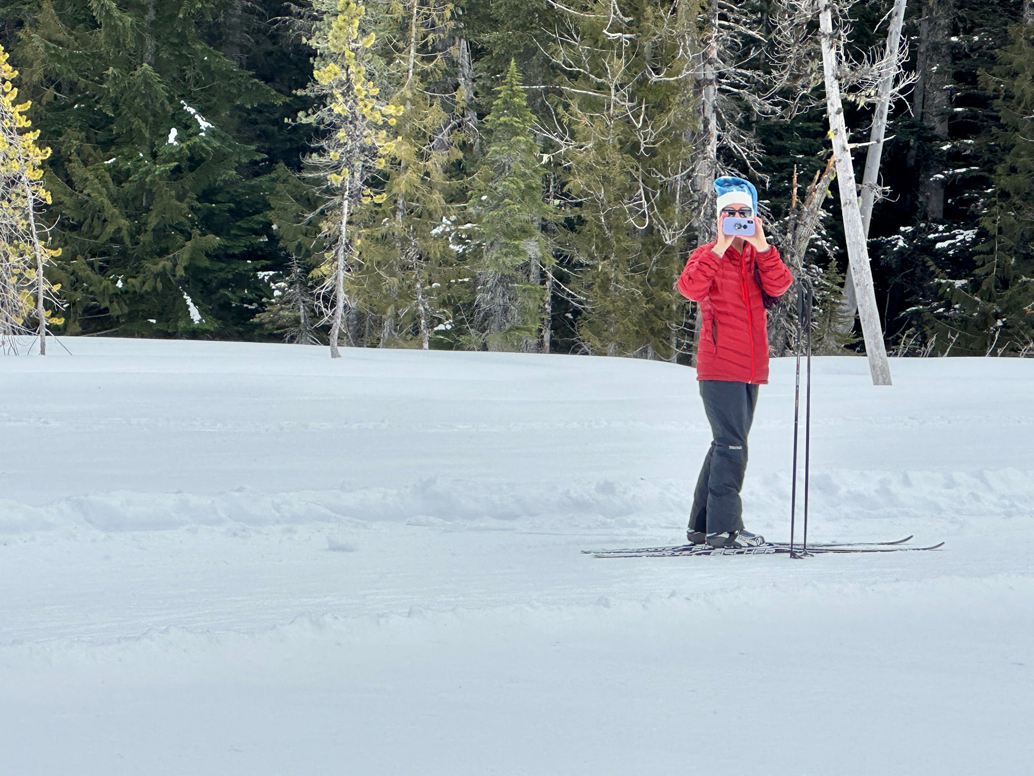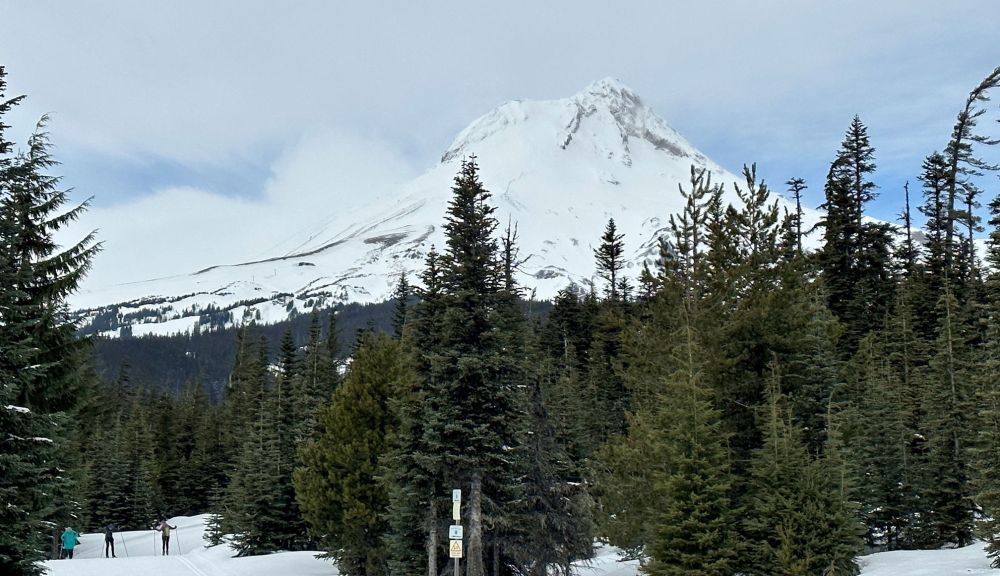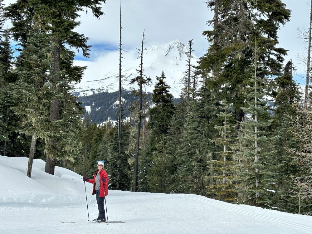 After a break, and a few exchanged texts with my man, who had gone all the way back to the beginning of the trail looking for me, I told him to come my way and I would start making my way up that hill. Oh my gosh. A mile up uphill climbing in skis. I wanted to smack my forehead. Hopefully Pedro would be fast and I wouldn’t have to climb the whole thing. I continued what I had done before, watching the people who passed me, and trying to copy their form. I got so hot from all the effort that I had to unzip my coat. If you will believe it, I began to get the hang of it! I was making pretty good progress going up that hill. I stopped to take a break at an intersection on the way, because it offered a view and a tiny bit of blue sky and I could see Mt. Hood. I went off the side of the trail to get some photos.