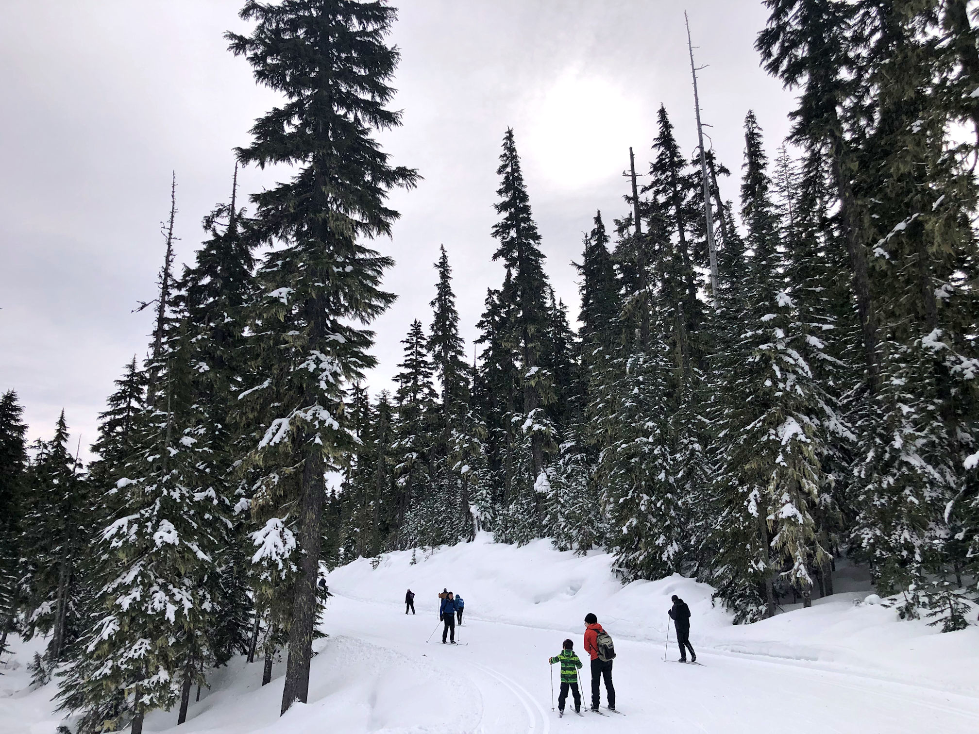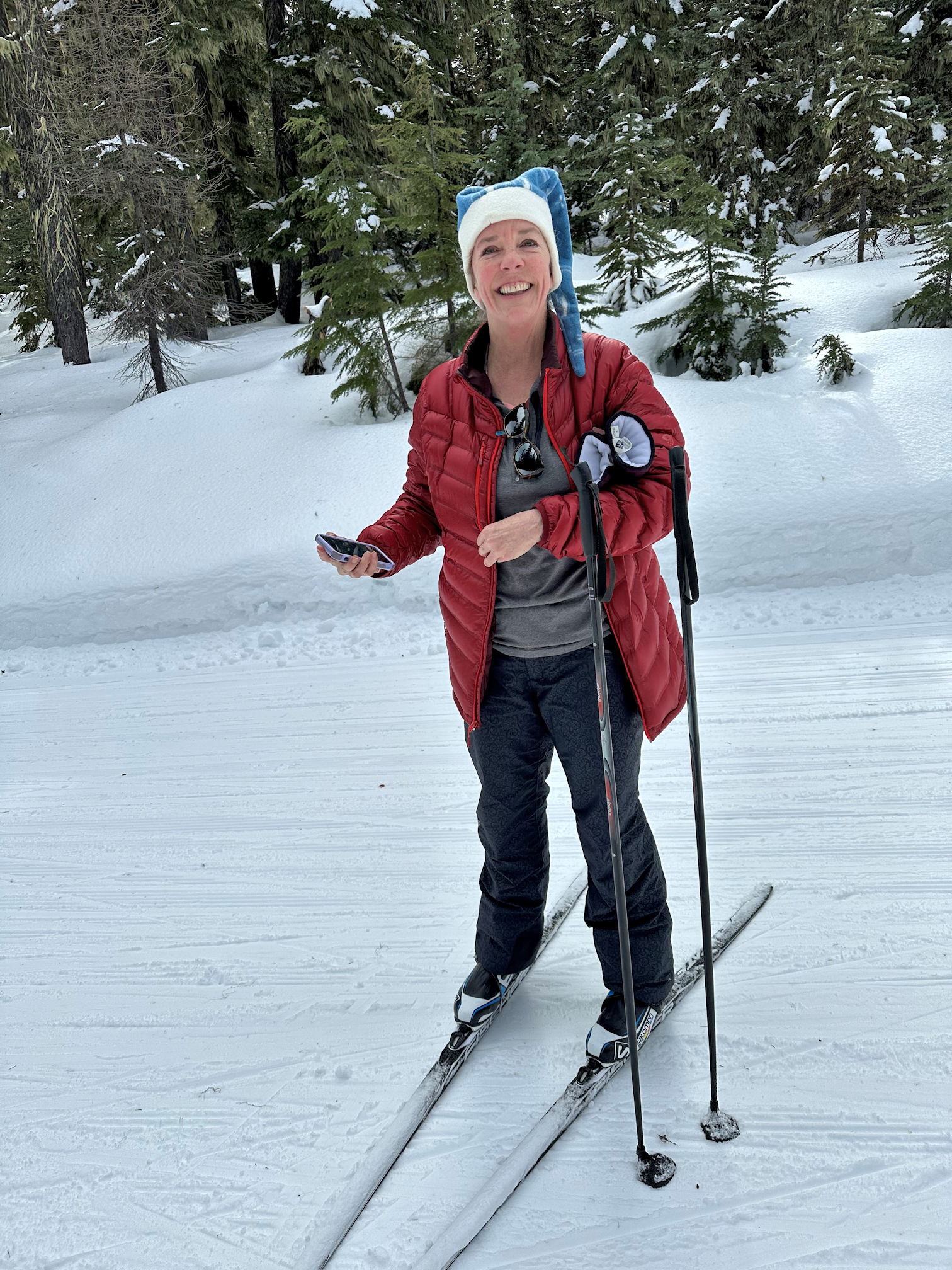 We passed multiple Sno Parks: a couple for cross-country, a couple for inner-tubing and sledding, and these were packed full of families and a million kids and their sleds and inner tubes in the snow. But we were heading for the biggest one of all: Teacup Nordic. This park has been here since 1979 and boasts 24 kilometers of groomed ski trails, with signs, maps and a warming cabin. I had never been there before but Pedro had. He knew we had to get there early or there would be no parking. We arrived somewhat early and had no problems parking.