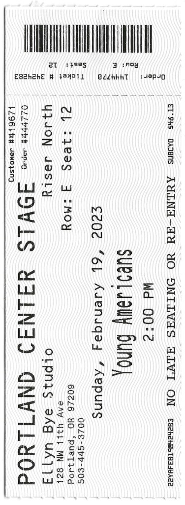 The next day we said goodbye to our cute little place and headed back into Portland in time to catch a play. This time another from Lauren Yee, who wrote the marvelous The Great Leap, that we saw last year. This one was called Young Americans, and was the overlapping of two road trips: one by a man whose bride to be had just arrived from his home country, and he met her in New York to drive her all the way home to Portland, Oregon, in order to show her the country. The next was 30 years later, when the same man surprised his daughter, returning home from a year abroad, and met her at the airport in New York to bring her along on the same road trip to try and recapture what it was like when he and her mom got to know each other. It was a clever idea, and a nice story. You see, neither the first trip NOR the second went anything like how he had planned. And yet, they both went exactly as they should. The travelers all had to confront things about themselves and each other, and decide what to do about it. I liked that the only set was a “car” in the middle of the stage, and the man almost never left the stage, but kept switching between young and old versions of himself, using a jacket and glasses as props.