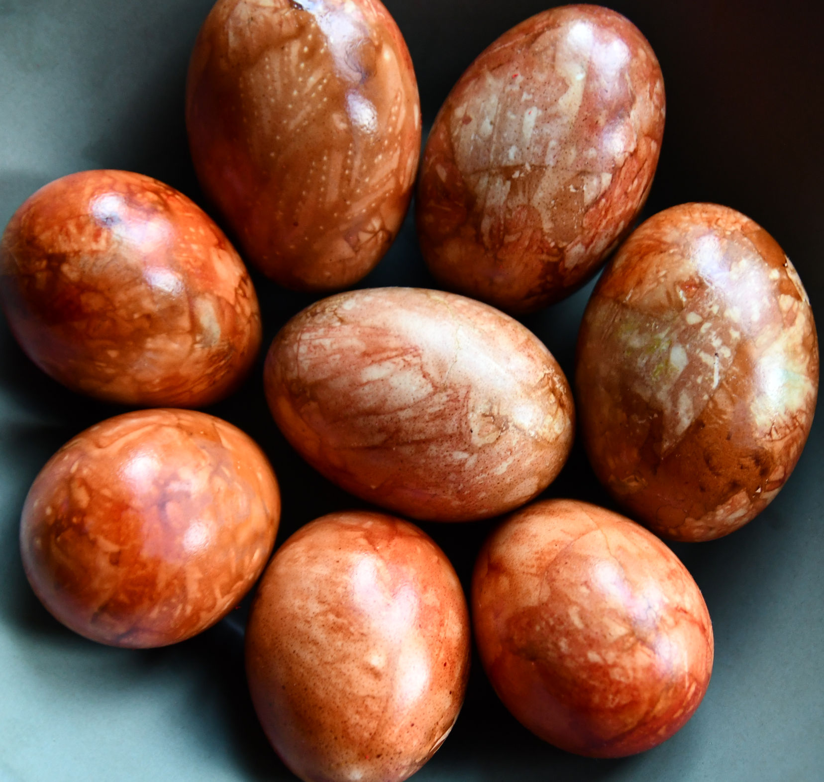 The next morning I took out the dry eggs with dye fully set and was able to brush off any remaining pieces of onion skin. I used a tiny bit of olive oil and rubbed it over the outside of the eggs to make them shiny again. Like getting a stone wet, this serves to bring out the deeper hues of the dye on the calcium shell.