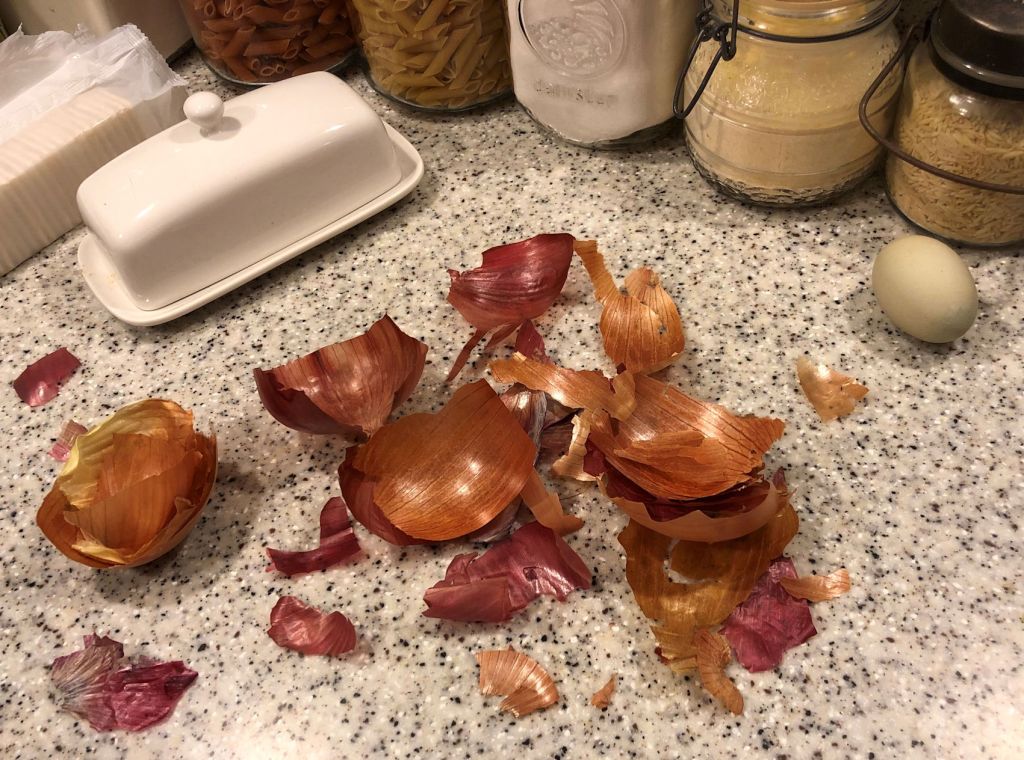I had a few onion skins. If you want to try this, keep the dry skins from your onions. I felt as though I didn’t have enough at first, so I went to the store and bought two more onions, but while I was there, I dug through the bins and collected all the skins that had fallen from other onions. I used skins from sweet, yellow, and red onions.