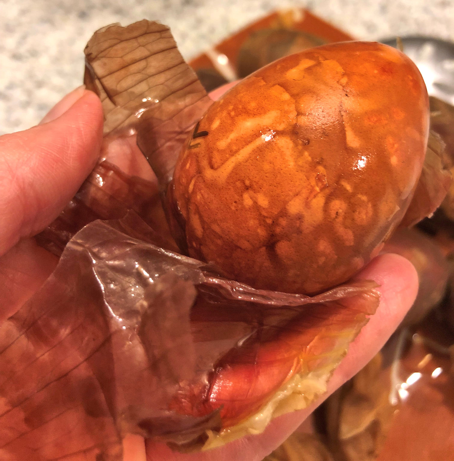 When they were completely cool, I used scissors to cut off the wrap, and gently removed the onion skin. At this stage, the outer shell is delicate, and will rub off. Also the dye is not set and will rub off. So touch the eggs as little as possible.