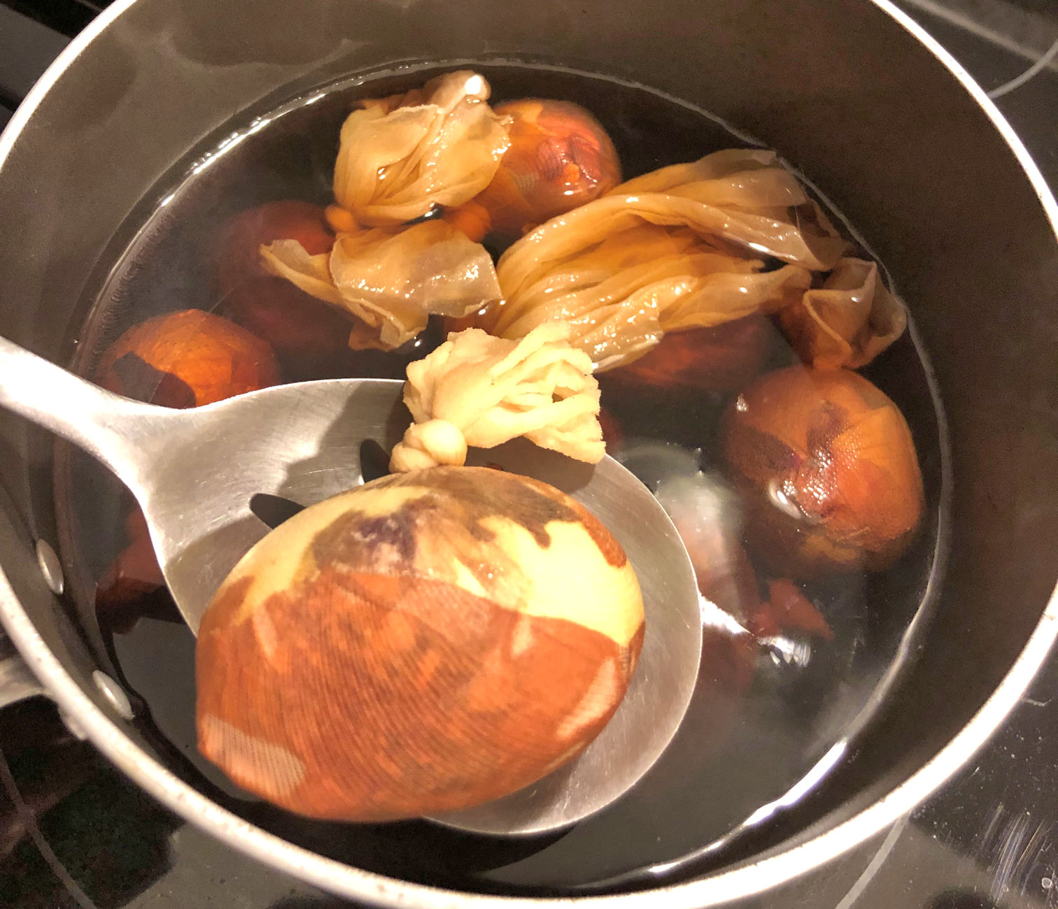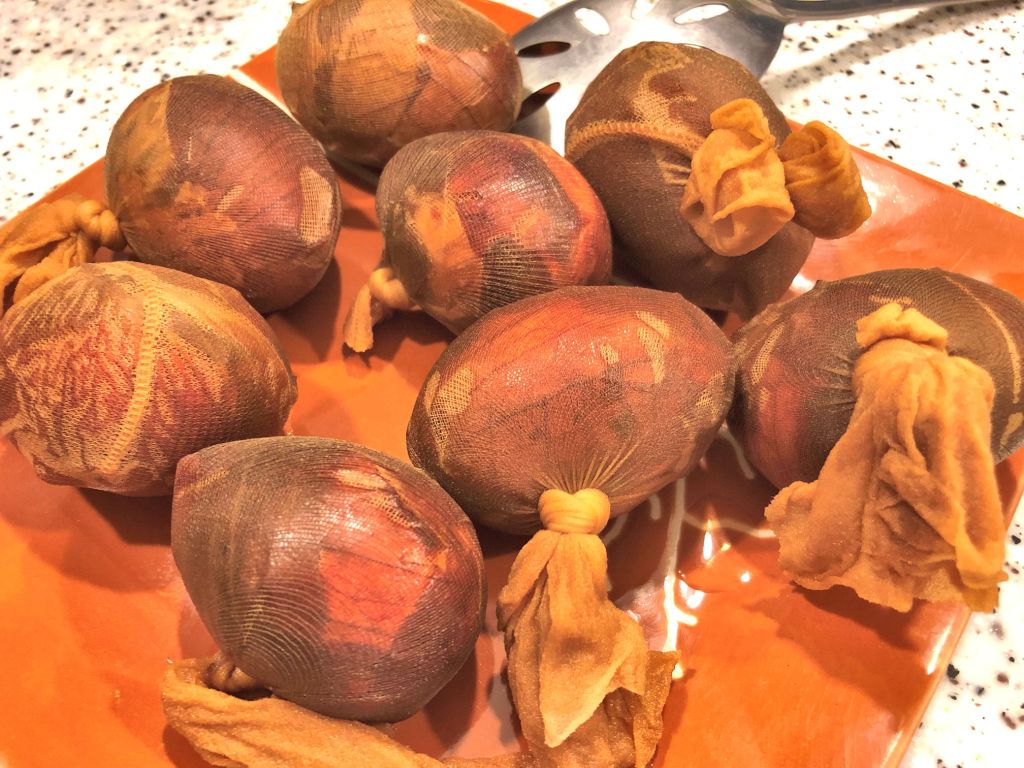 I used an old pair of nylons, and cut them up. These work brilliantly. It’s a little tricky, but try to have onion skins covering every bit of egg inside the wrap. Use different shapes and sizes of skin pieces and let them wrap around in different directions. Wrap very tightly, because the water will loosen the skins and the wrap. Place the eggs in gently and keep water at a low boil or simmer for 15-20 minutes. Don’t stir them. Don’t fuss with them, or you could move the skins around. Turn off heat and let them cool. I took them out of the pot with a slotted spoon.