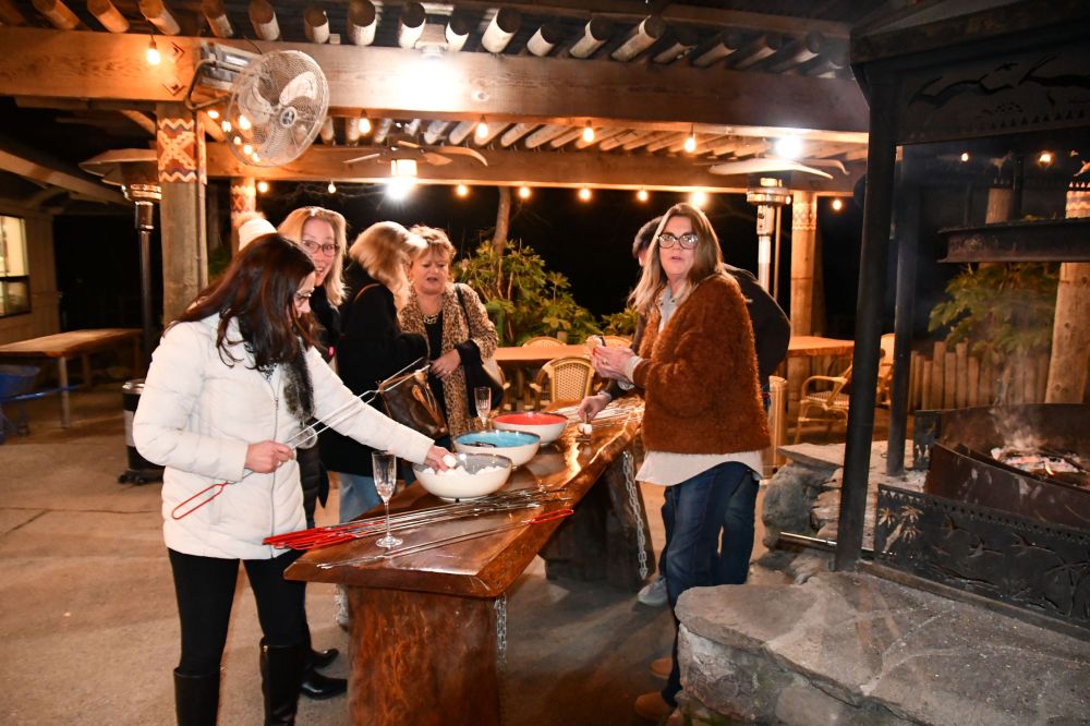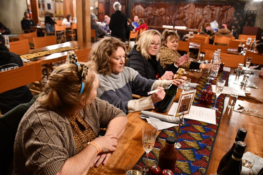 Dinner was scheduled for 8 pm, so we had lots of time to chat and get to know each other. I had helped Margaret put together a snack tray beforehand (you can see the hard boiled eggs from our egg-decorating earlier that I mentioned in my last blog post!), and another person brought snacks too. I was disappointed to realize that I had not thought to dress in theme, but most of the others did, arriving in animal spotted prints and even animal ears. Ah well, next time! We chatted till it got dark.