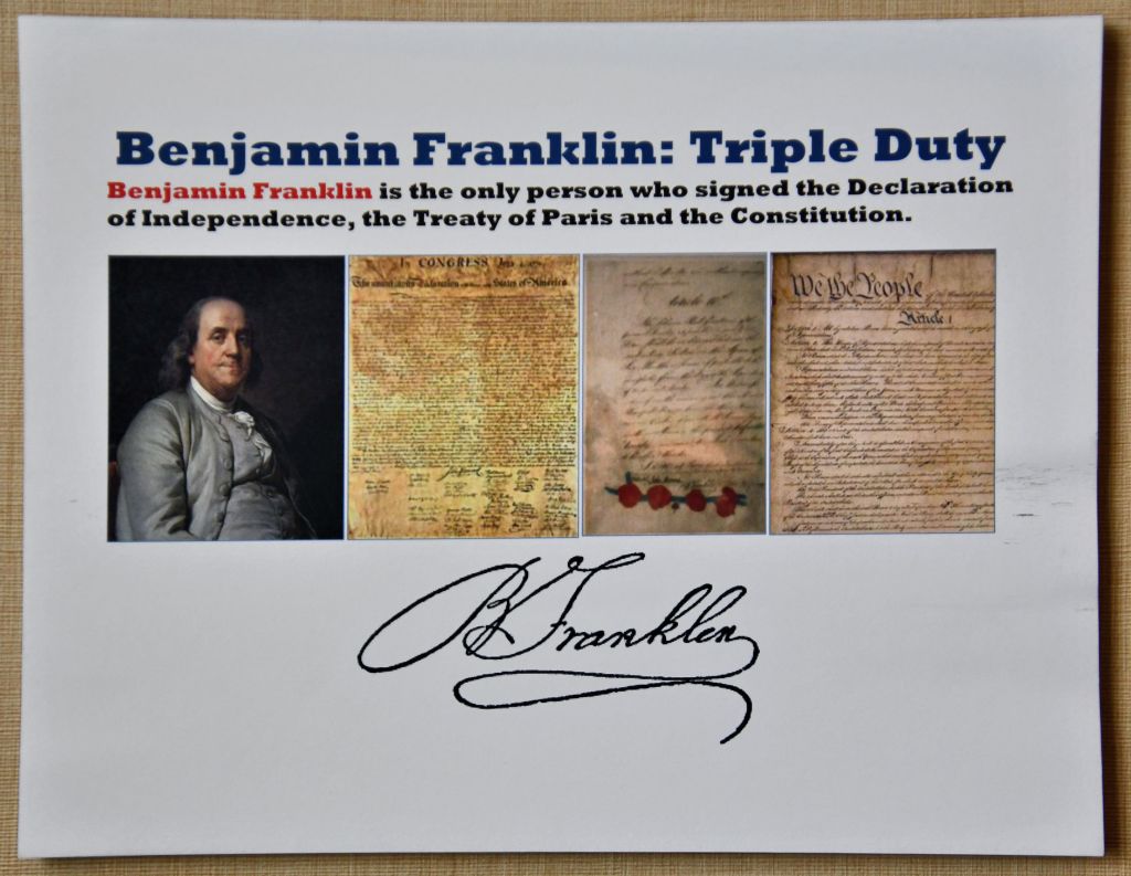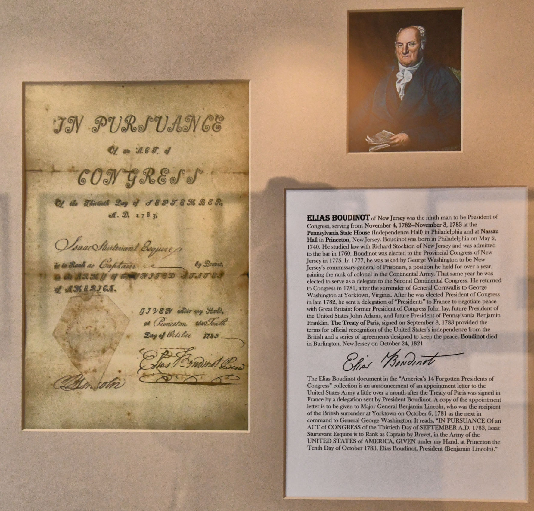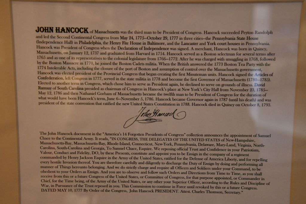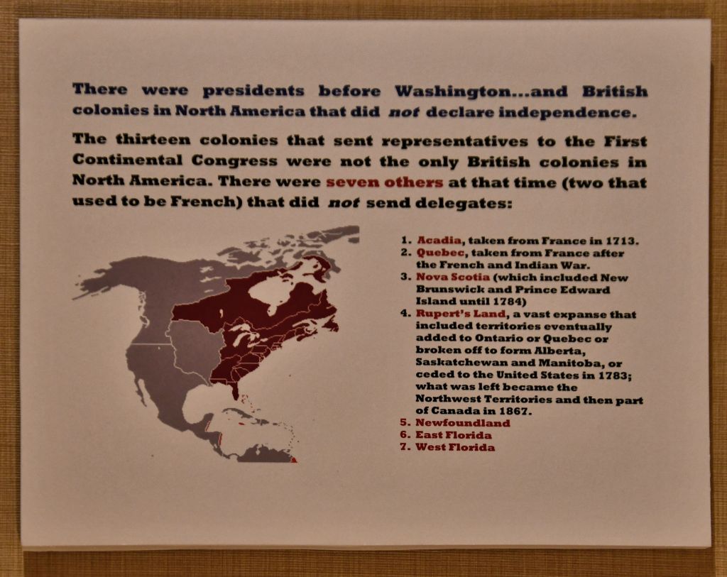 The display says that while George Washington was the first president under the second constitution (there were two?), he was not the first president of the independent United States. Before him, there were 14 others, who held the title of President of the Continental Congress. The First and Second Continental Congress was a meeting of delegates from the colonies that would become the United States. Twelve of the thirteen colonies sent a delegate (Rhode Island was not represented), and they met in Philadelphia in September-October of 1774. Philadelphia was our nation’s capital city in the beginning, and it was moved to Washington, D.C. in 1800.