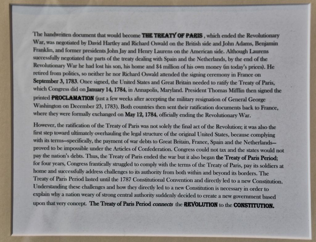 Sorry for all the text above. I posted those so you could read if you want to. Basically, it explains that a lot of stuff was going on at this period in world political history. The colonies were separating from Great Britain, they owed money to everyone, they were bound by negotiated treaties, and they were simultaneously trying to start a new country. Some of the biggest names were in the thick of it: Benjamin Franklin, John Adams, George Washington, as well as former “Presidents” I am not so familiar with, like John Jay, Henry Laurens, and Thomas Mifflin.