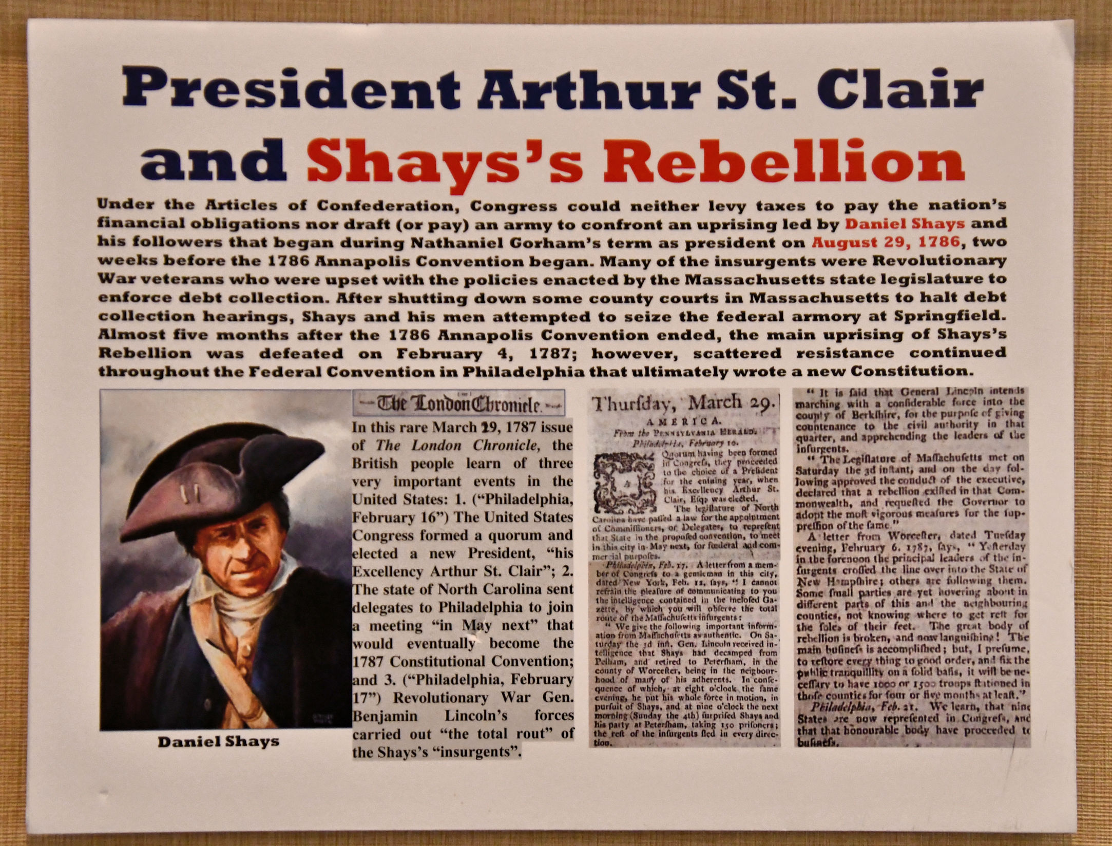 Thomas Mifflin was the tenth President of Congress, who received Washington’s resignation. Next was Richard H. Lee, Nathanial Gorham, and then Arthur St. Clair. Segments of the population were angrily opposed to the direction the new country was taking, and particularly angry about enforced debt collection. One of the most significant uprisings was Shays’s Rebellion that began during Gorham’s term. Arthur St. Clair was President of Congress when Shays’s Rebellion was put down.