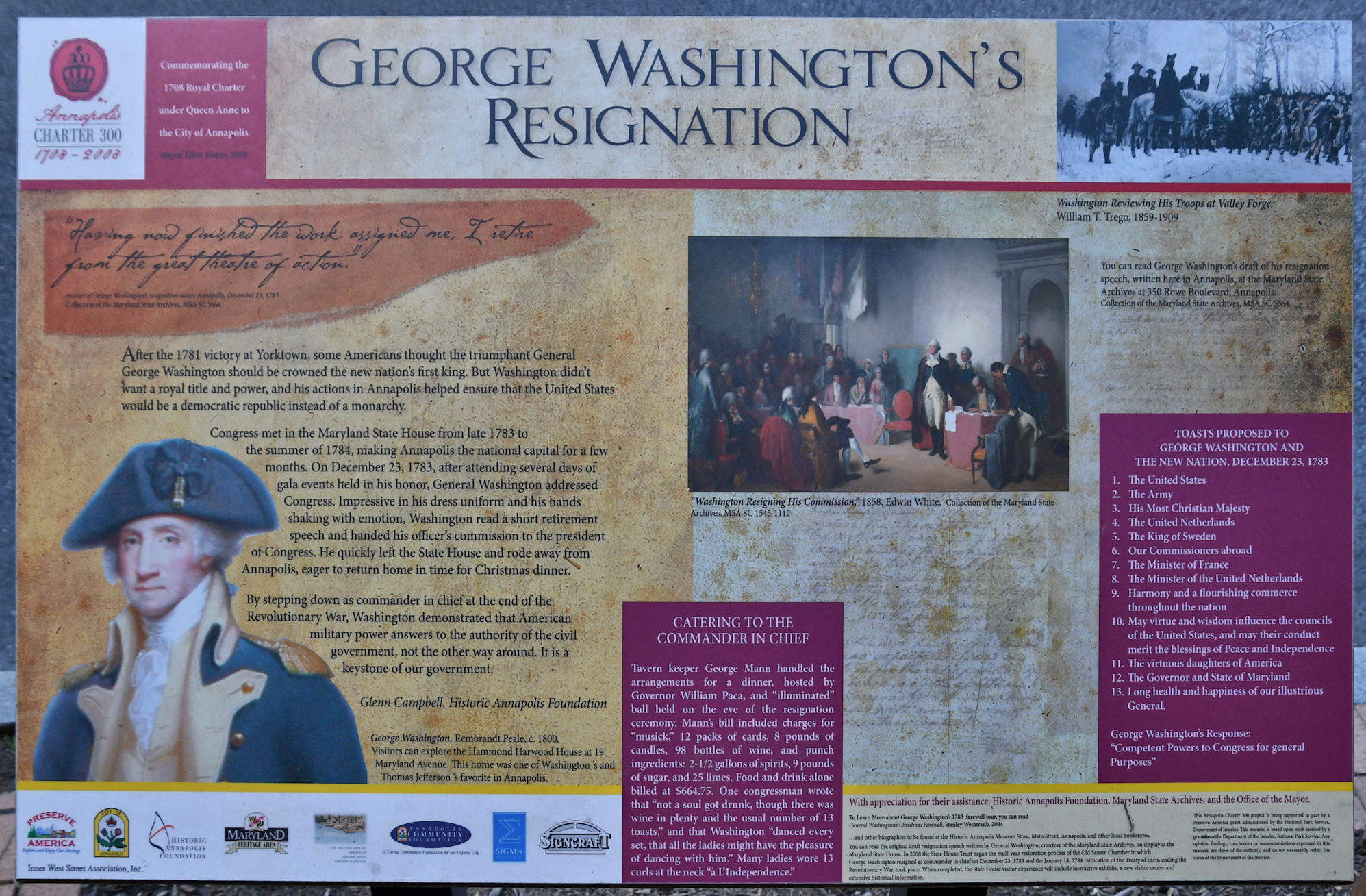 George Washington resigned about this time, too. It was a very big deal and it happened right here in Annapolis. Asked to be the next monarch of the new country decades earlier, Washington had refused to participate. When later asked to be President instead, the military general and war hero was willing to serve. Washington held true to the ideal that the new country would be a democracy. He believed that a military should serve the civil government, and thus his resignation of his commission at the conclusion of the war was intentional signaling of this stance.