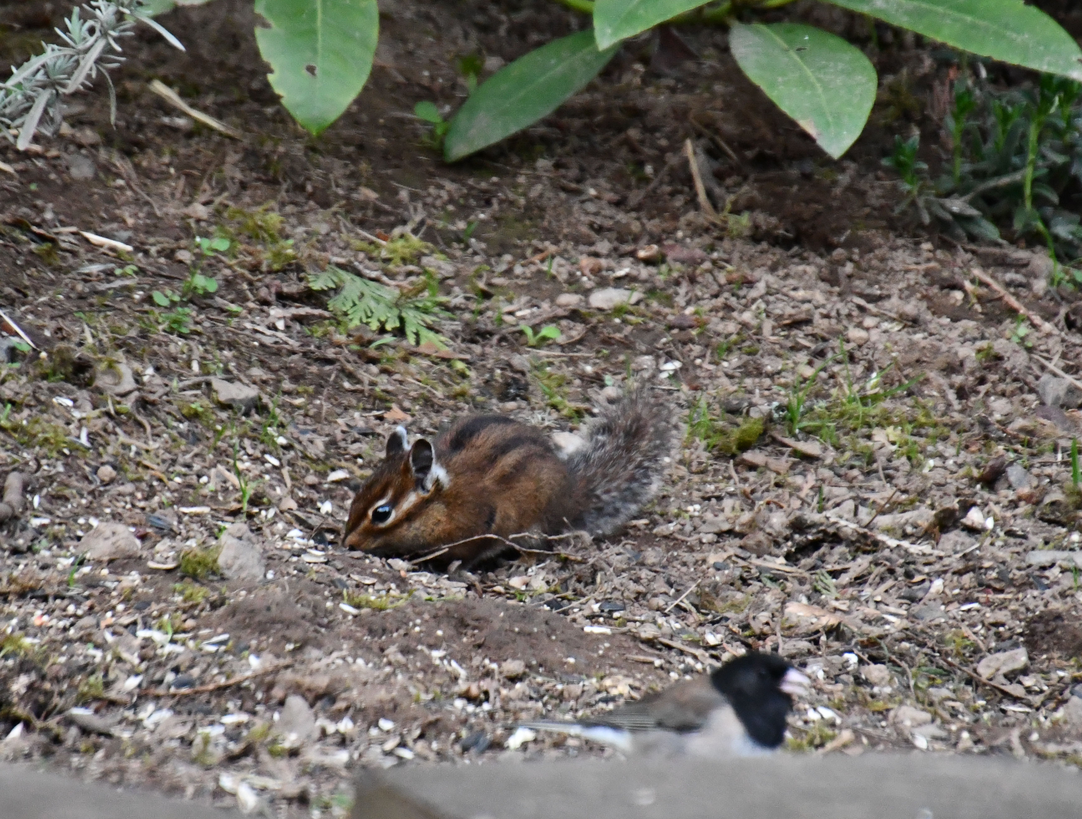 The chipmunk was clearly flummoxed. I watched it change its mind multiple times, hopping closer to the feeders, then running away, then trying to come at the feeders from the back, then running away again. Finally, it stood up on its hind legs and gazed wistfully at the seeds and the big, scary squirrel in the way, and hopped dejectedly back home. From what I could tell, momma squirrel never noticed a thing.