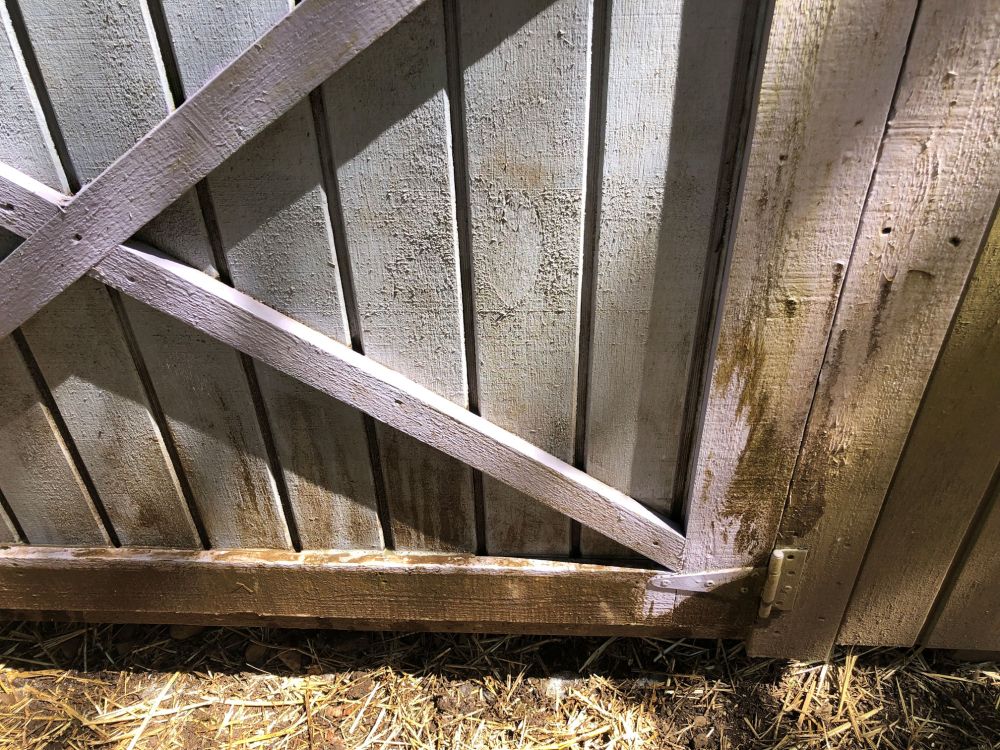 Furthermore, the whole thing was turning green from the constant moisture around here, and the bottom 18″ on the uphill side was so splashed with mud that it was 1/4 inch thick. I’m sure the chickens didn’t care because the inside is sturdy and dry and spacious. But I am in make-this-property-look-good mode.
