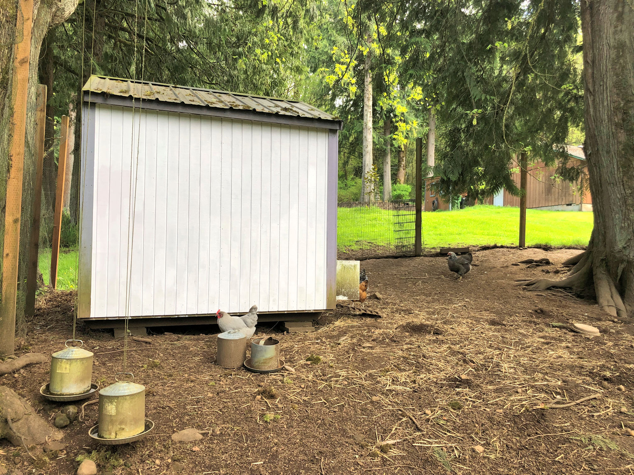 The new owners are going to be oblivious when they see this clean, mostly white henhouse and they will think, “awww.” And then the rains will come and it will turn green and muddy again. Well! It will only be surface dirt and the wood structure is much better protected now.