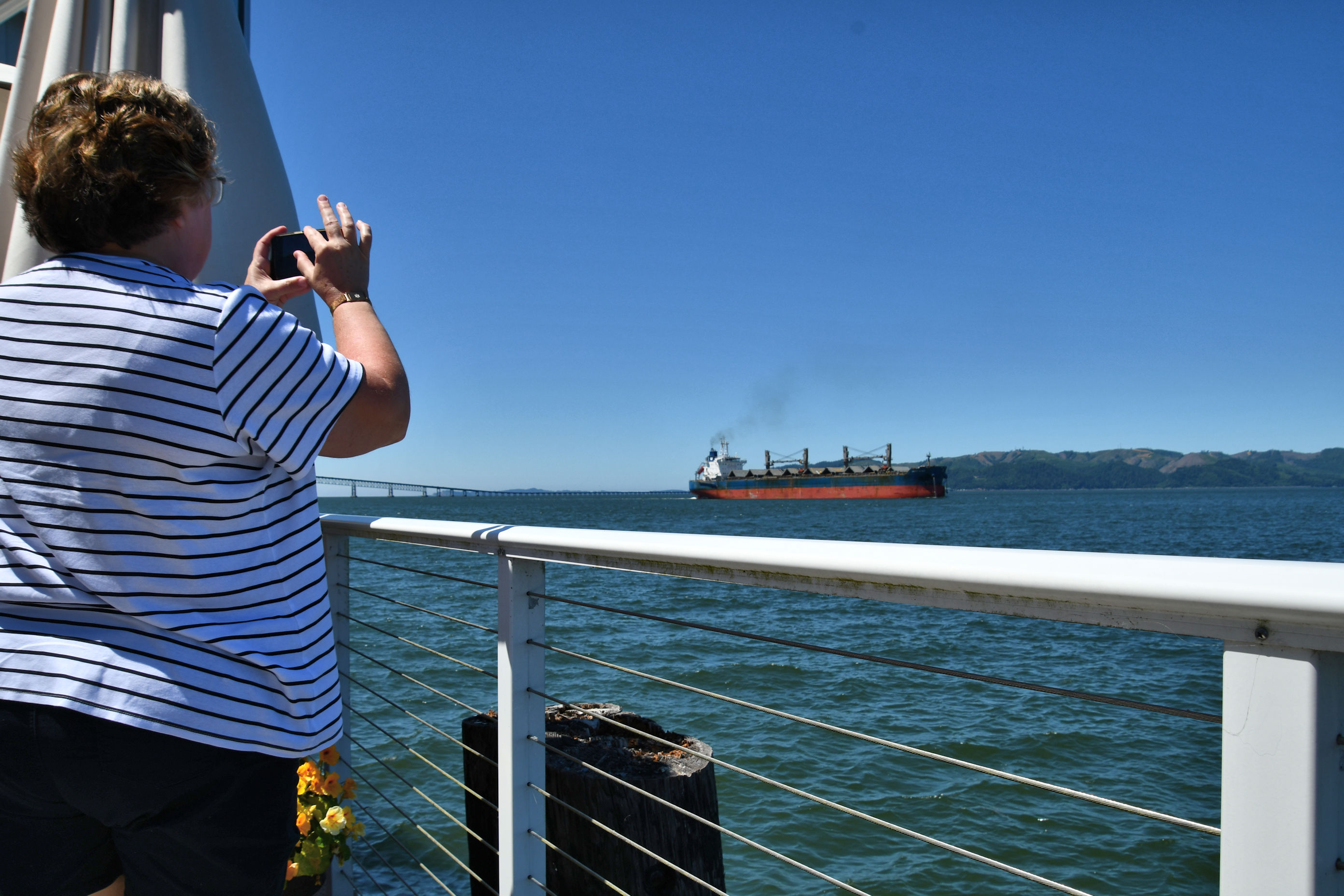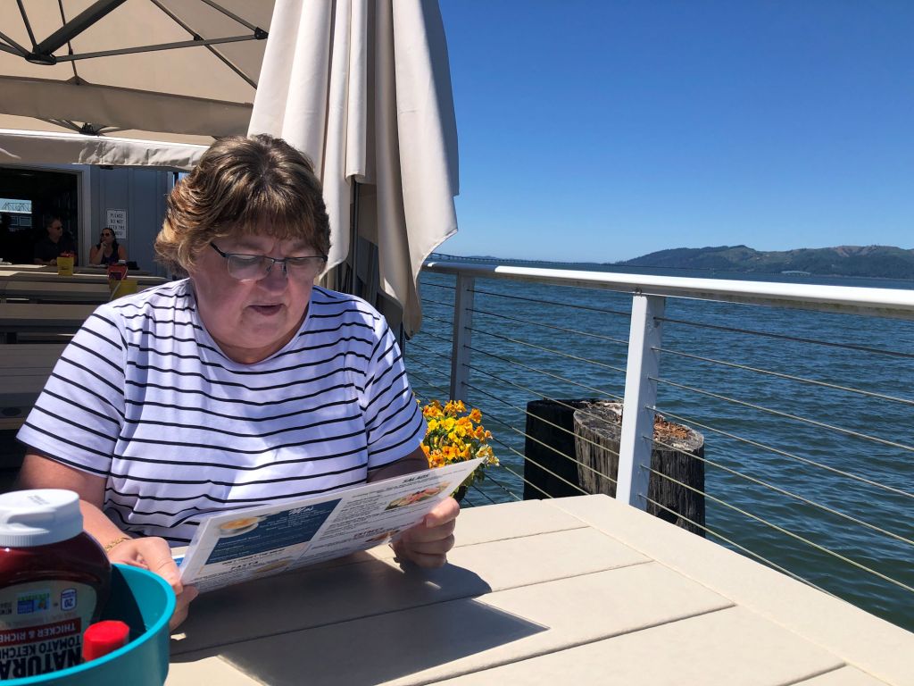 We went to Astoria because it’s super close and Sandy had checked ahead of time and discovered that Thursday it would be actually sunny. Here in Oregon, it can be warm and sunny everywhere else and still grey and drizzling and cold along the coastal towns. So ocean sunshine is a special treat and worth the drive. By the time we arrived, we were starving. One great thing about Astoria is that there are wonderful restaurants. We were in the mood for seafood and went to reliable Mo’s and asked for outdoor seating.