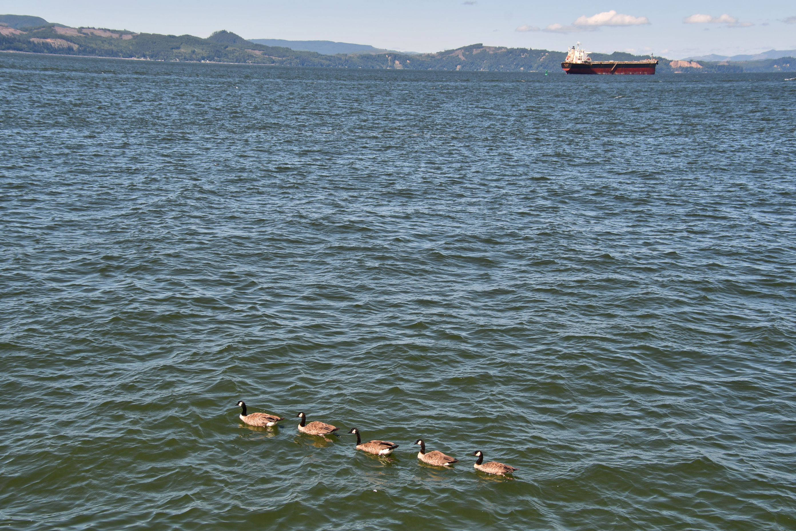 A row of geese in the Columbia River