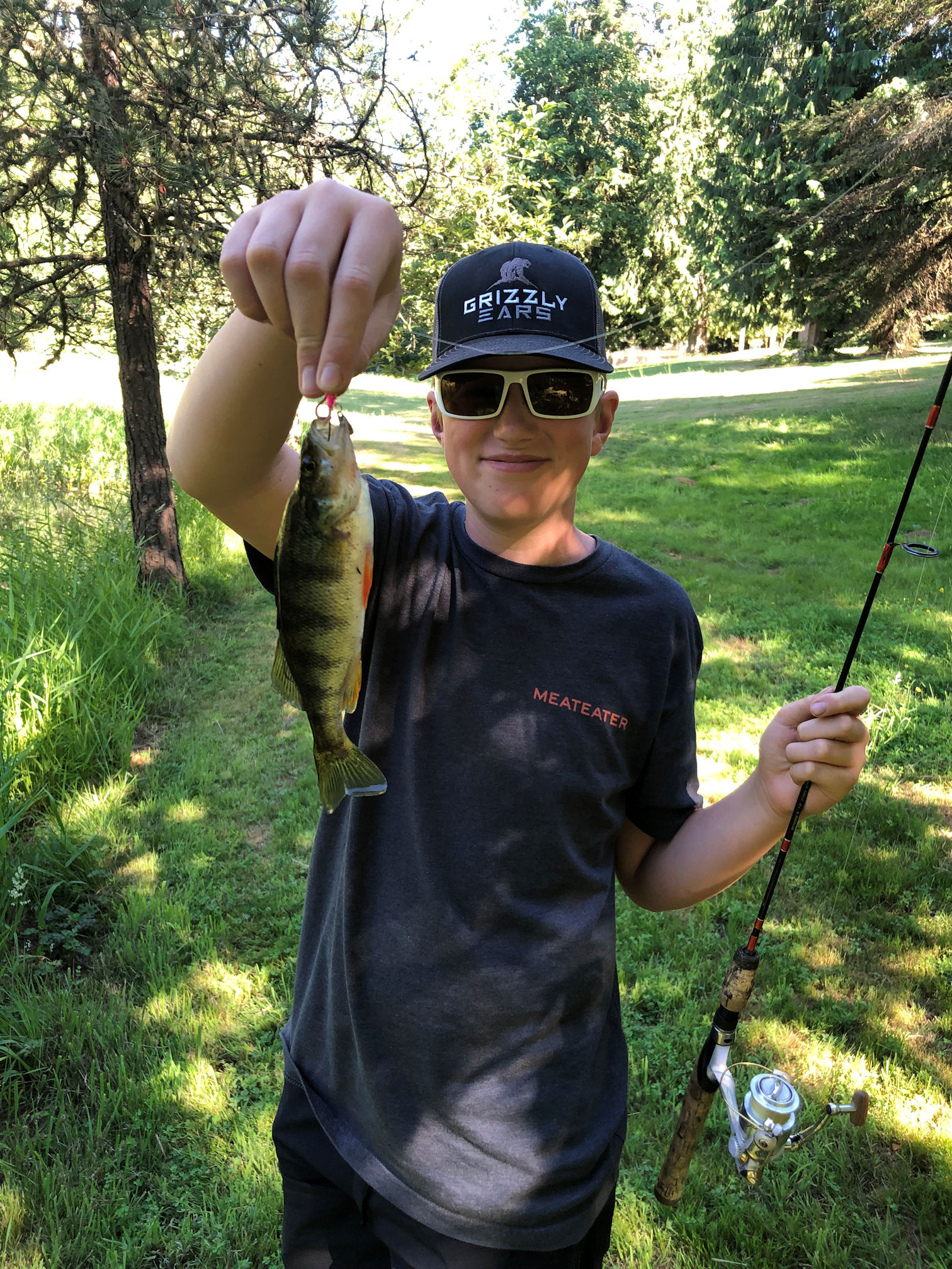 In the past few years, a Great Blue Heron has made my pond its regular hunting ground. I was worried that it had decimated the fish population. They barely jump anymore, and I’m never sure if it’s actually fish jumping, or bullfrogs. But Brandon answered my question. He fished for hours, caught about 14 perch he said, and threw them all back.