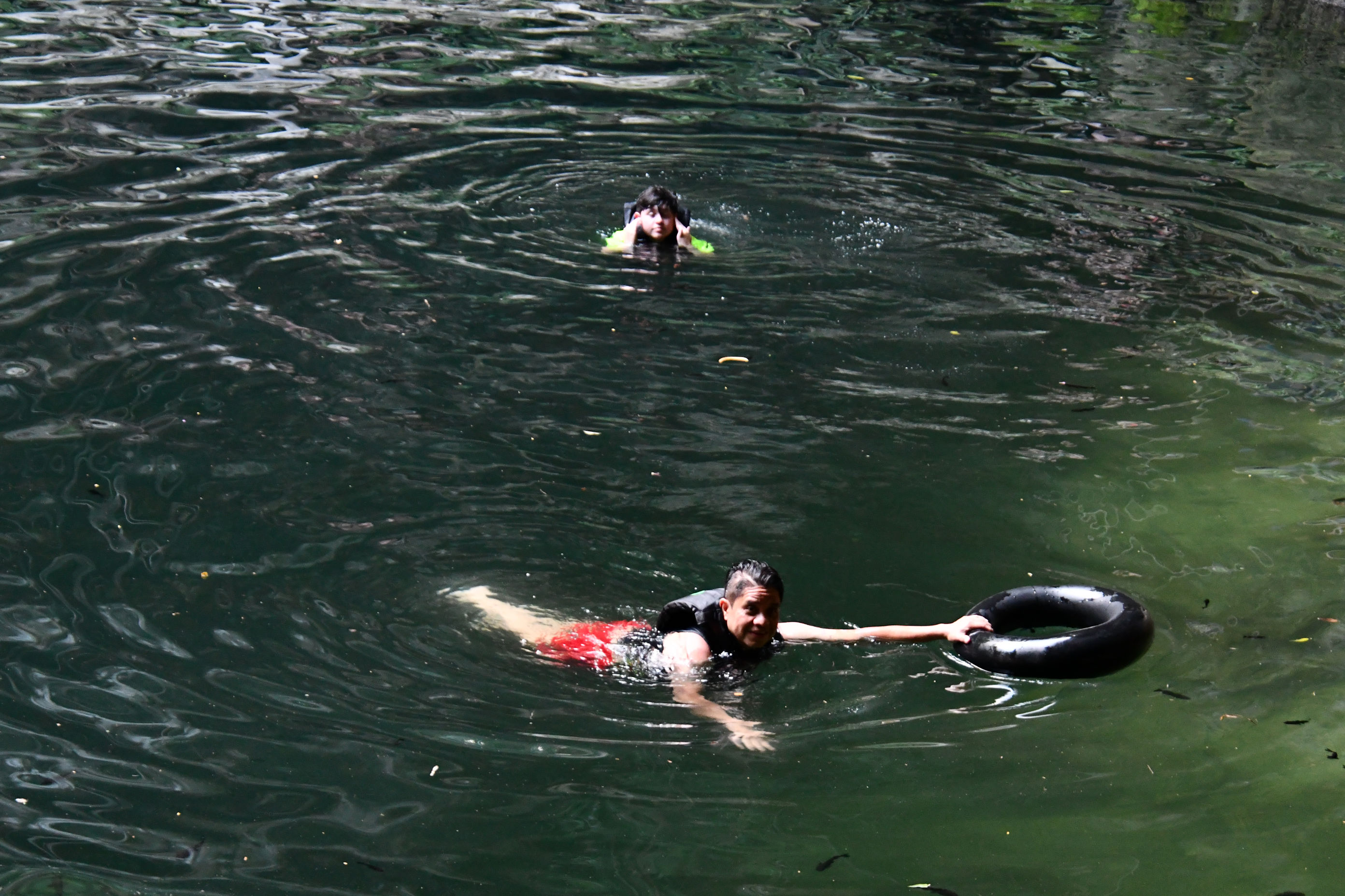 We were told at the pay kiosk that life vests were mandatory. When we arrived, no one was around to enforce the rules and Pedro and I are strong swimmers, so we declined to use them. Pedro tried it for a little while, but the vest rose up around his neck and made swimming awkward, and he ditched it. When we confirmed for Liam that we could not find the bottom of the pool, he felt more comfortable wearing a vest. There were also inner tubes we could use. (None of the other people there wore life vests either.) One reason you may wish to use a life vest is because the pool is deep and you can’t stand. So you need to bring an inner tube, or periodically swim to the edge and hold onto something to rest.