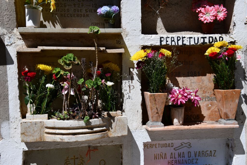 It is apparently the only cemetery within the city limits for a hundred years and finally the crowding was so difficult to deal with, a new cemetery was created outside of town. Pedro was able to explain a lot of the rules for this cemetery, such as how many years a body is allowed to rest unbothered, before the cavity is opened up and reused. Even if there is a fee being paid to hold a vault forever, if the cemetery cannot make contact with any descendants for a certain number of years and it appears the spot is abandoned, it will be put back into use by a new family. Frequently, members of the same family share the space. The older body will be carefully and respectfully gathered and put into a bag, and the bag is then placed inside the casket of the more recently deceased person. Then the new casket with multiple occupants goes back into the wall and the gravestone is updated.
