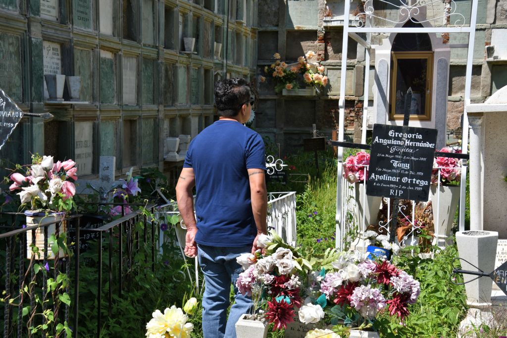 Pedro thought he remembered where his grandmother was buried. He turned and walked directly to the back of one section and stopped once more in front of a grave site. He talks to us often of his grandmother, who was still around after his mother died. He has no stories to tell of his grandfather, who died before he was born.