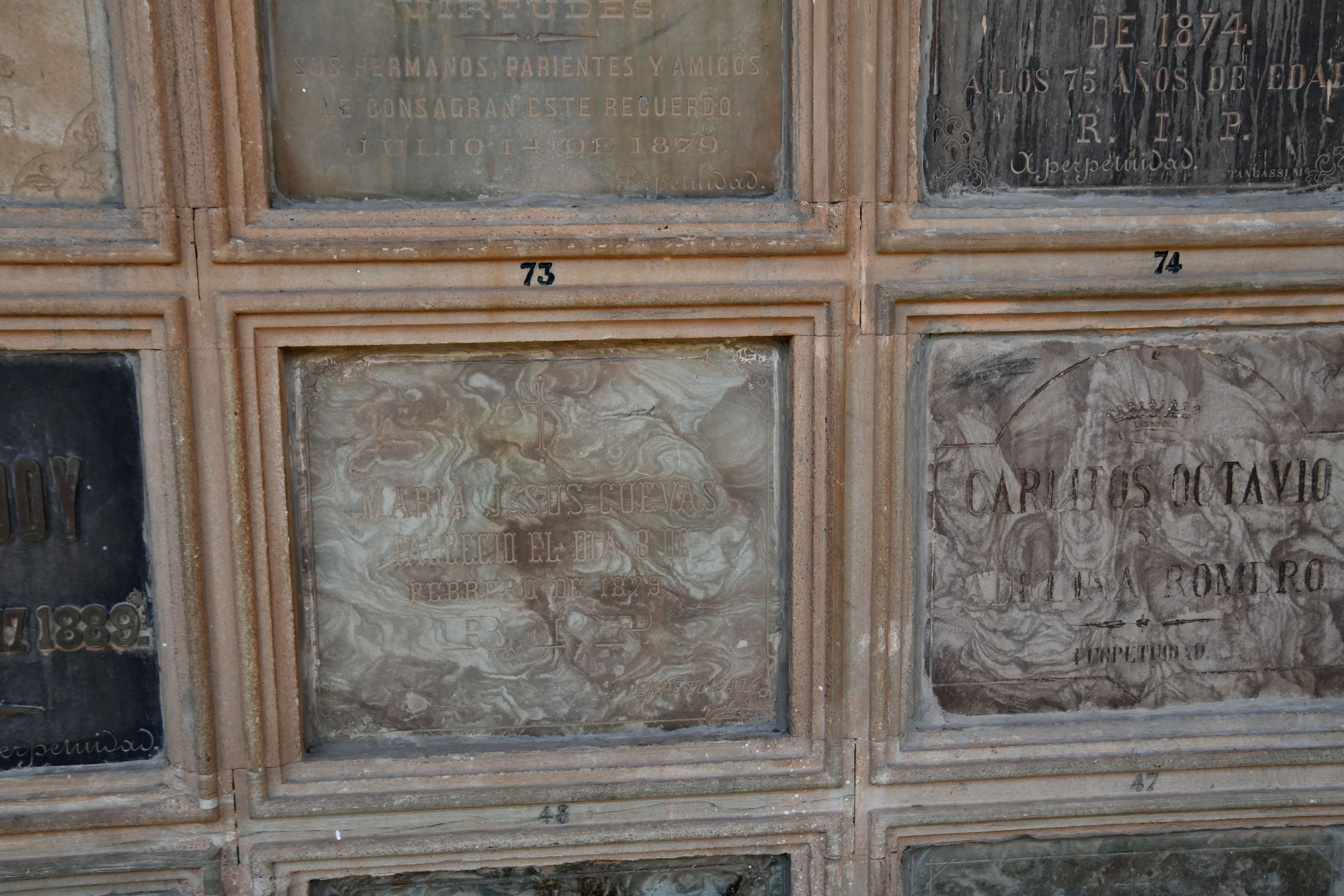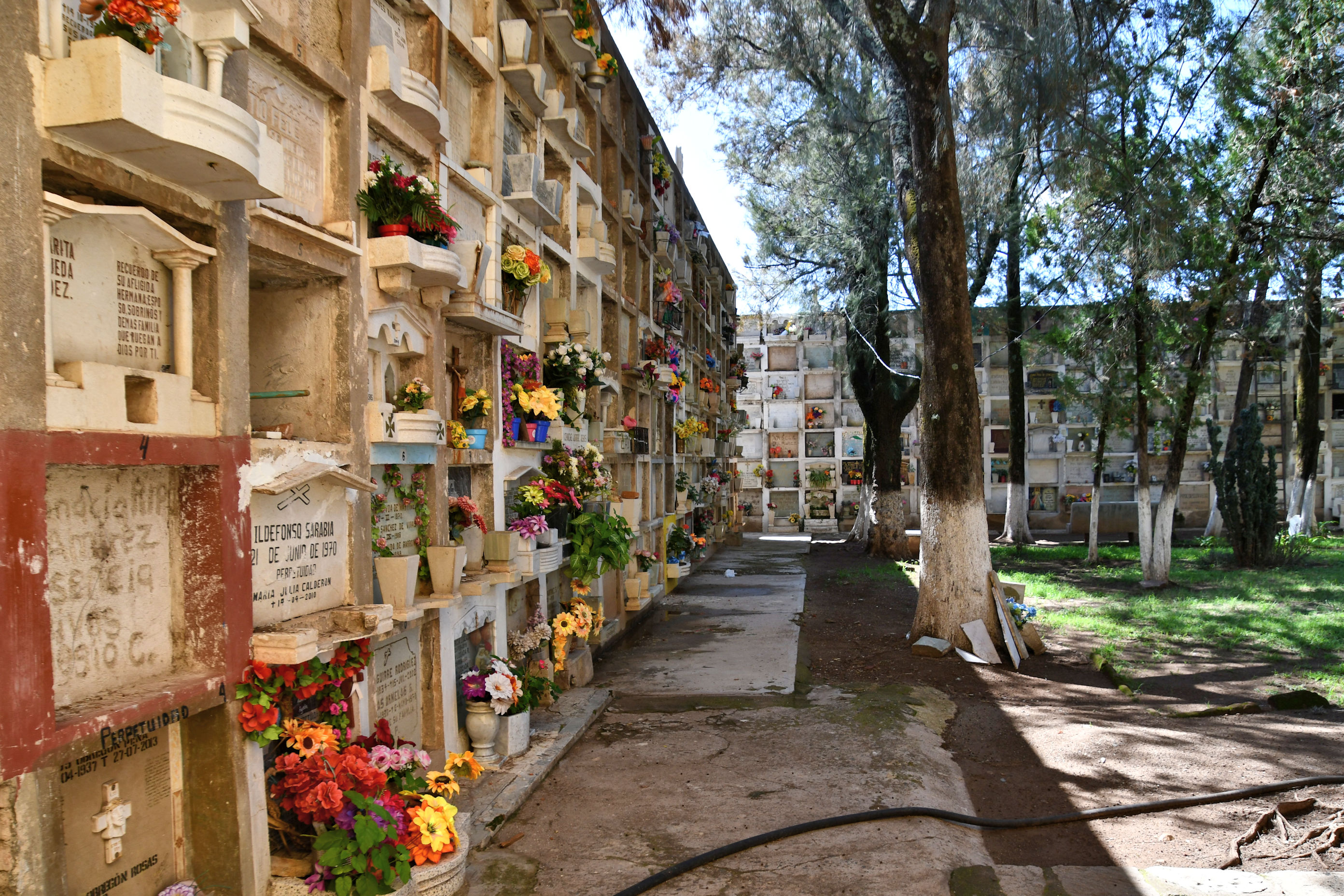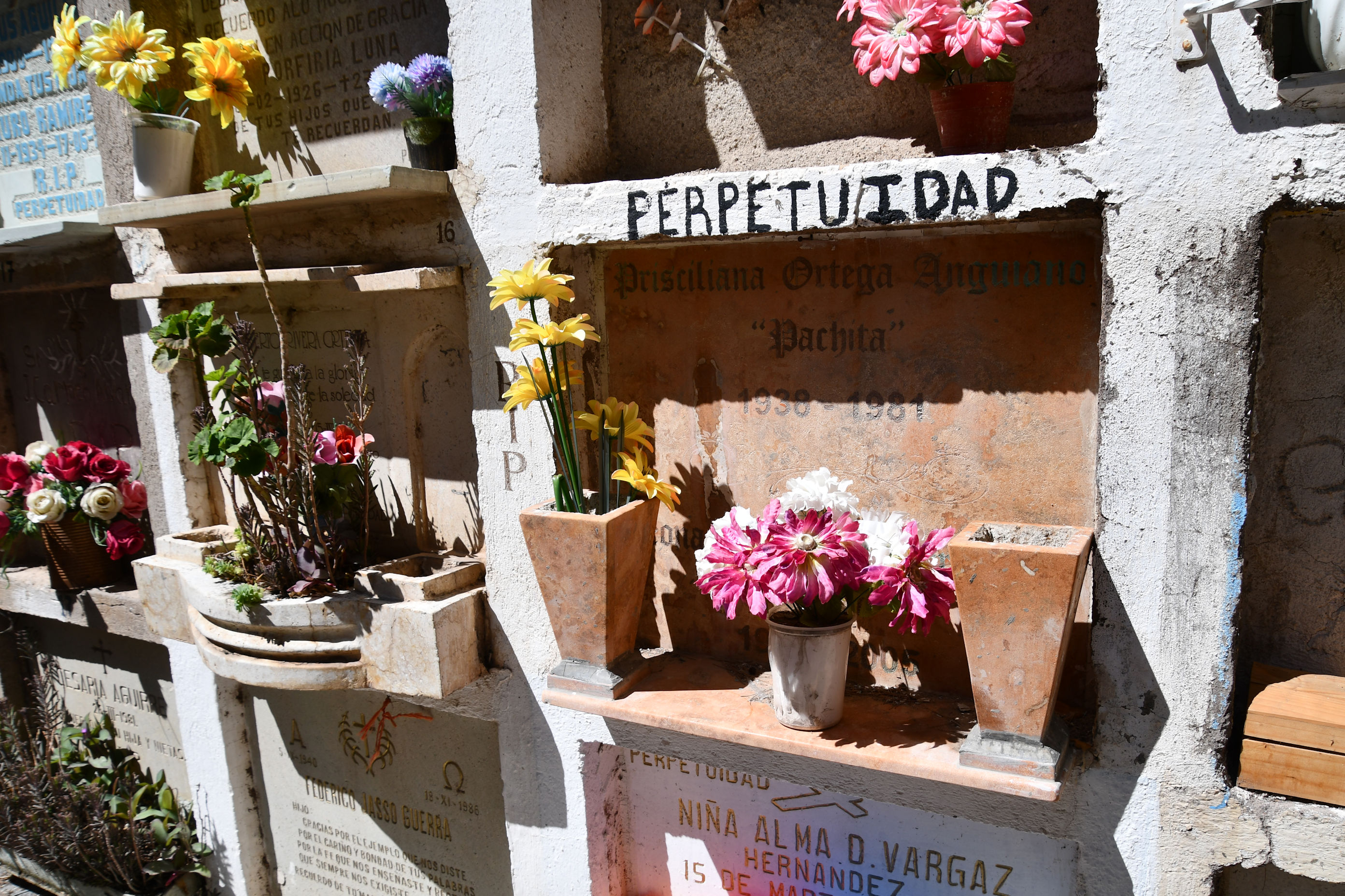 Pedro knew the way and we followed him, through what I might describe as open air “rooms” made from walls of graves, and rows of graves standing tall and solemn, like banks of tomes in a research library. We walked down steps and through openings like doorways, and to the right, and left, finding new rooms filled with the dead, until we came to the place.