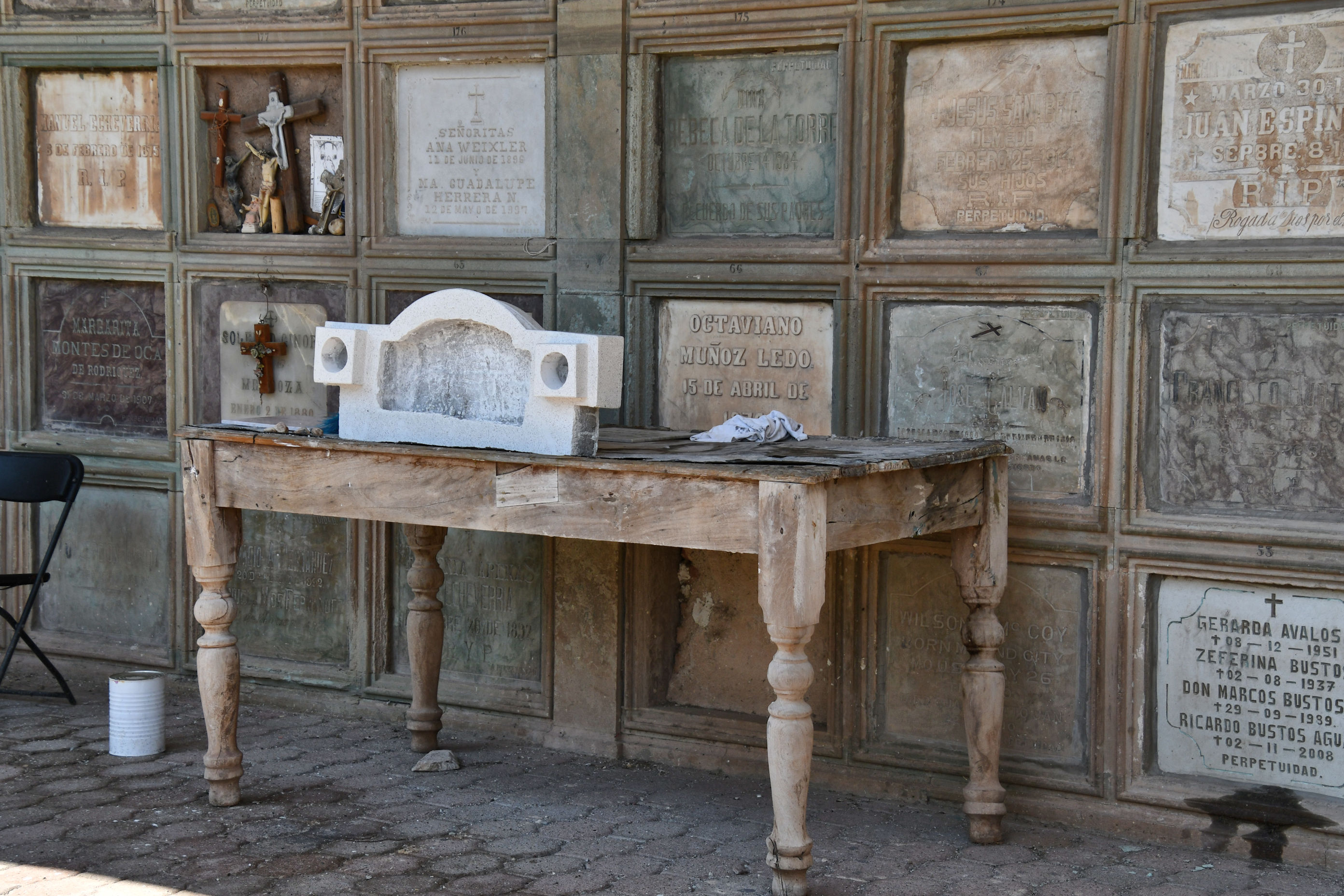 “This is to hold the coffins,” he explained. “It’s the family’s last chance to see the body. Steps are placed near the table so they can climb up and look down into the coffin.” He said the table, La Mesa de los Requerdos (Table of Memories), is famous in the town, and he was disappointed to see it in such disrepair. It looked as if it was being used as a work table or for storage of discarded items.