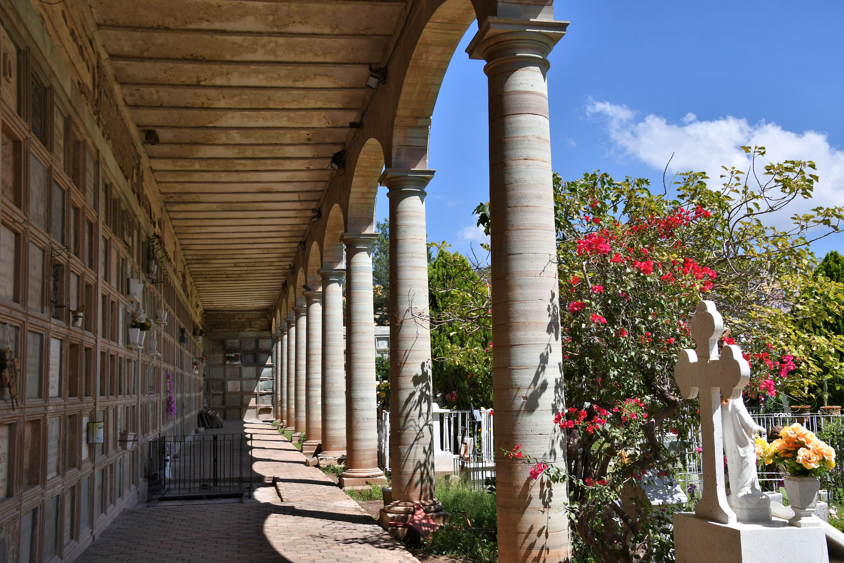 Then we arrived at the gates of the cemetery, the Municipal Pantheon of Saint Paula. The land for the cemetery was donated with the stipulation that it be named after the mother of the man who donated the land. It’s original name was Panteón de Santa Eulalia, so I wonder if the mother’s name was Eulalia or Paula. The grounds encompass 42 acres (17 hectares) and is completely surrounded by a high wall containing coffins. It holds close to 11,000 tombs.