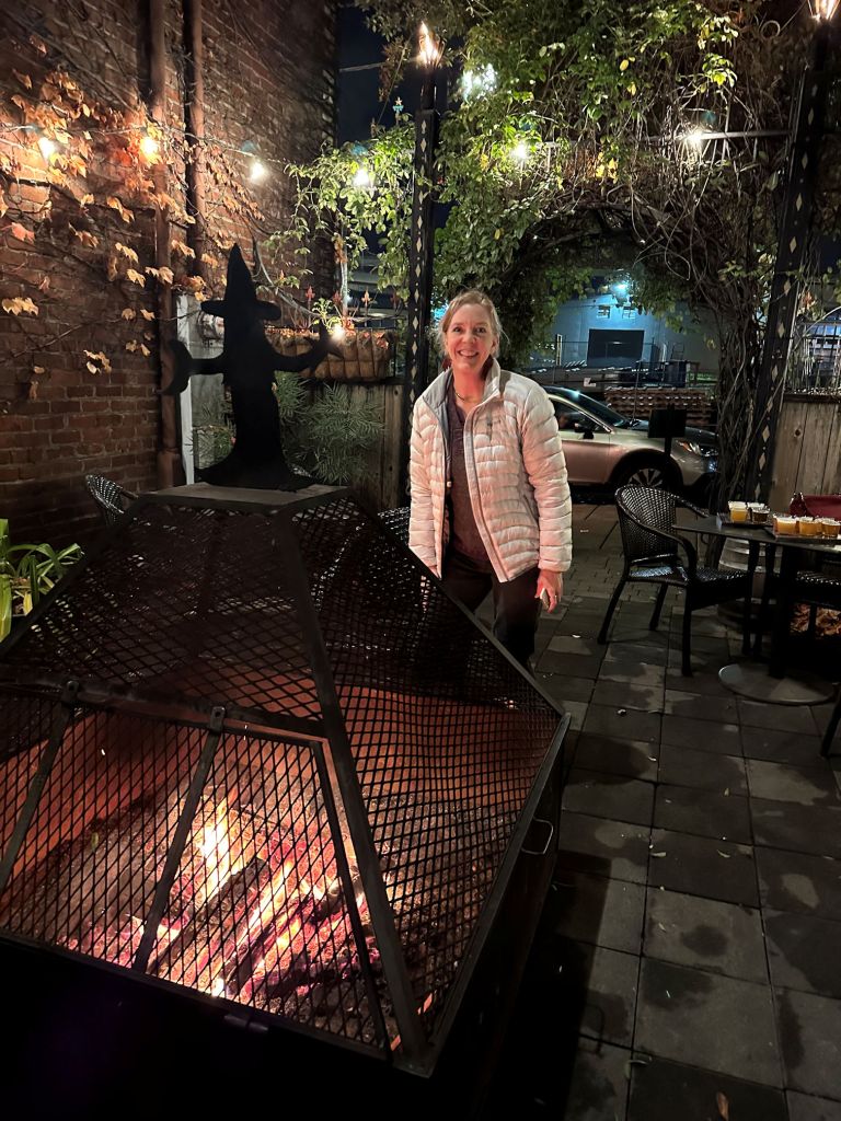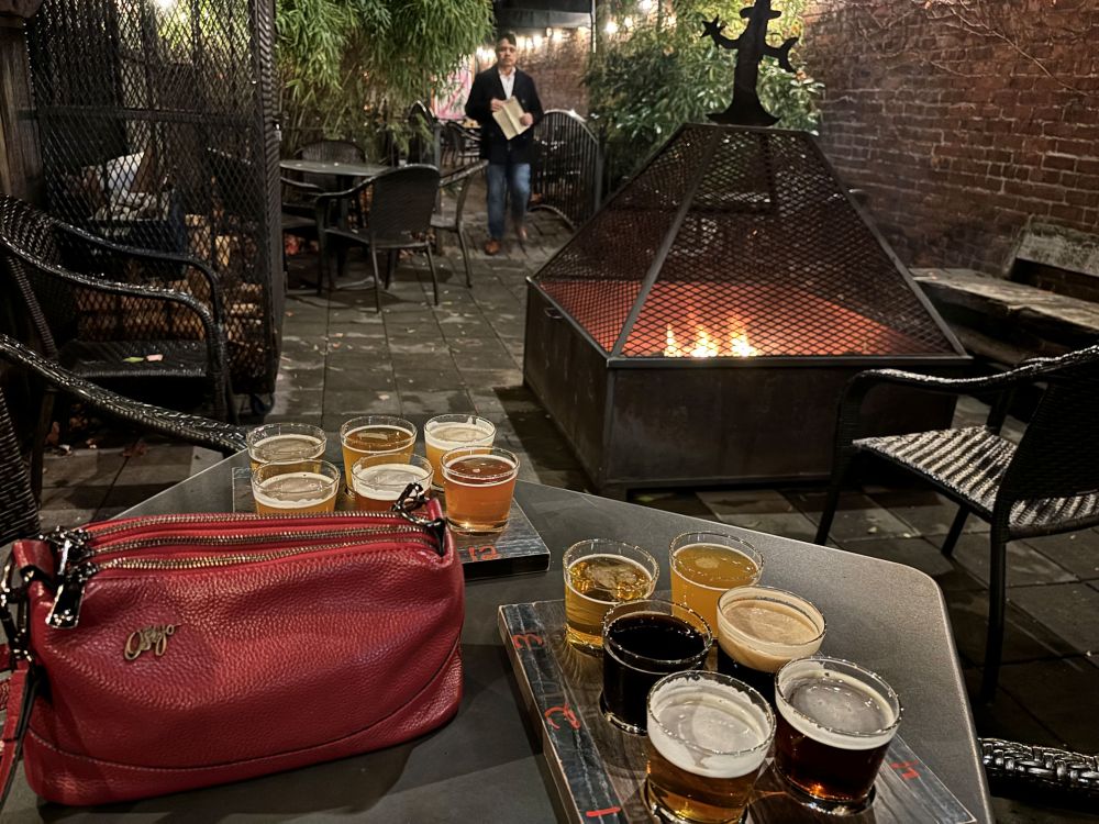 After checking out the room, we headed back downstairs, hungry and thirsty. We explained that we wanted to try everything on the menu, so the bartender hooked us up with two six-sample flights. In that way we were able to try 12 different beers which, believe it or not was not every craft brew they had. But nearly. And that’s not counting the ciders, which we could have had another flight of, but we didn’t. The evening was pleasant and there was a fire outside, so we headed out there for our drinks and dinner.