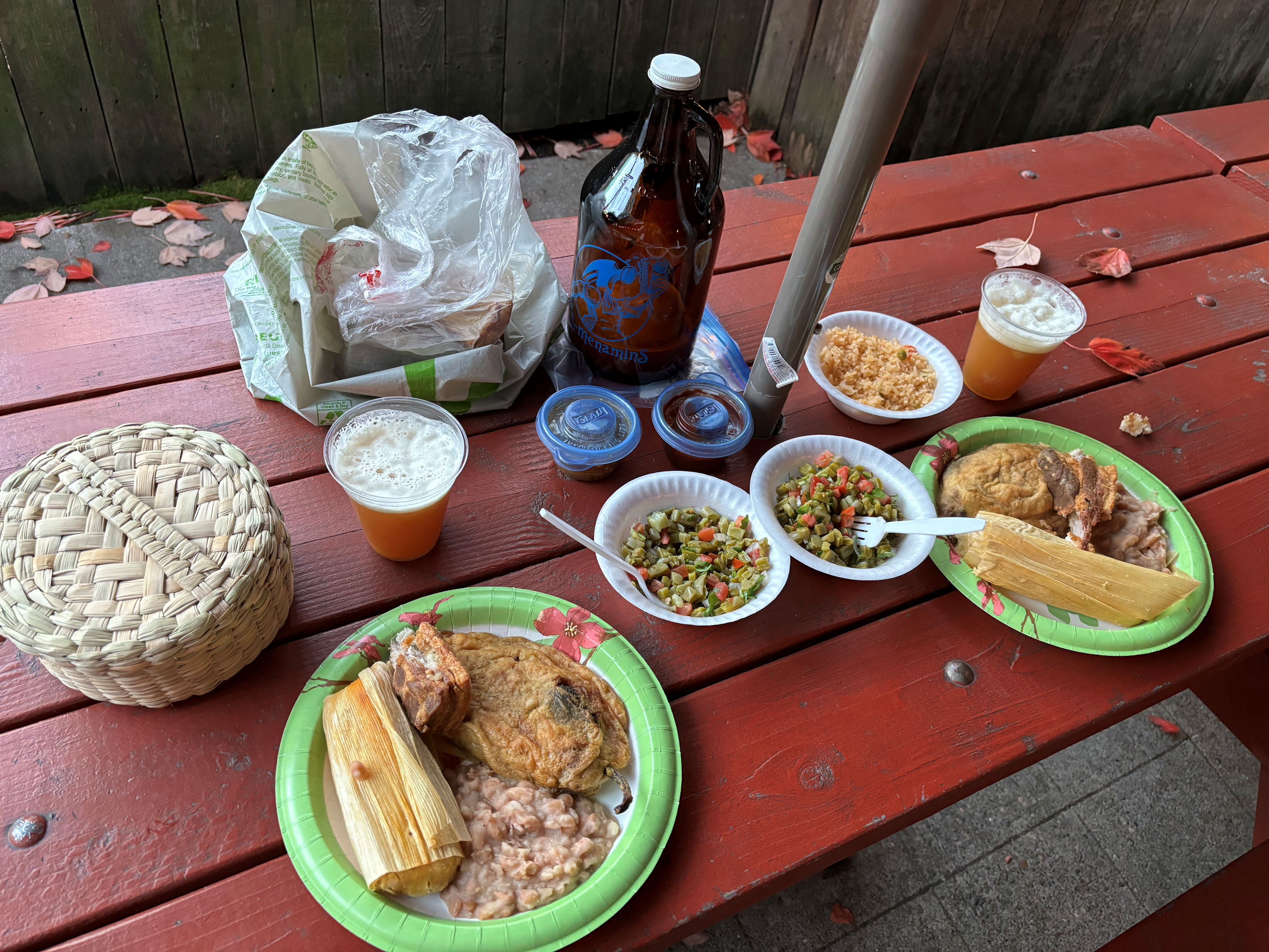 After walking over six miles in our explorations, we were ready to begin Thanksgiving feast preparations. Pedro and I eat a tamale feast every year. Wednesday we had visited his favourite authentic Mexican place and picked up a bunch of tamales, some chile relleno, fresh nopales (cactus) salad, Chicharrónes (fried pork rind), rice, beans, salsa verde, chipotle sauce, and corn tortillas. We plugged in the second-hand microwave and got to work heating all the food, one item at a time, since the oven was tiny. We grabbed two plastic cups and paper plates and some plastic cutlery and the growler filled with a hazy IPA. We could stay in the room and eat on the bed – awkward – or haul it all downstairs and use the patio we had used the night before. We voted for the patio.